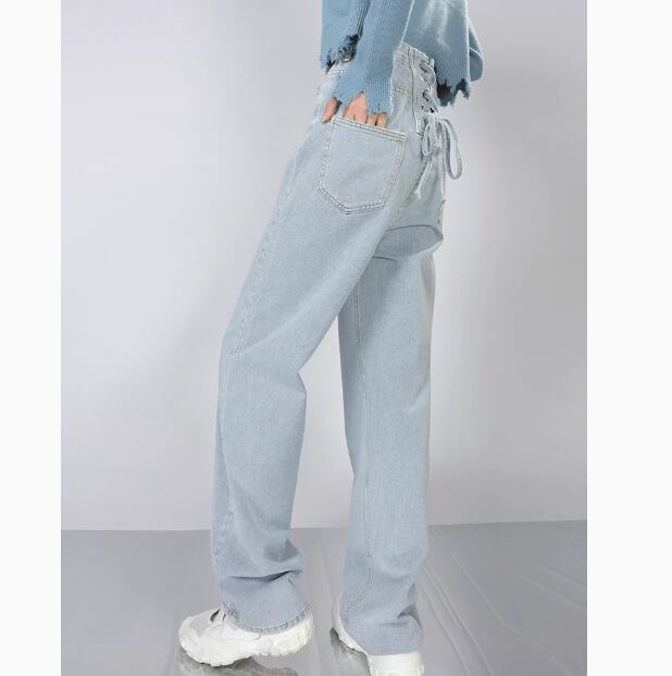 メンズっぽいワイドデニムに可愛いレースアップがバックに付いているパンツです!
