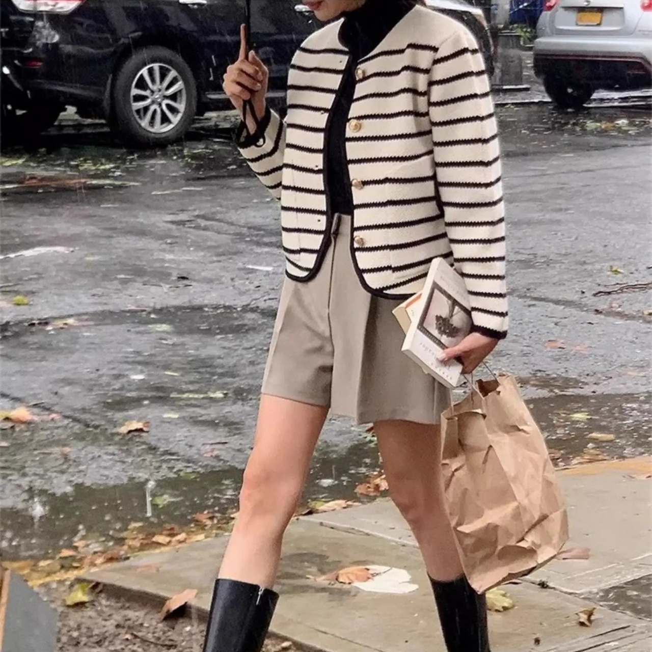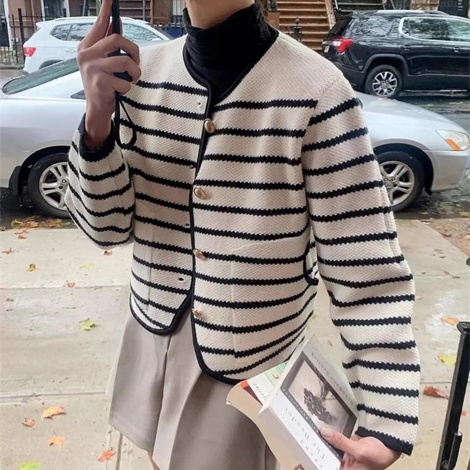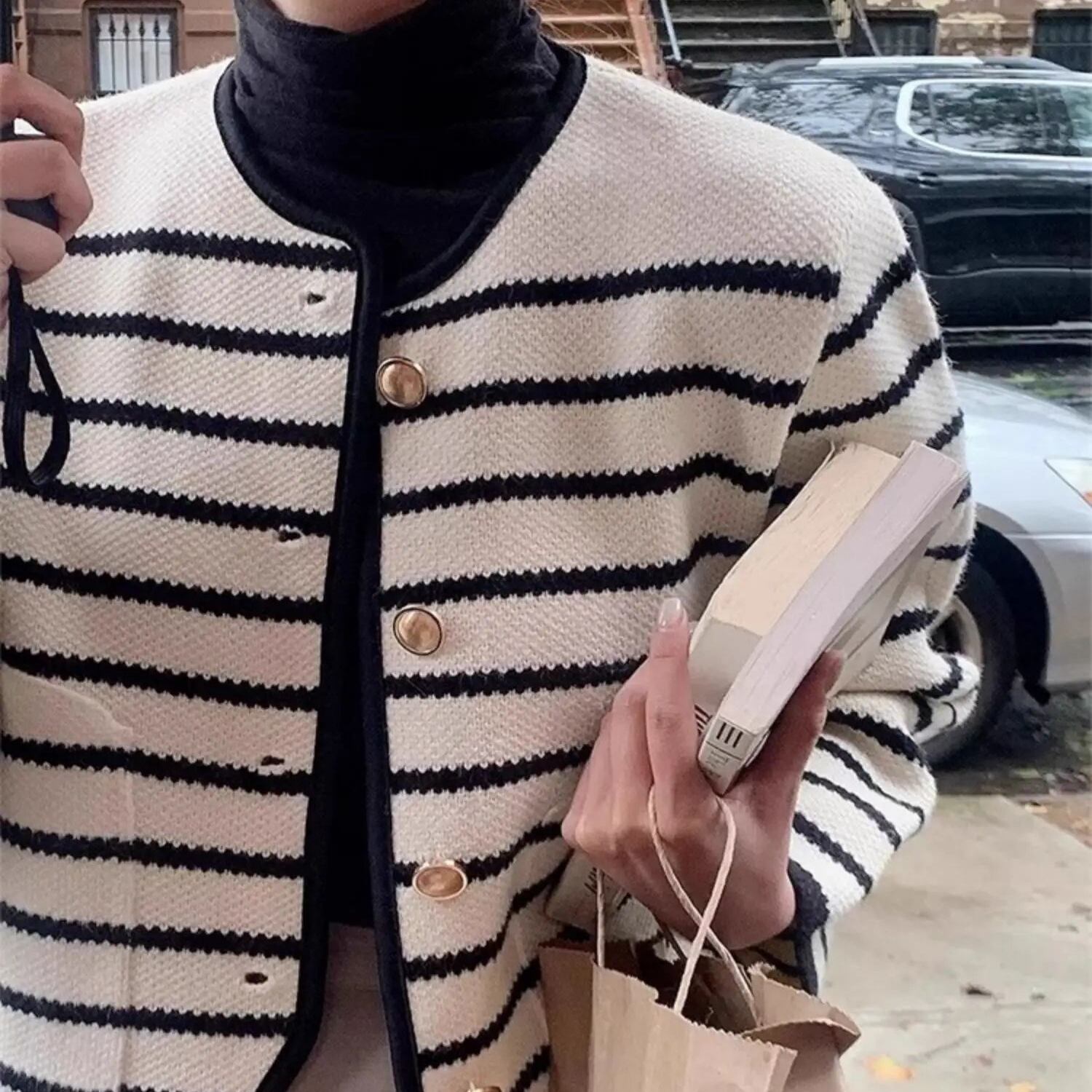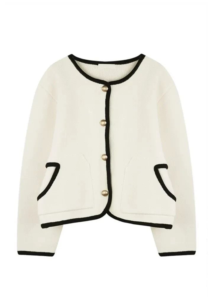 滑らかなニットの質感がフェミニンで上品な質感のノーカラージャケットカーディガンです。ころんとした金ボタンとシングルブレストで、大人可愛い雰囲気を演出します。アクセントになったパイピングラインデザインがクラシカルな雰囲気を演出し普段使いにぴったり。どんなスタイルにも合わせやすく、お洒落な一枚です。