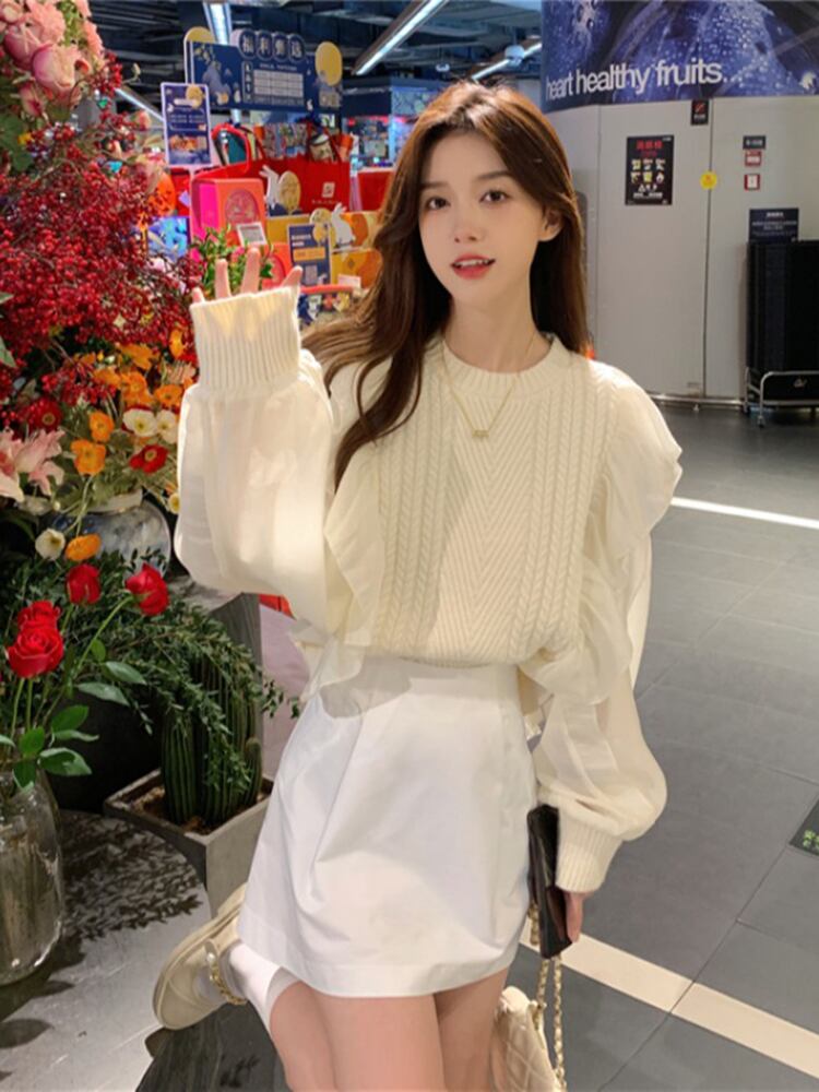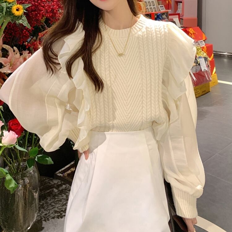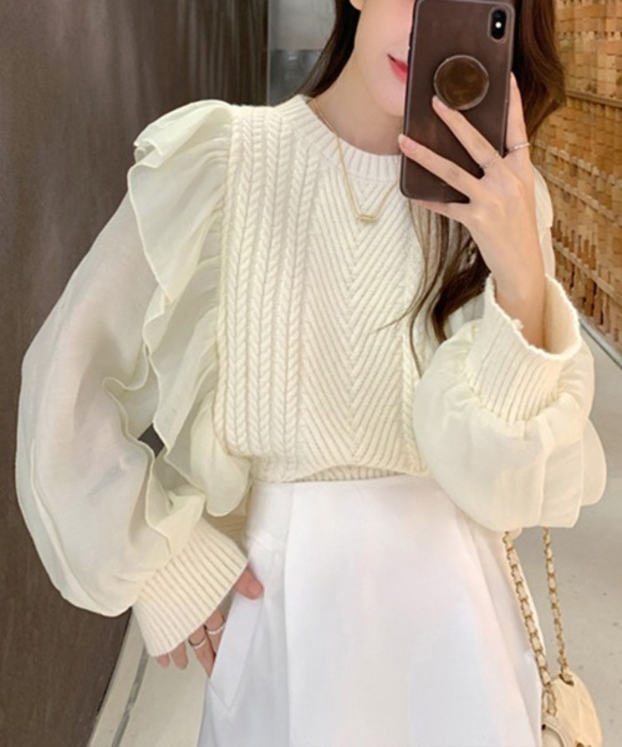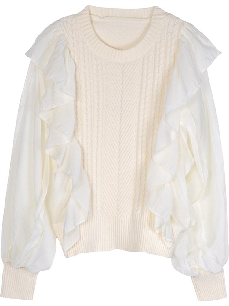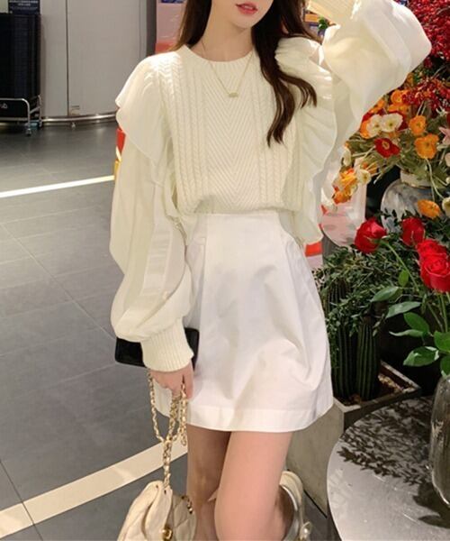 セーター ニット トップス クルーネック ショート丈 ドッキング 切り替え ケーブル編み フリル リブ S M L XL 長袖 大人可愛い シンプル 上品 お洒落 こなれ感 無地 10代 20代 30代 40代 オフィス ビジネス OL 通勤 学生 通学 デート お出かけ 休日 イベント デイリー 普段使い ホワイト ブラック | GVON~ファッションショップ~