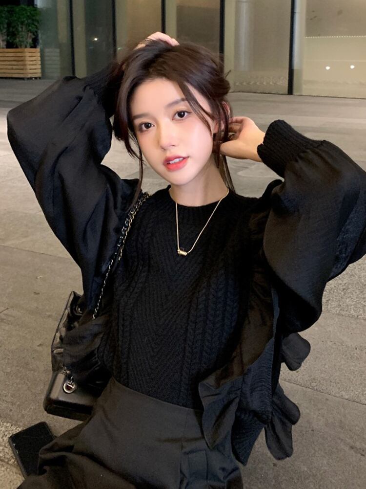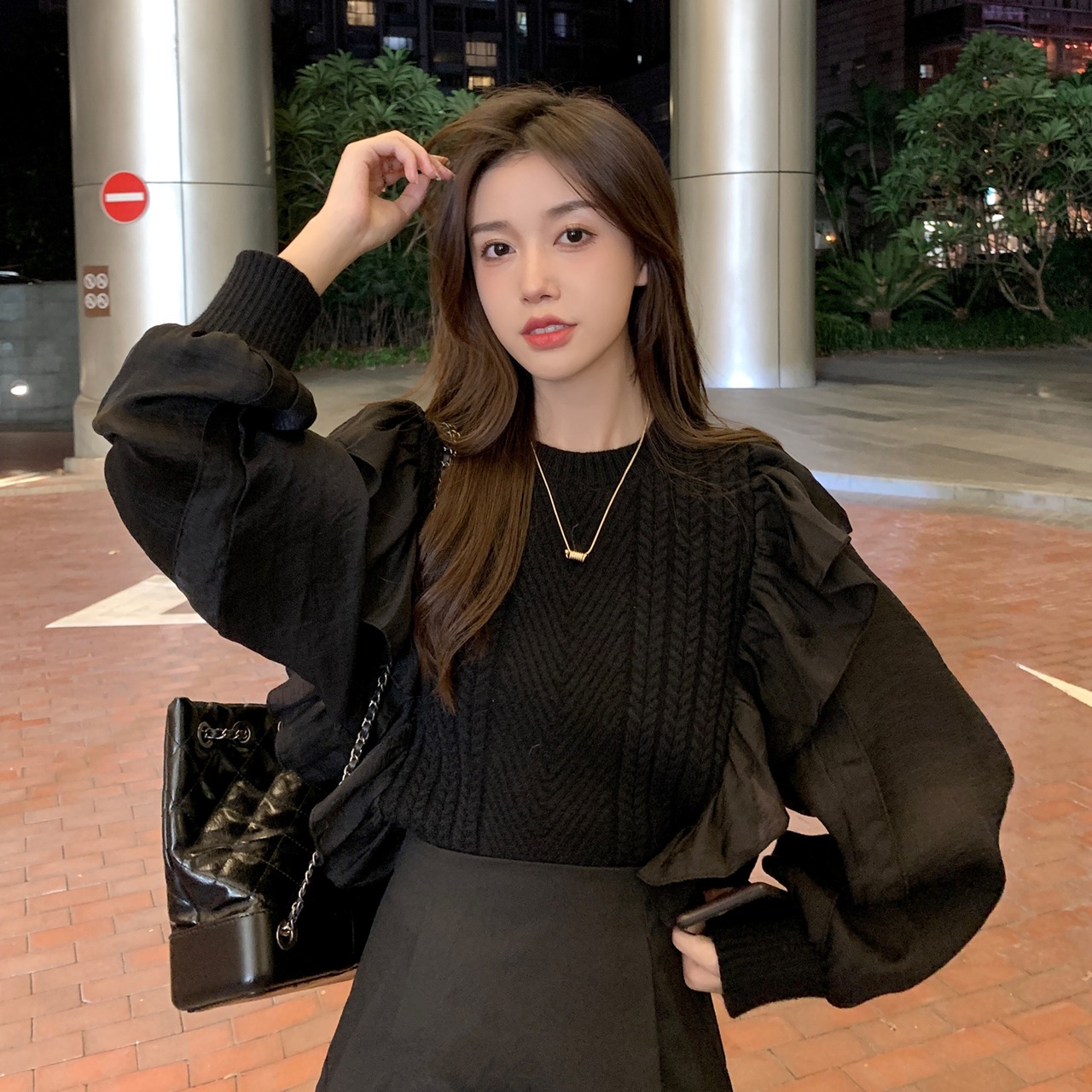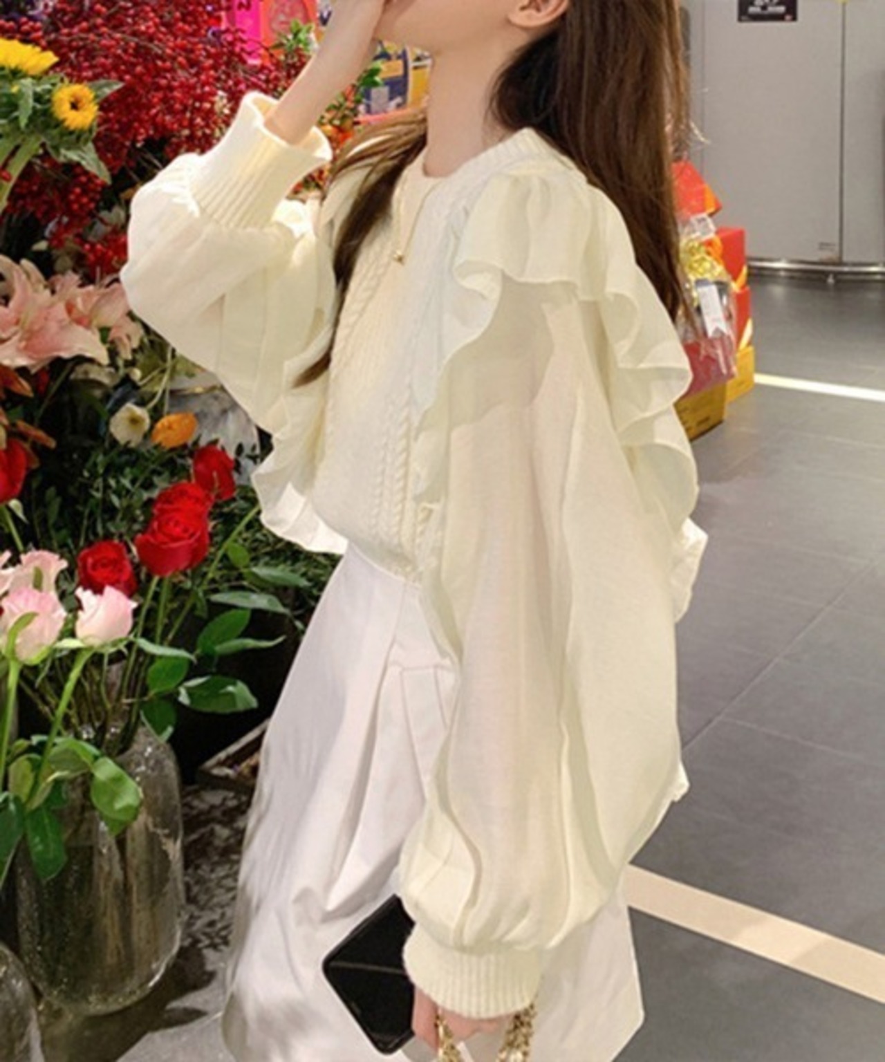 セーター ニット トップス クルーネック ショート丈 ドッキング 切り替え ケーブル編み フリル リブ S M L XL 長袖 大人可愛い シンプル 上品 お洒落 こなれ感 無地 10代 20代 30代 40代 オフィス ビジネス OL 通勤 学生 通学 デート お出かけ 休日 イベント デイリー 普段使い ホワイト ブラック | GVON~ファッションショップ~