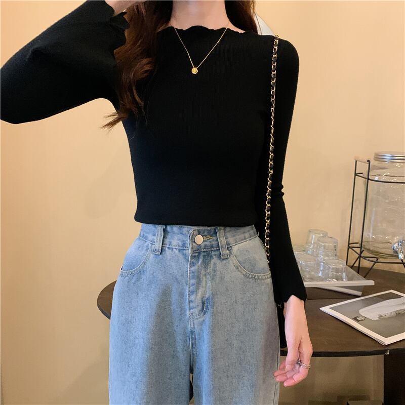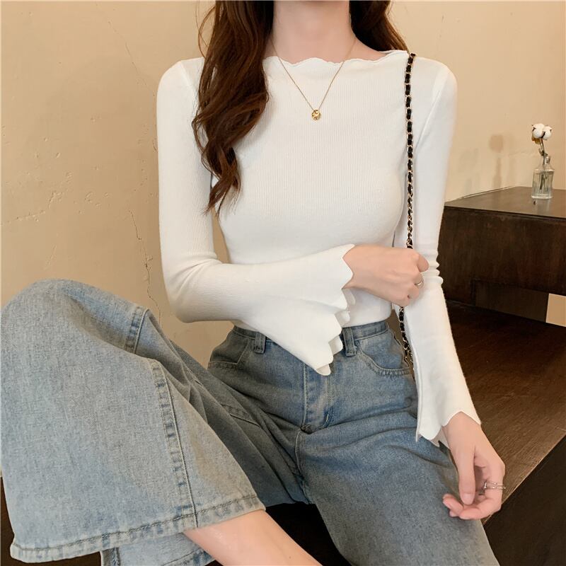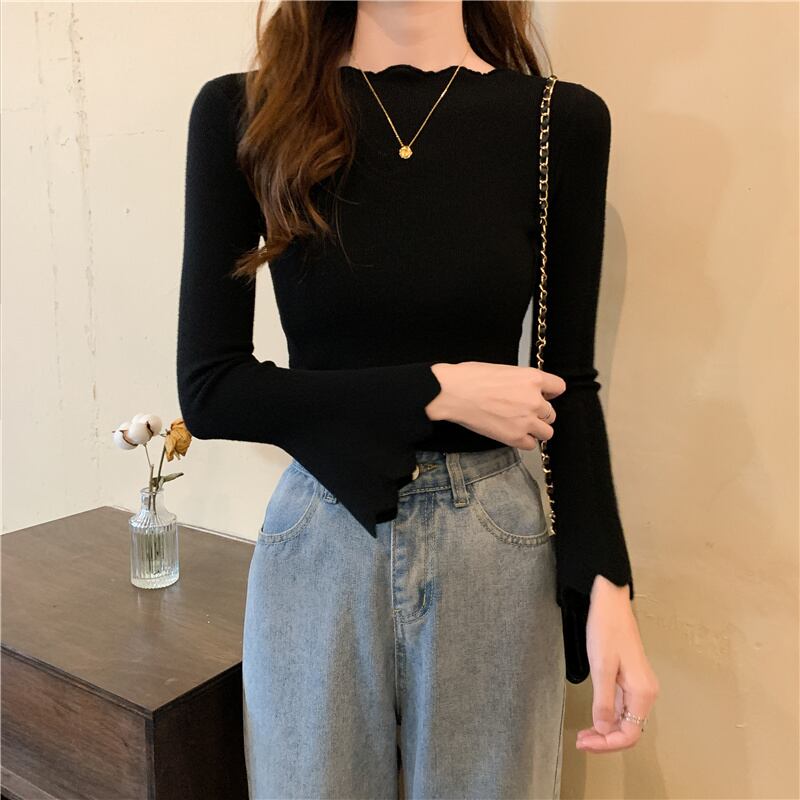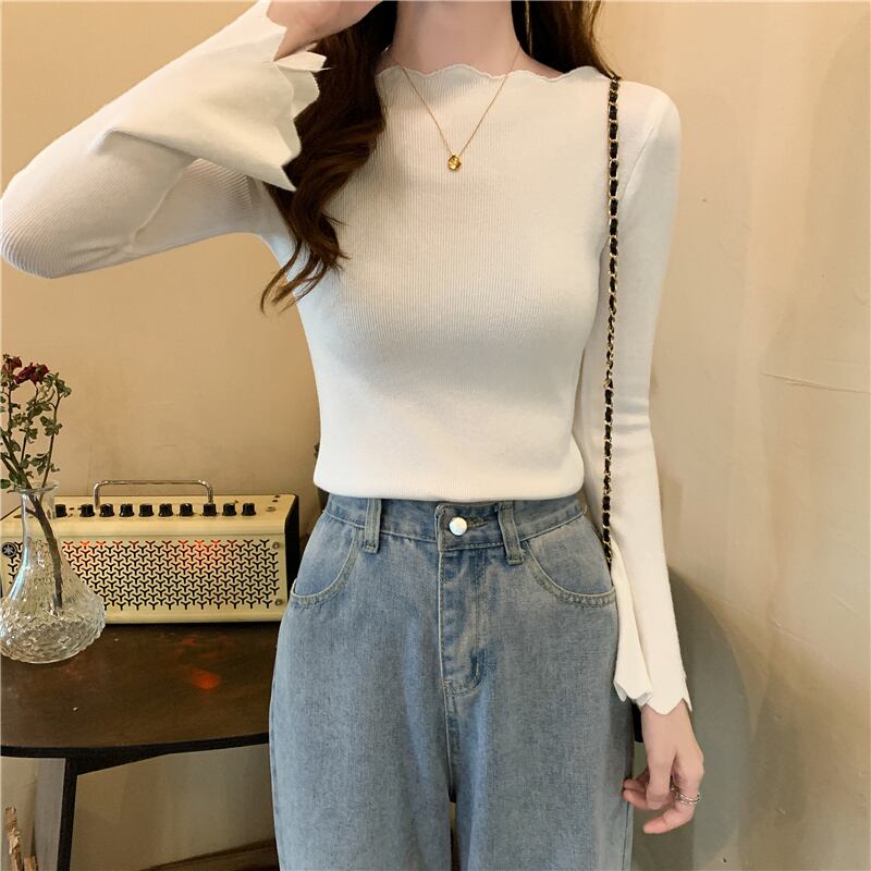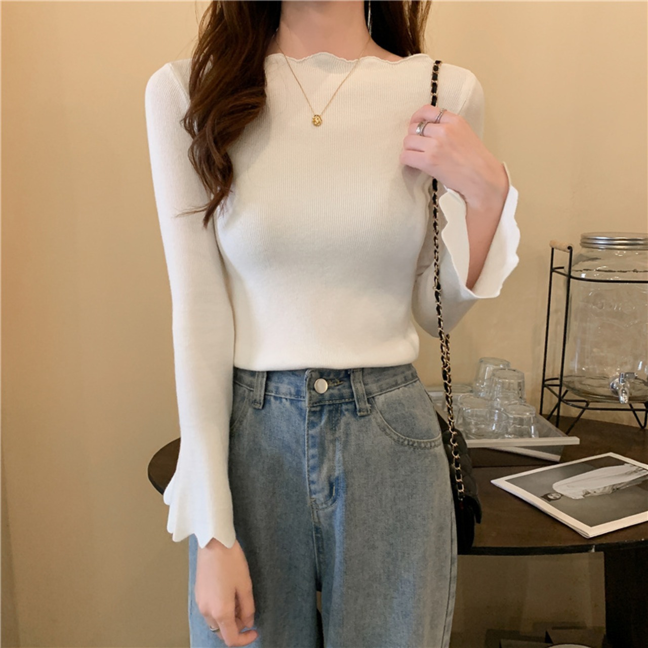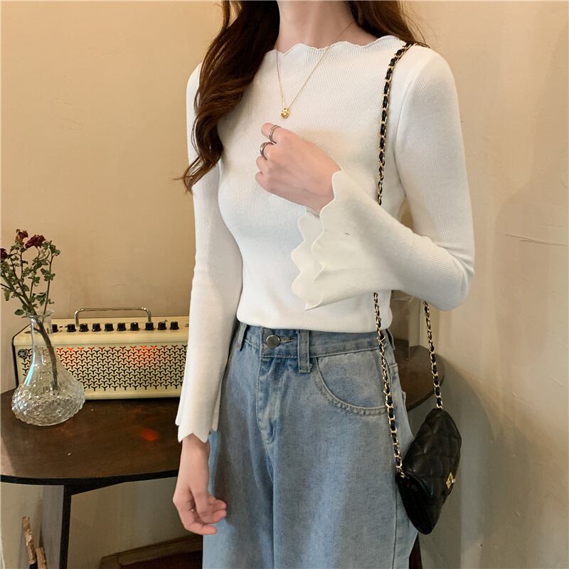リブ編みのセーターに、襟と袖のスカラップ加工が可愛らしいトップスです。ボートネックで首元がスッキリと見えて、タイトなシルエットなのでボリュームのあるボトムとの相性も抜群。