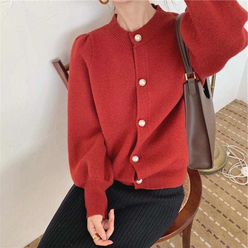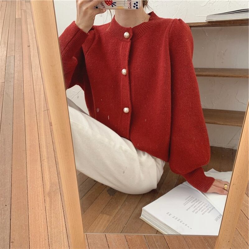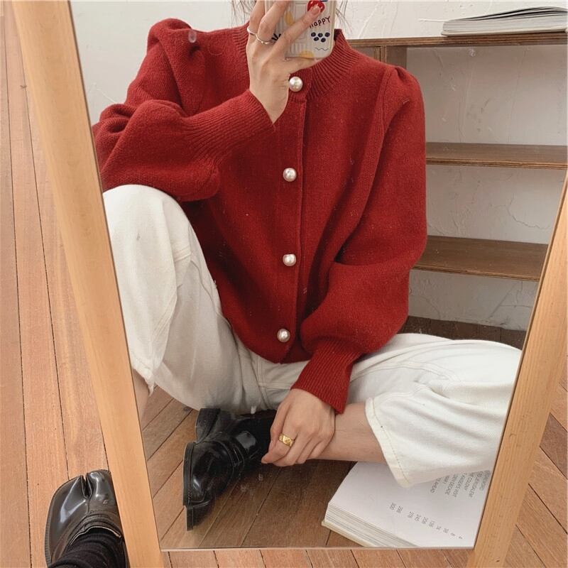 セーター カーディガン トップス アウター クルーネック ニット パール ボタン パワーショルダー フレアスリーブ ショート丈 長袖 大人可愛い シンプル 上品 お洒落 こなれ感 無地 10代 20代 30代 40代 オフィス ビジネス OL 通勤 学生 通学 デート お出かけ 休日 イベント デイリー 普段使い ワンサイズ レッド | GVON~ファッションショップ~