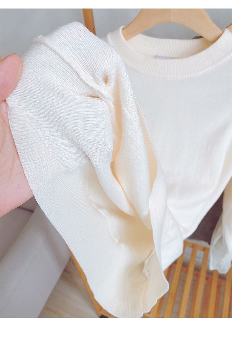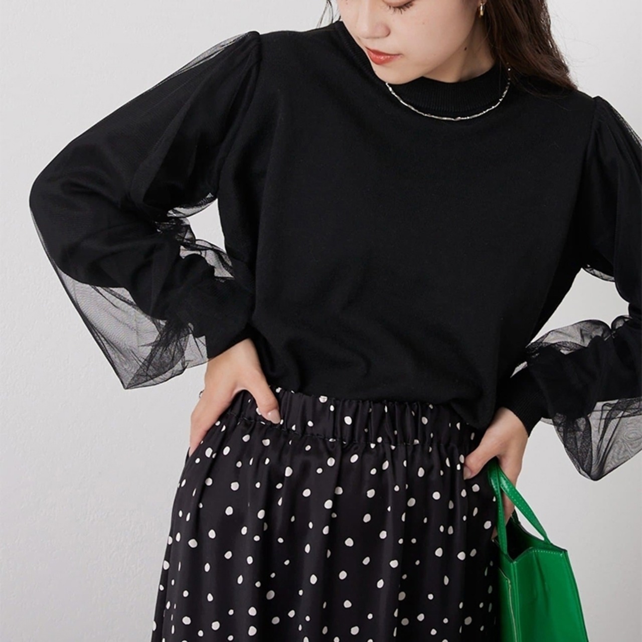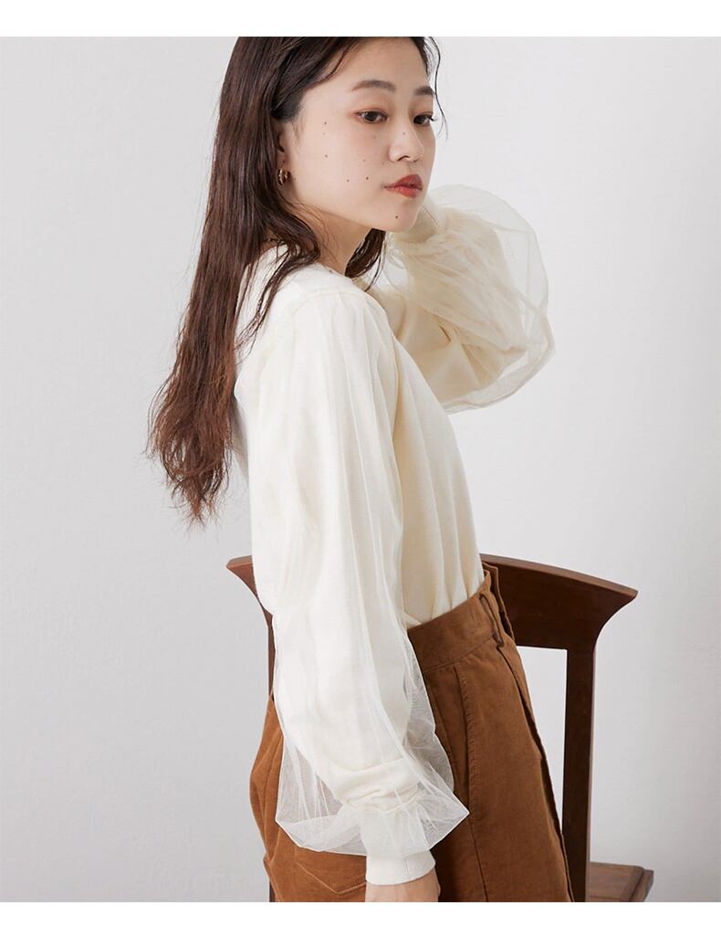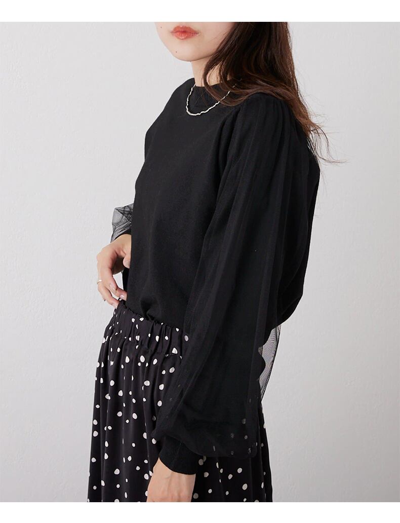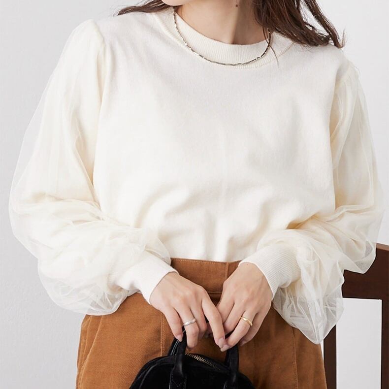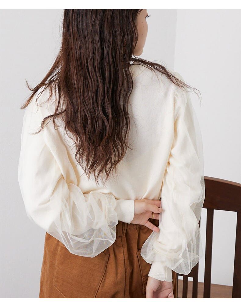 華やかな雰囲気漂うチュールレイヤード袖が存在感抜群なセーターニットです。