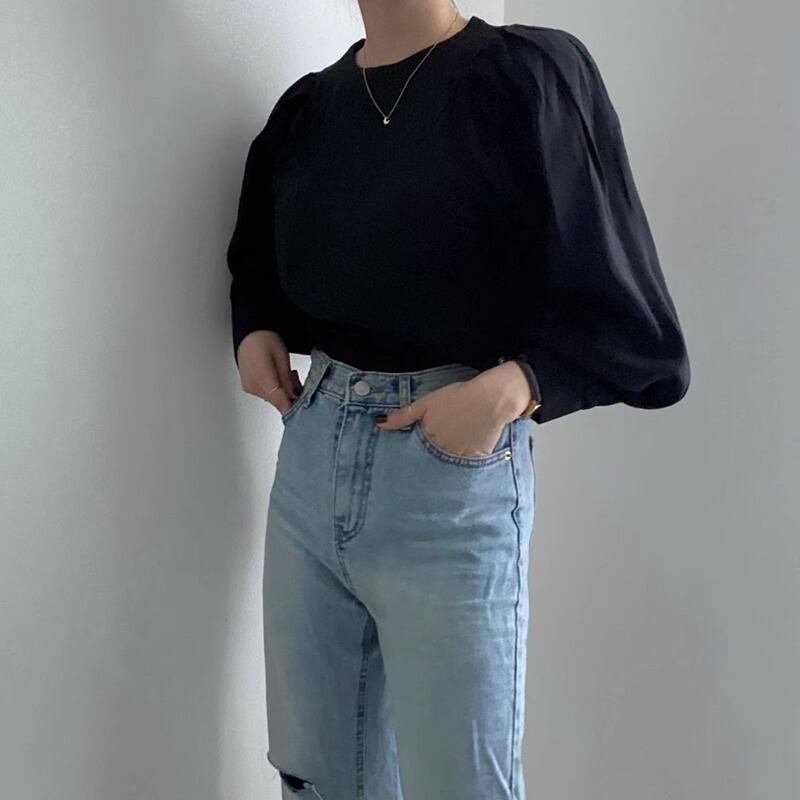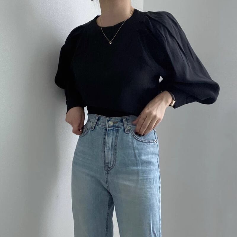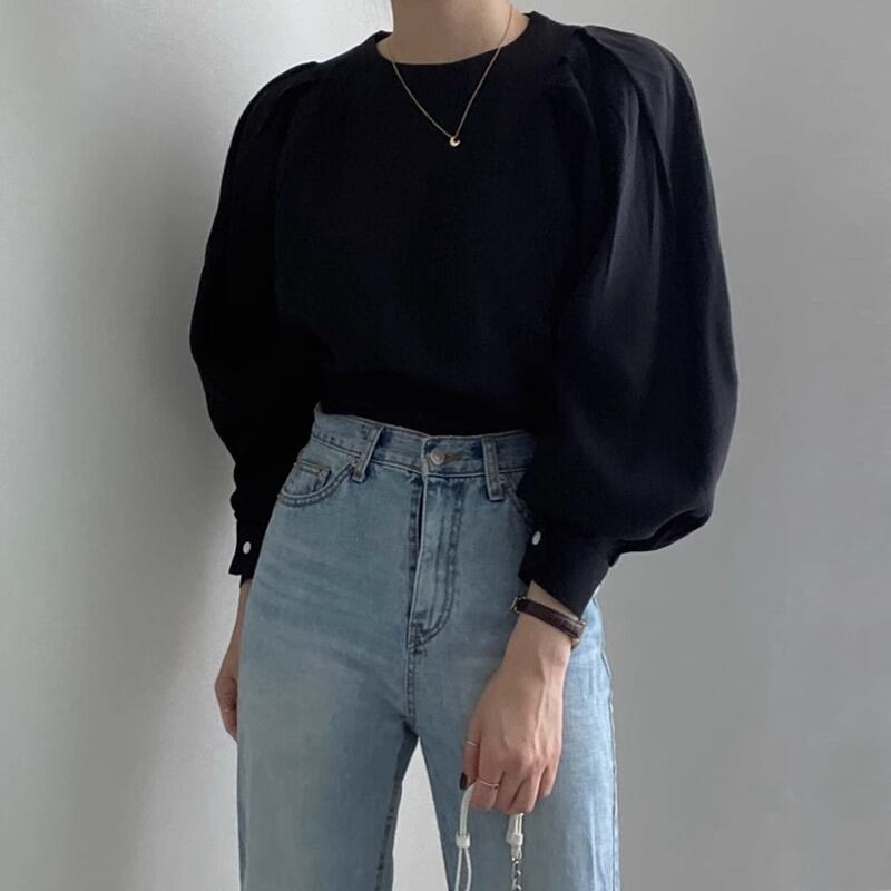 シックなモノトーン系の色合いと、すっきりしたクルーネックとパフスリーブが目を引くおしゃれで女性らしい一枚です。襟元の一粒パールがジュエリーのように上品で、10代から40代まで幅広い年齢層におすすめな着こなしアイテムです。どんなスタイルにも相性抜群で、着回し力抜群な一着です。