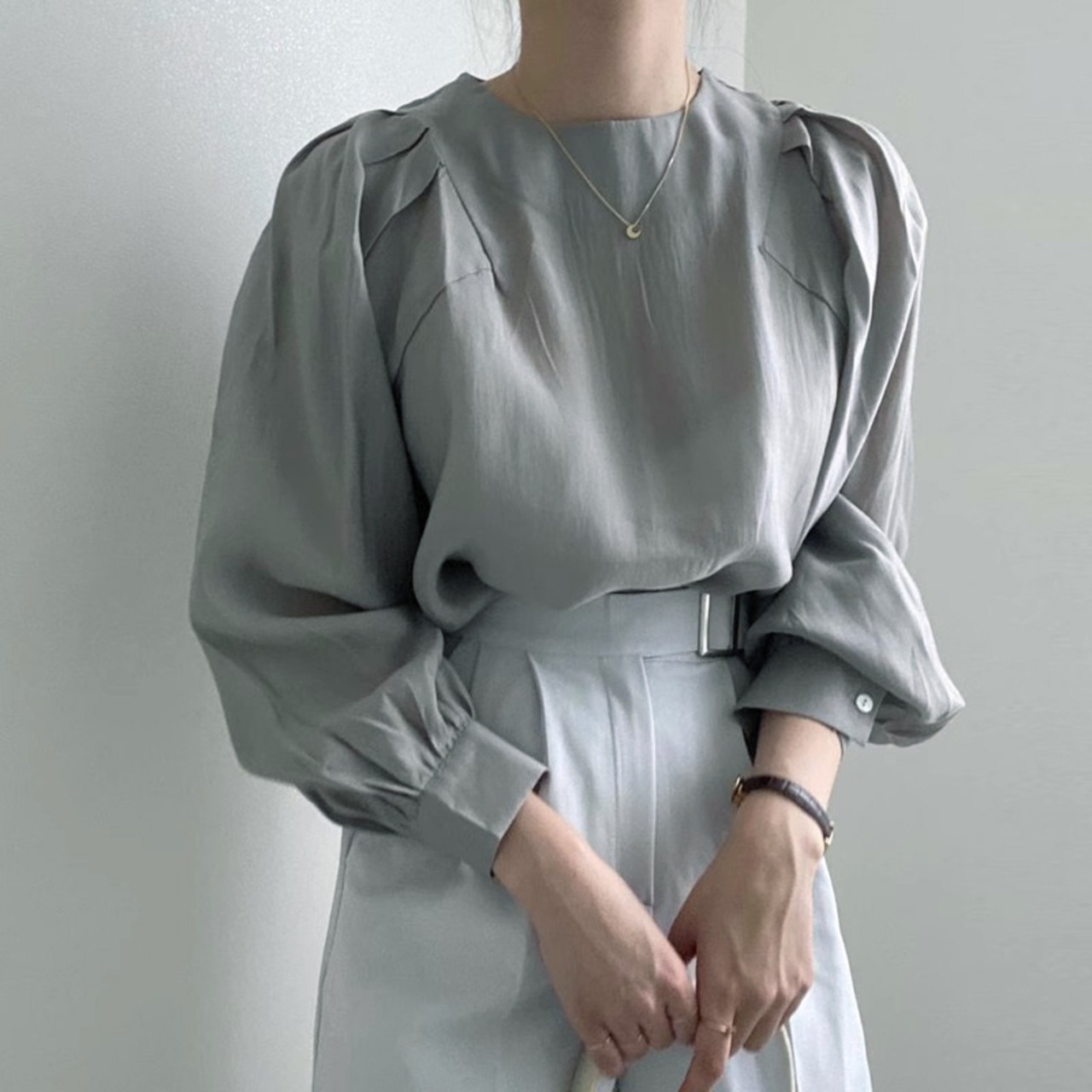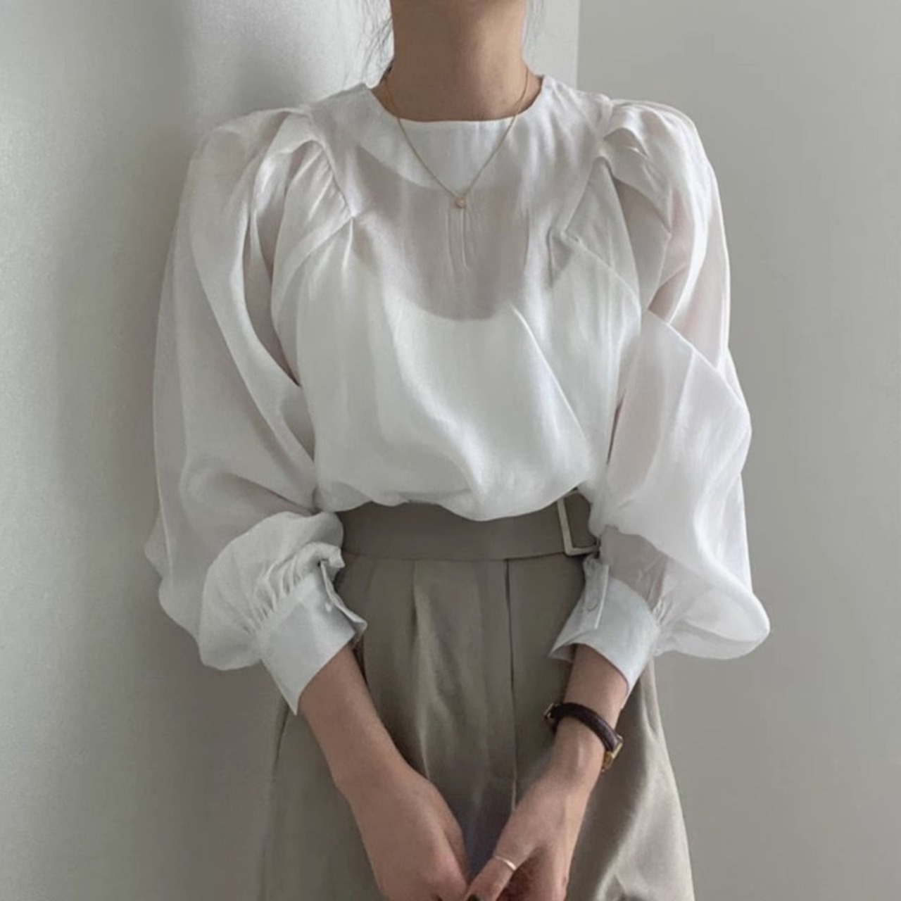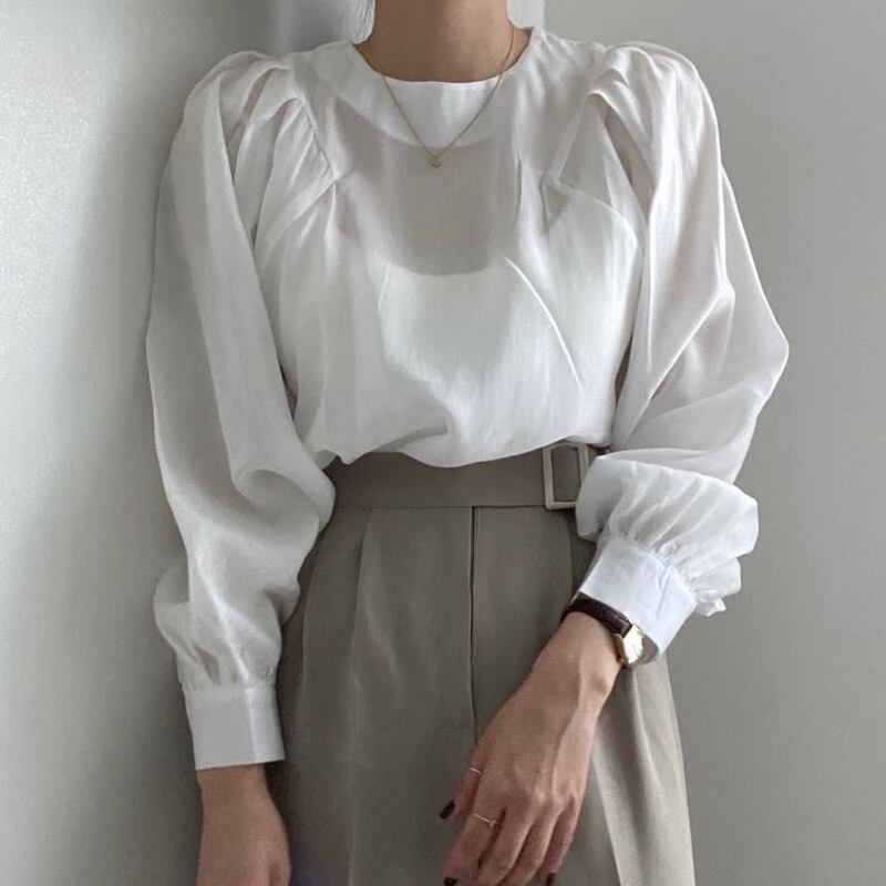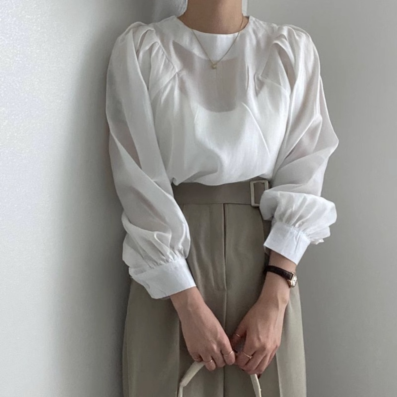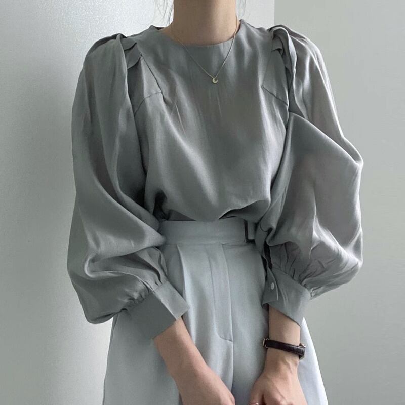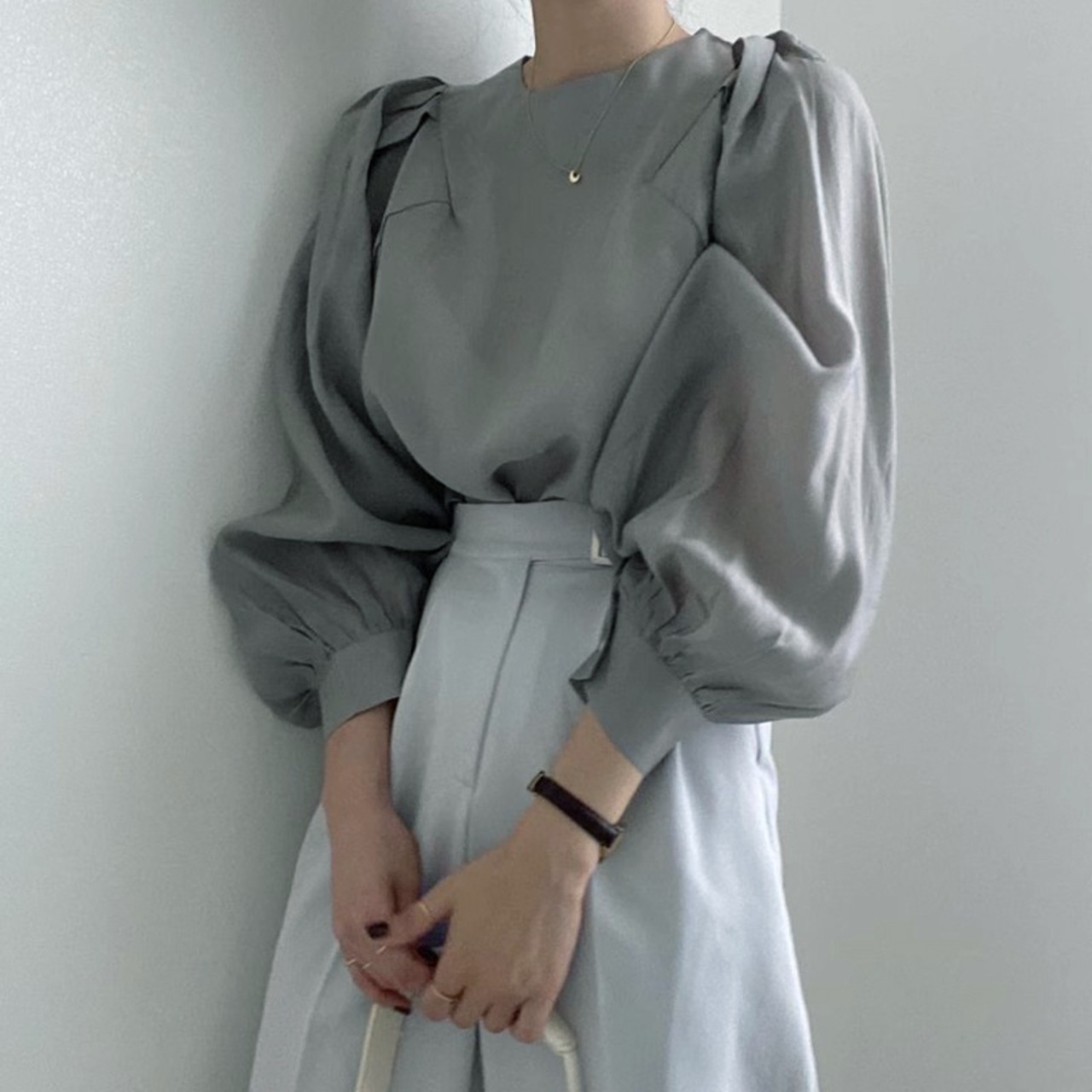 ブラウス トップス シフォン クルーネック パフスリーブ プルオーバー タック パワーショルダー プリーツ 長袖 大人可愛い シンプル 上品 お洒落 こなれ感 無地 10代 20代 30代 40代 オフィス ビジネス OL 通勤 学生 通学 デート お出かけ 休日 イベント デイリー 普段使い S M L XL 2XL グレー ホワイト ブラック | GVON~ファッションショップ~