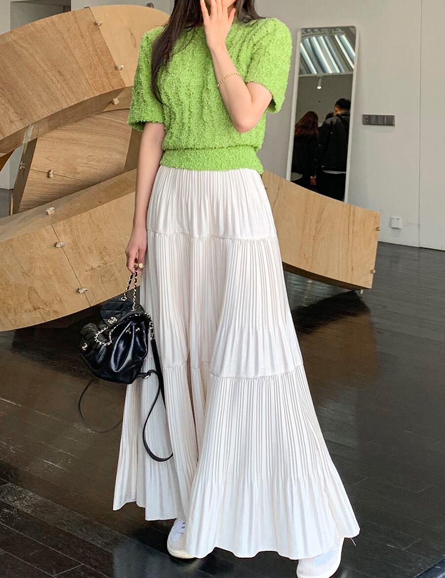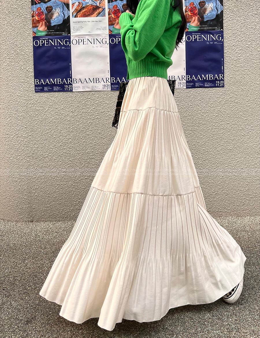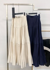 ティアードプリーツスカートは、ロング丈でおしゃれできれいめなAラインのフレアスカートです。春夏秋の季節にぴったりの薄手の素材で、シンプルで無地なデザインがさまざまなトップスとスタイリングしやすいのが特徴です。ウエストはゴム仕様で着心地も抜群です。