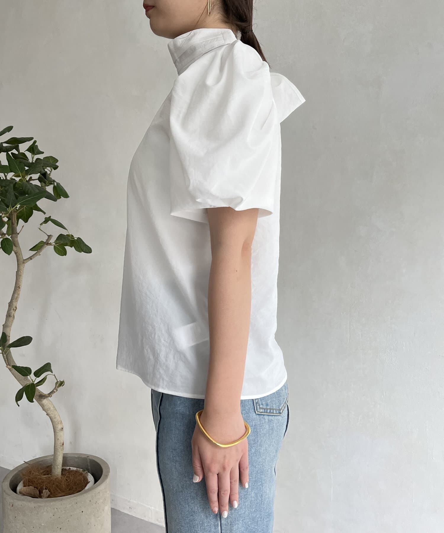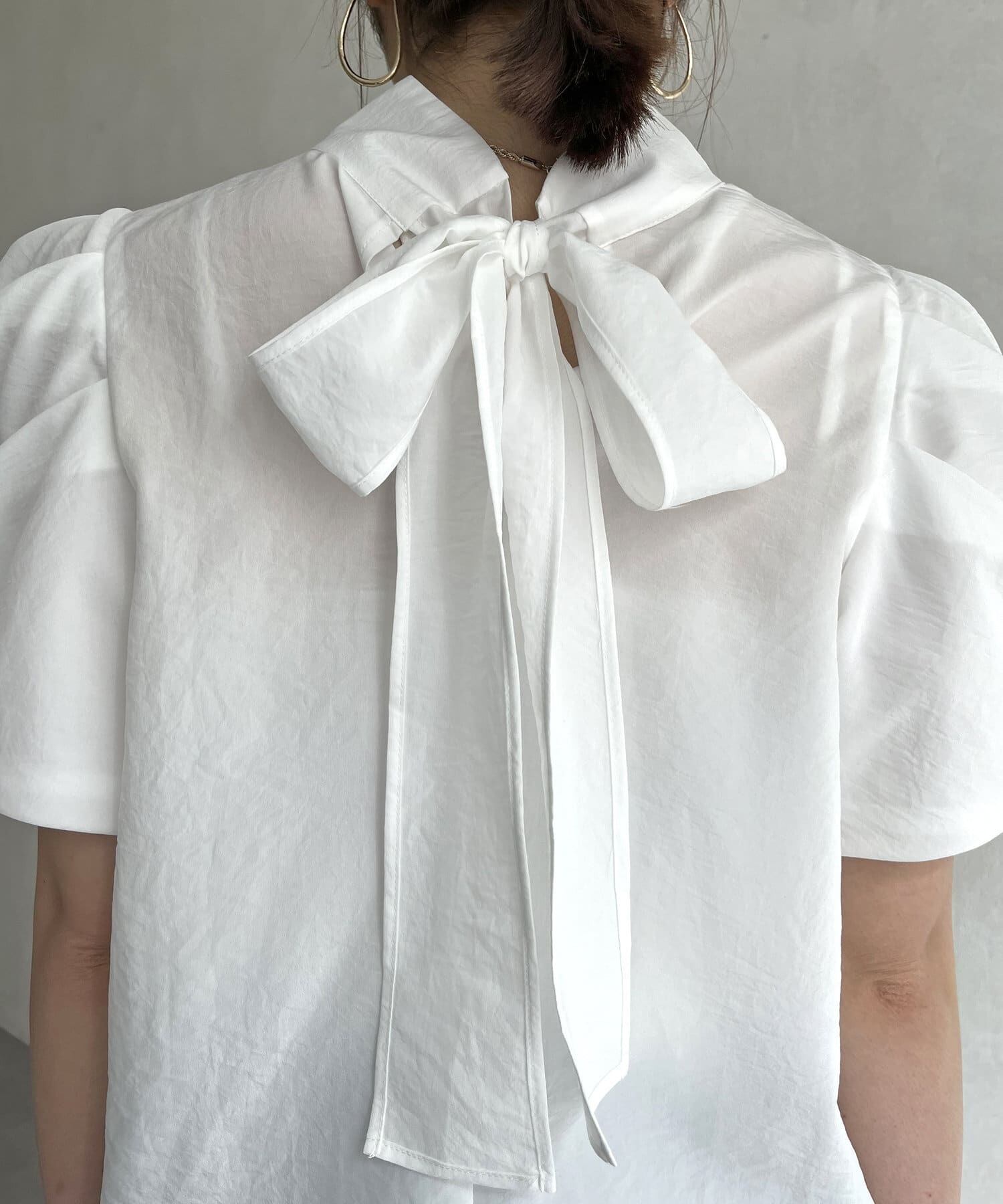 ブラウス トップス スタンドカラー 半袖 透け感 タック ボウタイ リボン 前後2WAY パフスリーブ プルオーバー レトロ S M L XL 2XL ホワイト ブルー 大人可愛い シンプル 上品 お洒落 こなれ感 無地 10代 20代 30代 40代 オフィス ビジネス OL 通勤 学生 通学 デート お出かけ 休日 イベント デイリー 普段使い ホワイト ワンサイズ | GVON~ファッションショップ~