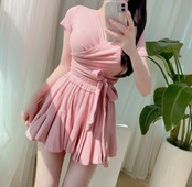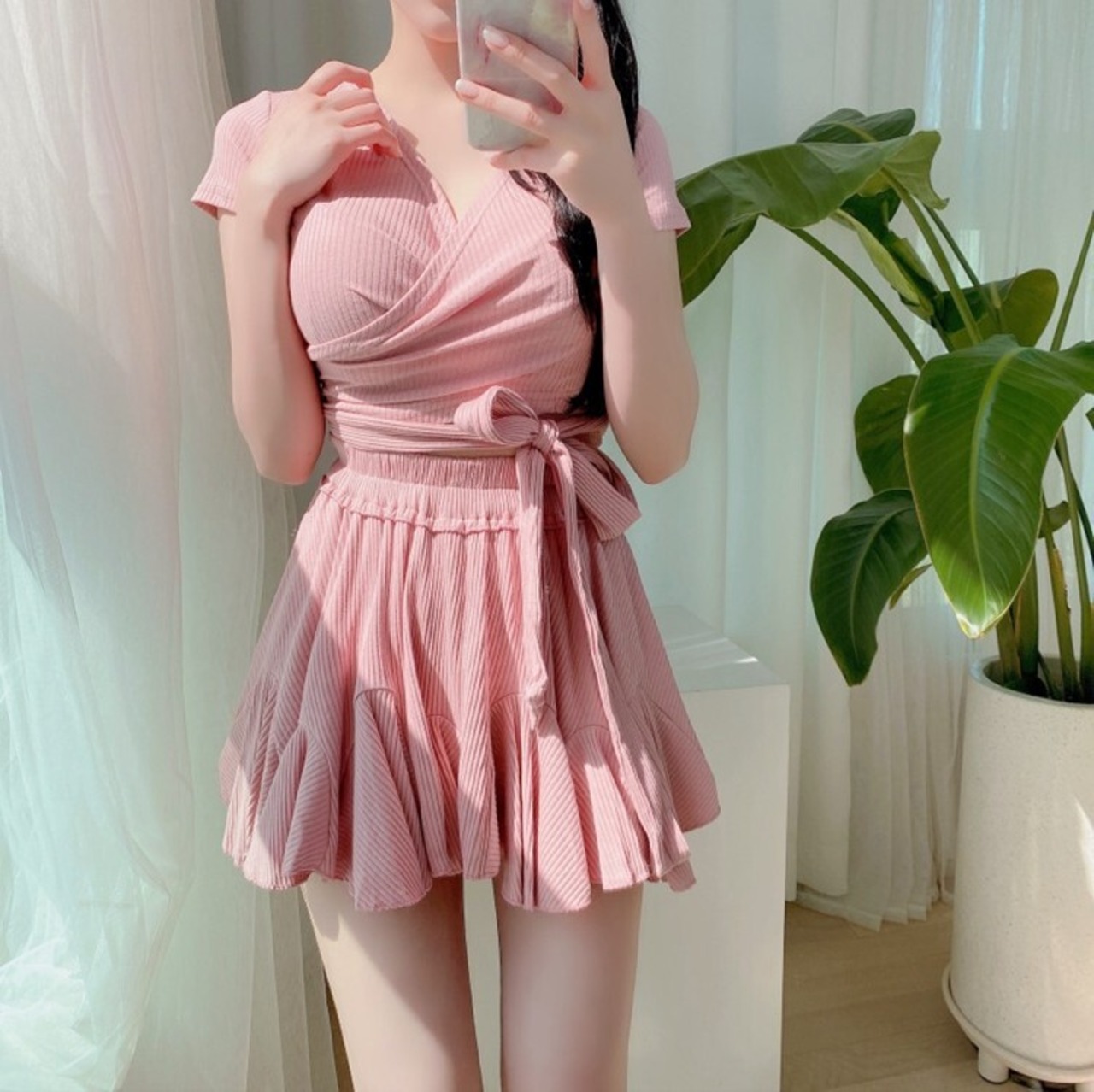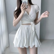 リボン留めカシュクールのくしゅっと絞ったシルエットが可愛い半袖トップスとスカートのセット水着です。