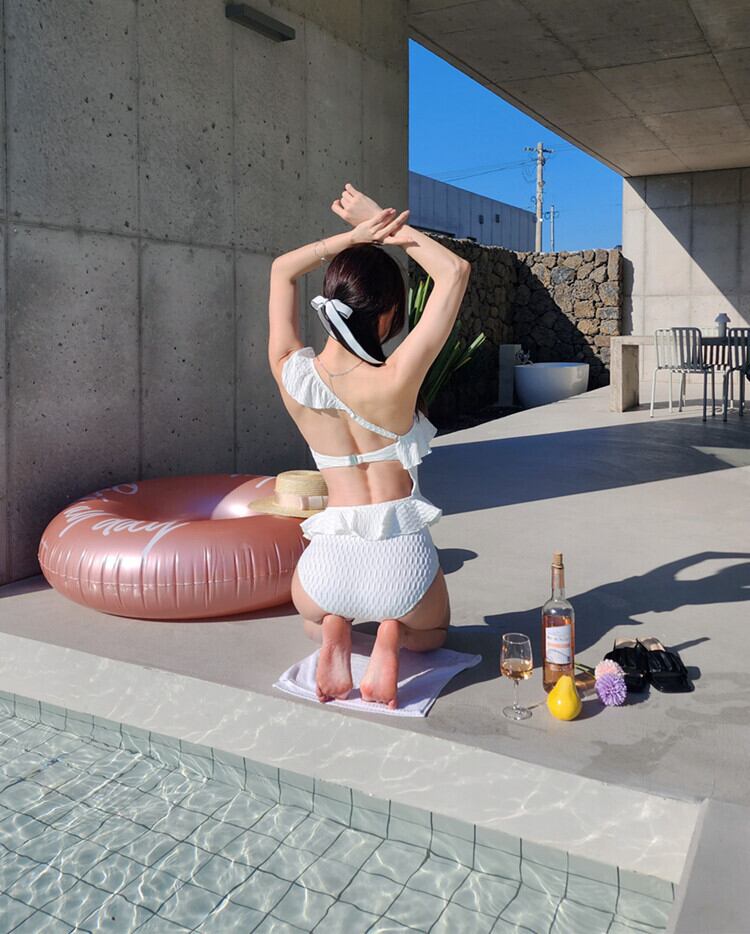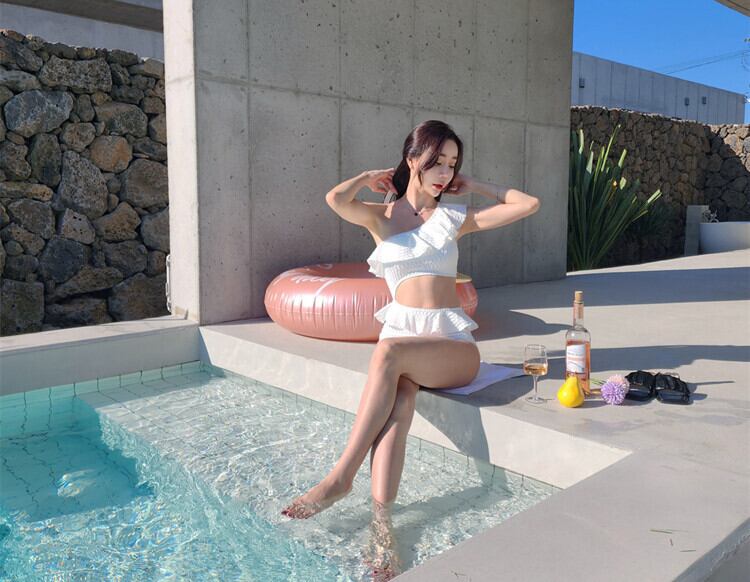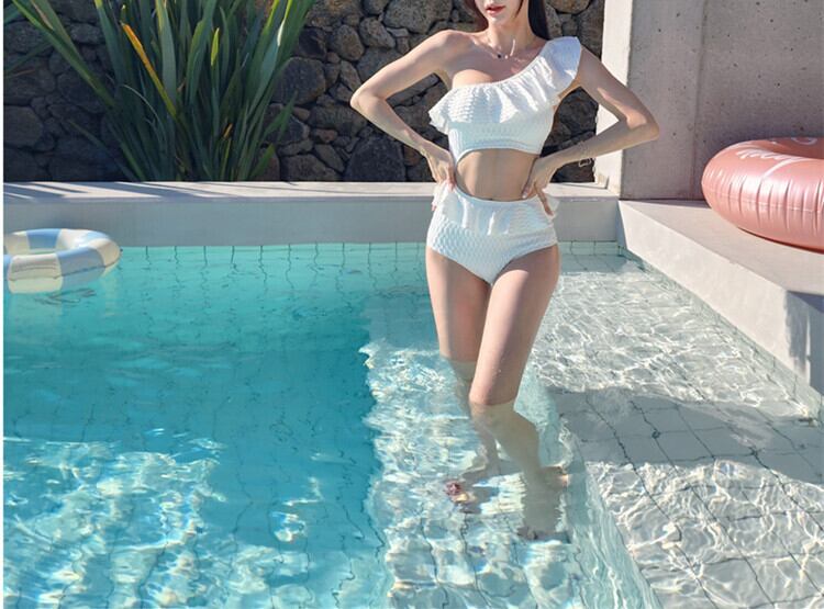 後ろ姿はセパレート水着に見えるモノキニタイプで、大胆なワンショルダーやウエスト周りのカットアウトでアクセントをもたせたクラシカルな一着です。シックなモノトーンが上品でハニカム調の立体的な生地の質感がおしゃれな一着です。