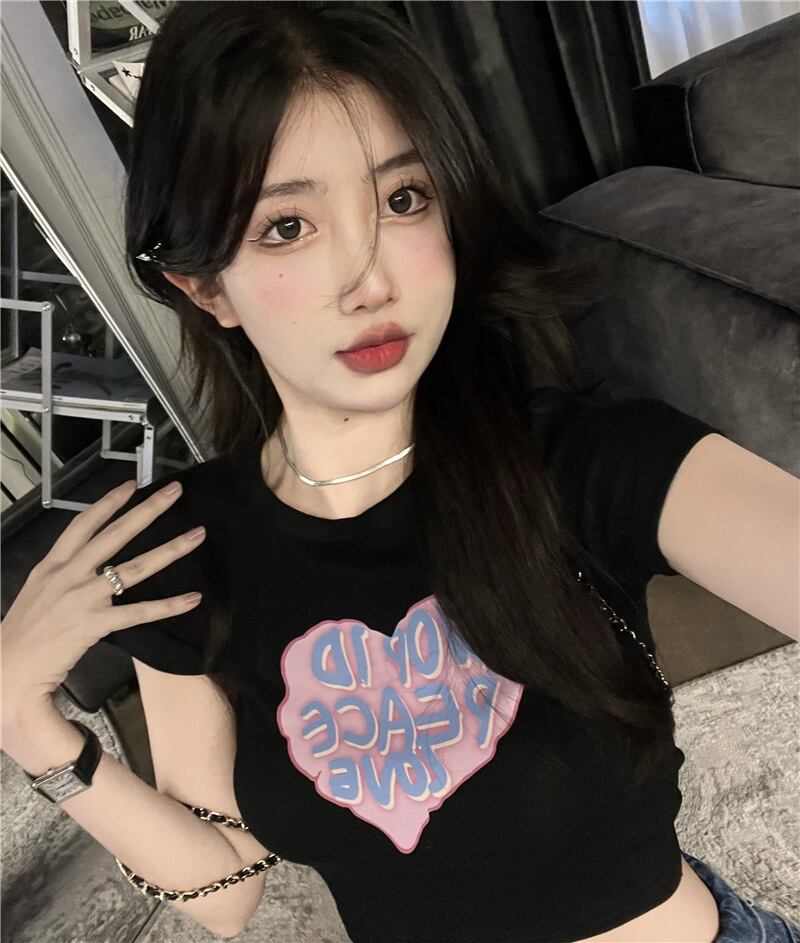 Tシャツ カットソー トップス クルーネック ワンポイント プリント ハート ロゴ レタリング プリント 半袖 スポーティー ショート丈 ブラック ホワイト 大人可愛い シンプル 上品 お洒落 こなれ感 無地 10代 20代 30代 40代 オフィス ビジネス OL 通勤 学生 通学 デート お出かけ 休日 イベント デイリー 普段使い S M L XL | GVON~ファッションショップ~