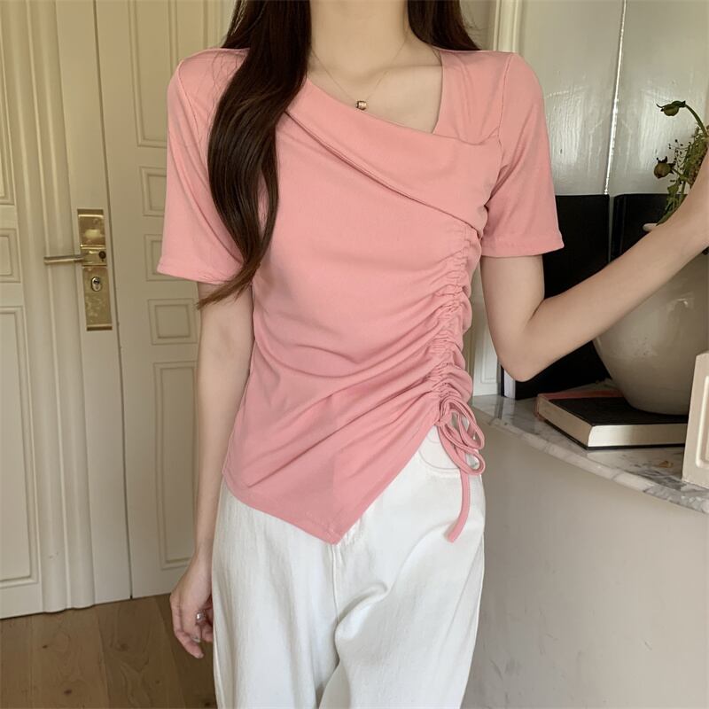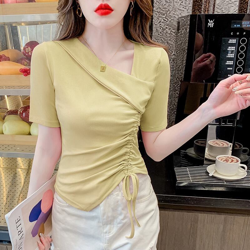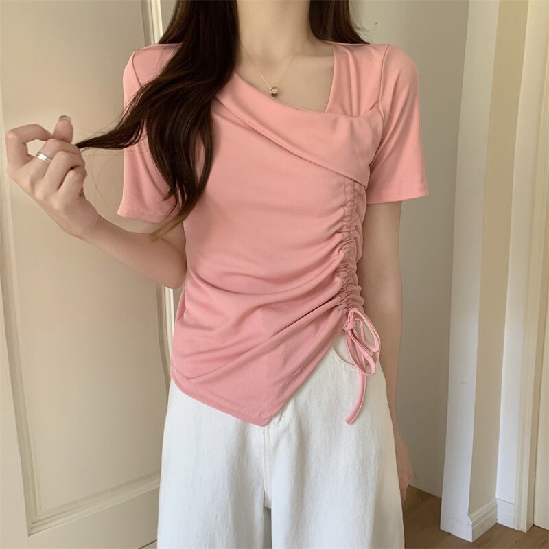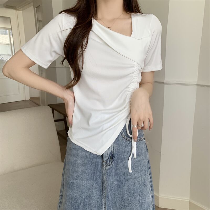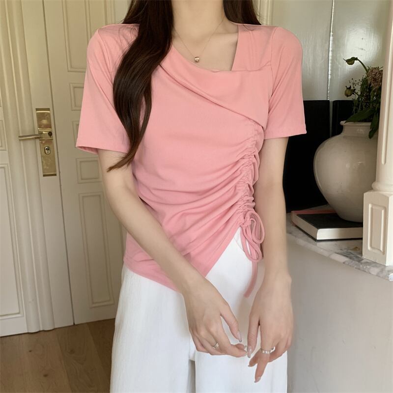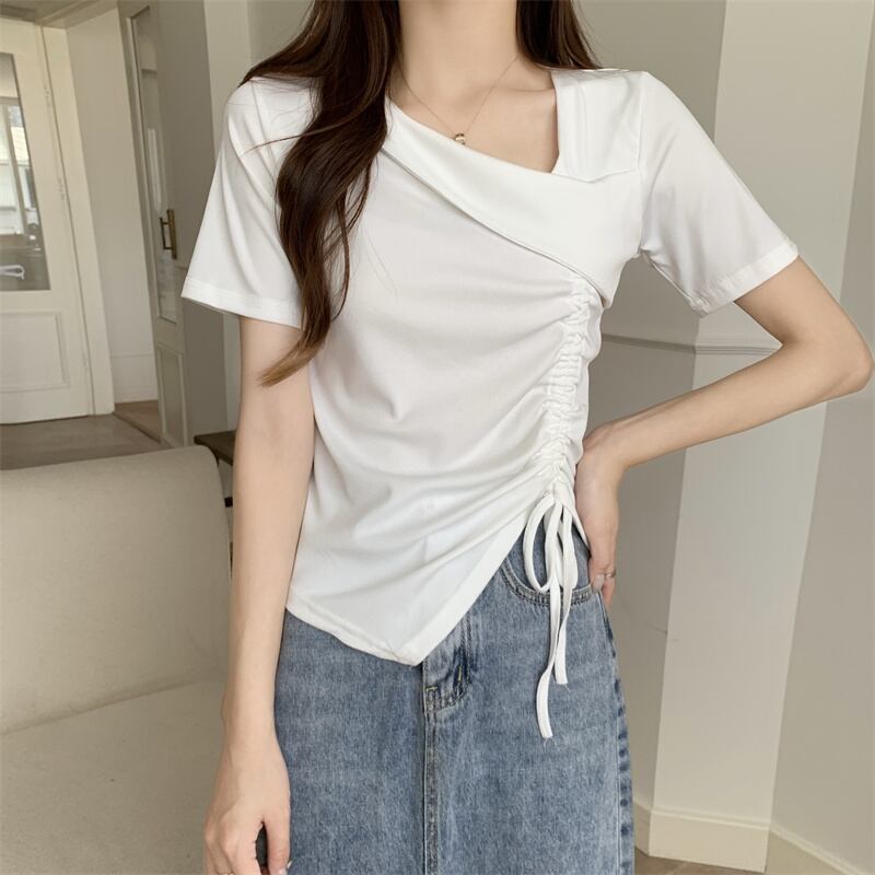 カットソー トップス 半袖 アシンメトリー 変形 ドローストリング ギャザー リボン Vネックスリット ショート丈 Tシャツ デコルテ 大人可愛い シンプル 上品 お洒落 こなれ感 無地 10代 20代 30代 40代 オフィス ビジネス OL 通勤 学生 通学 デート お出かけ 休日 イベント デイリー 普段使い L XL 2XL 3XL 4XL イエロー ホワイト ブラック ピンク | GVON~ファッションショップ~