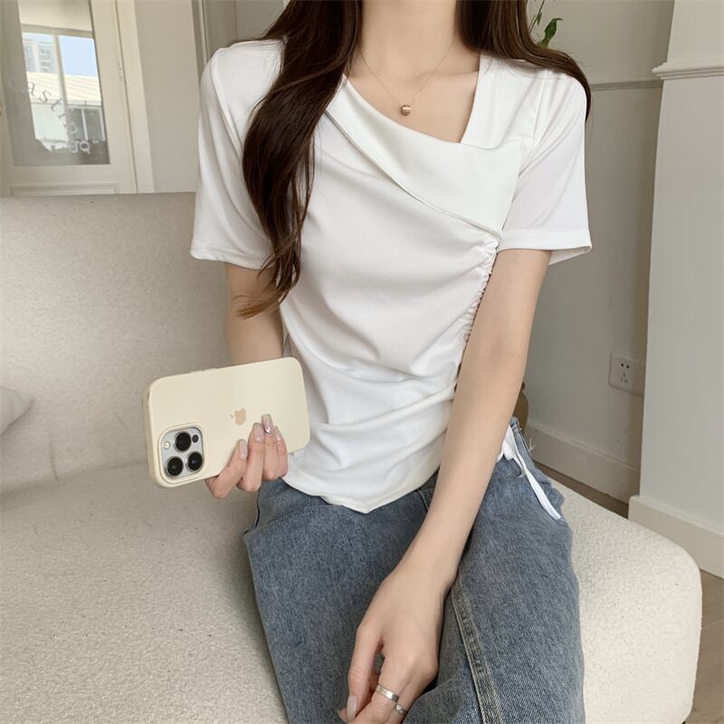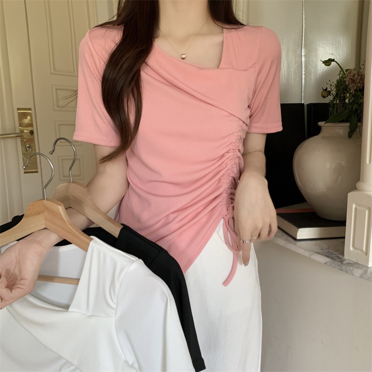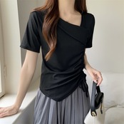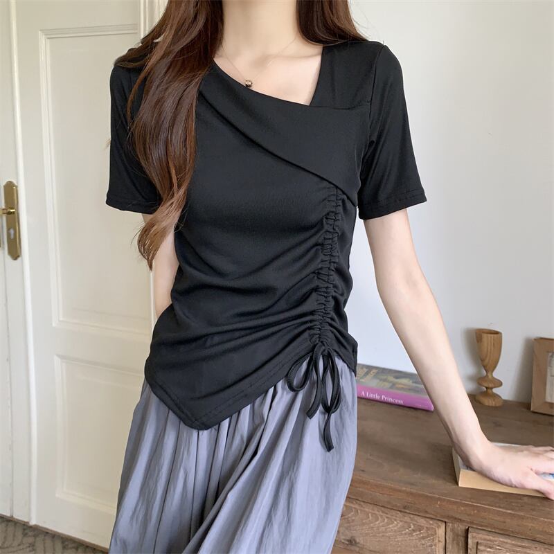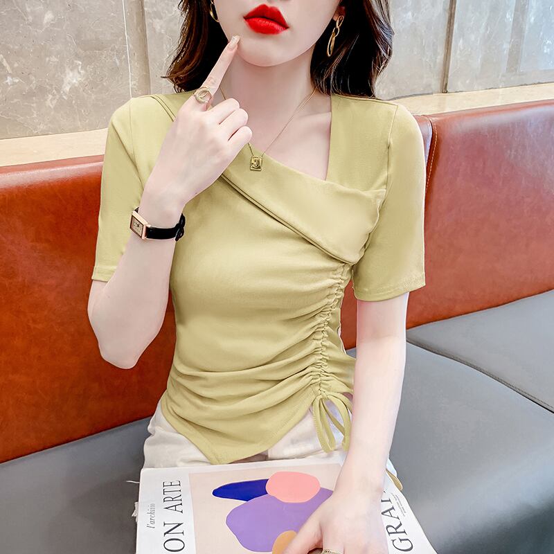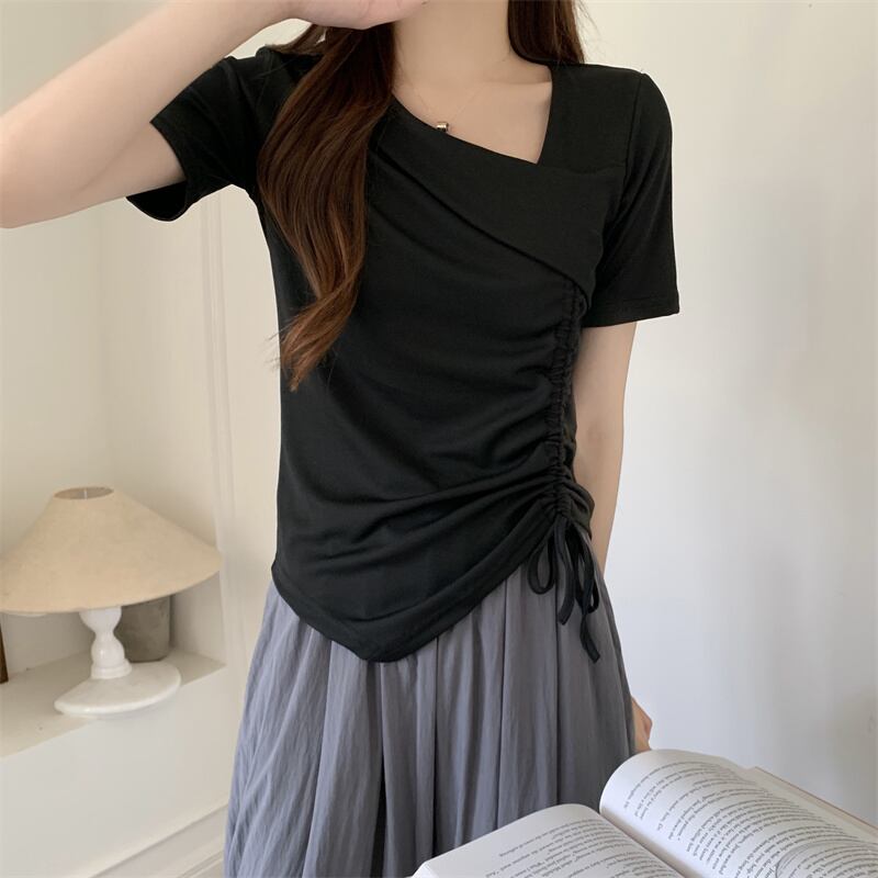 カットソー トップス 半袖 アシンメトリー 変形 ドローストリング ギャザー リボン Vネックスリット ショート丈 Tシャツ デコルテ 大人可愛い シンプル 上品 お洒落 こなれ感 無地 10代 20代 30代 40代 オフィス ビジネス OL 通勤 学生 通学 デート お出かけ 休日 イベント デイリー 普段使い L XL 2XL 3XL 4XL イエロー ホワイト ブラック ピンク | GVON~ファッションショップ~