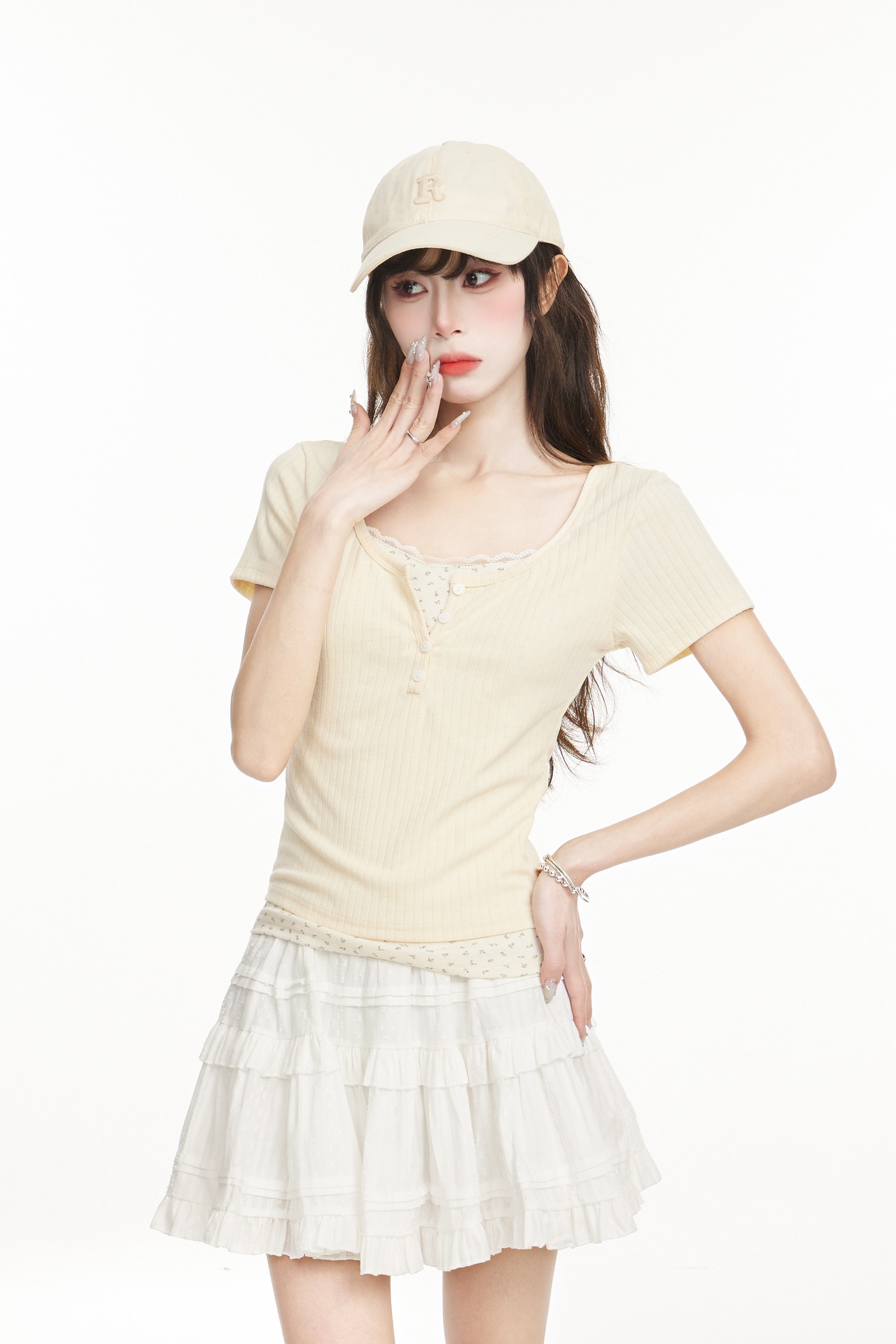 シンプルなTシャツに可愛らしいアクセントを添えた、大人可愛いデザインのフェイクレイヤードトップスです。ラウンドネックにつけられたリボンやギャザー、小花柄のワンポイントが、上品な印象を与えます。タイトなシルエットが女性らしさを引き立て、着心地も抜群です。ピンクやブルー、アプリコットのカラーバリエーションから、お好みの色をお選びください。