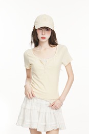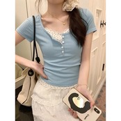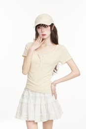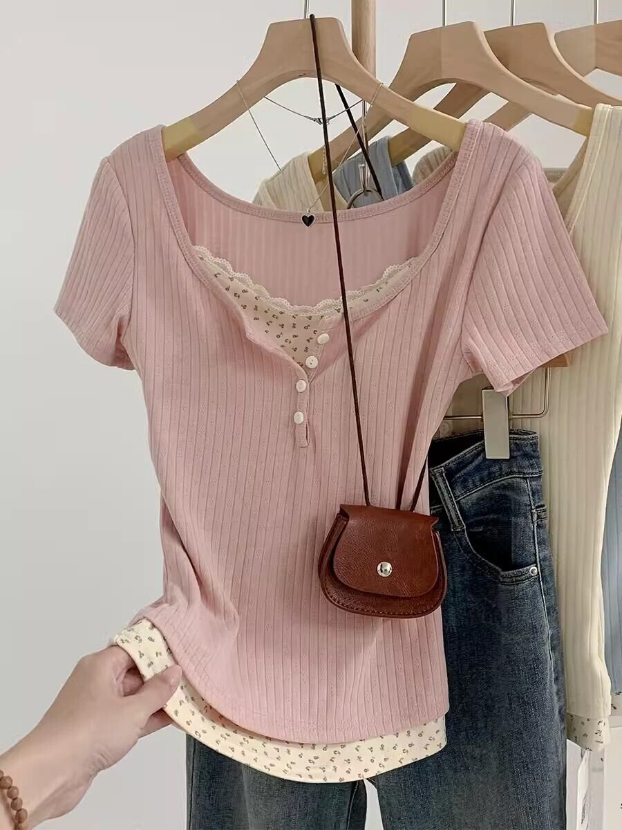 Tシャツ カットソー トップス ラウンドネック ワンポイント リボン フェイクレイヤード 小花柄 タイト ギャザー ヘンリーネック レース 半袖 ピンク ブルー アプリコット 大人可愛い シンプル 上品 お洒落 こなれ感 無地 10代 20代 30代 40代 オフィス ビジネス OL 通勤 学生 通学 デート お出かけ 休日 イベント デイリー 普段使い S M | GVON~ファッションショップ~