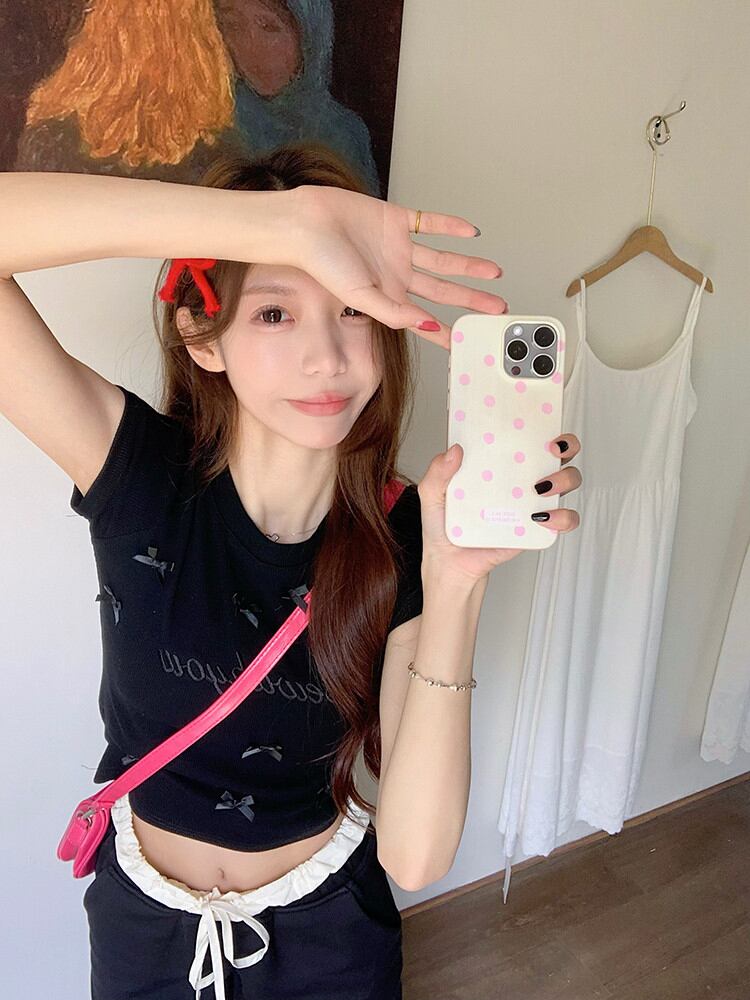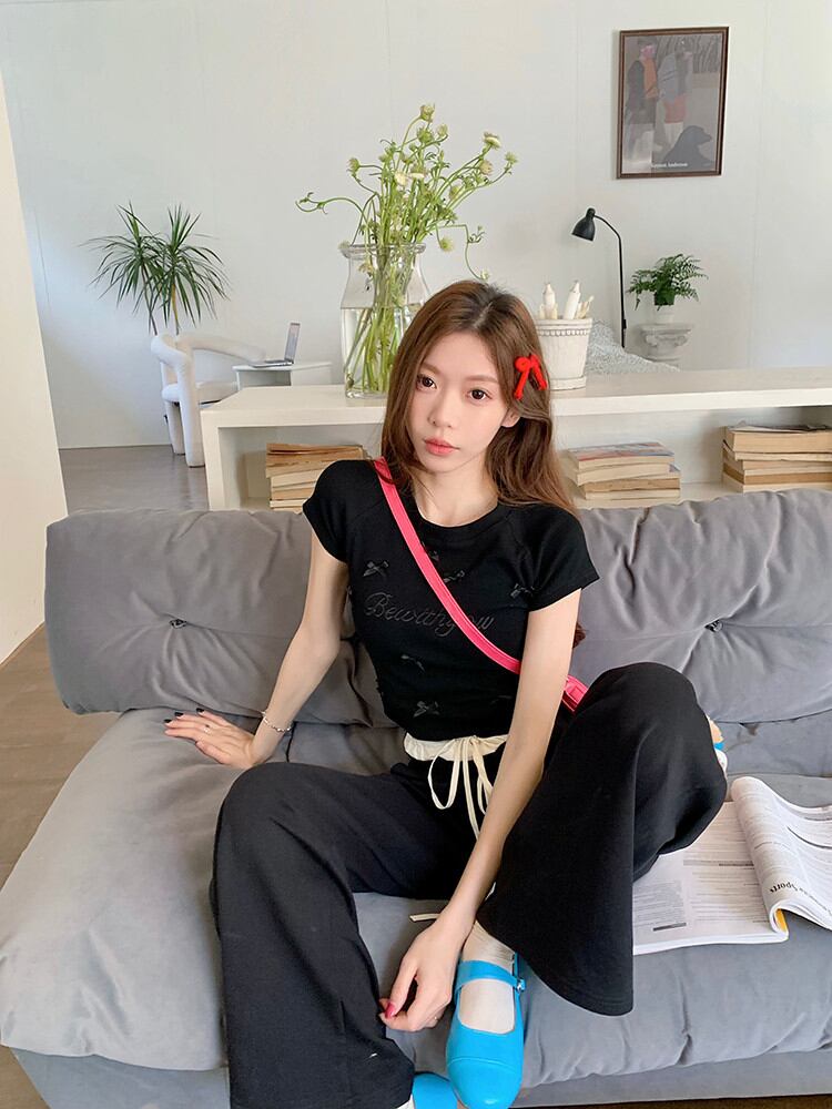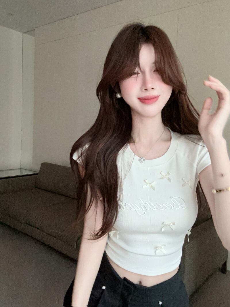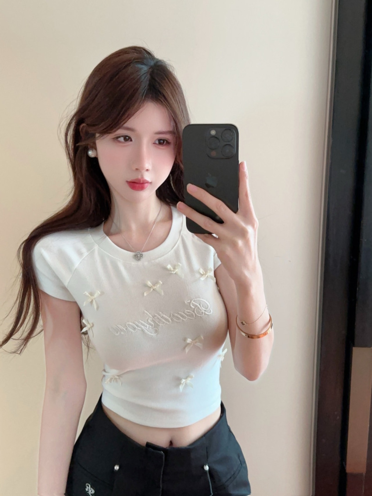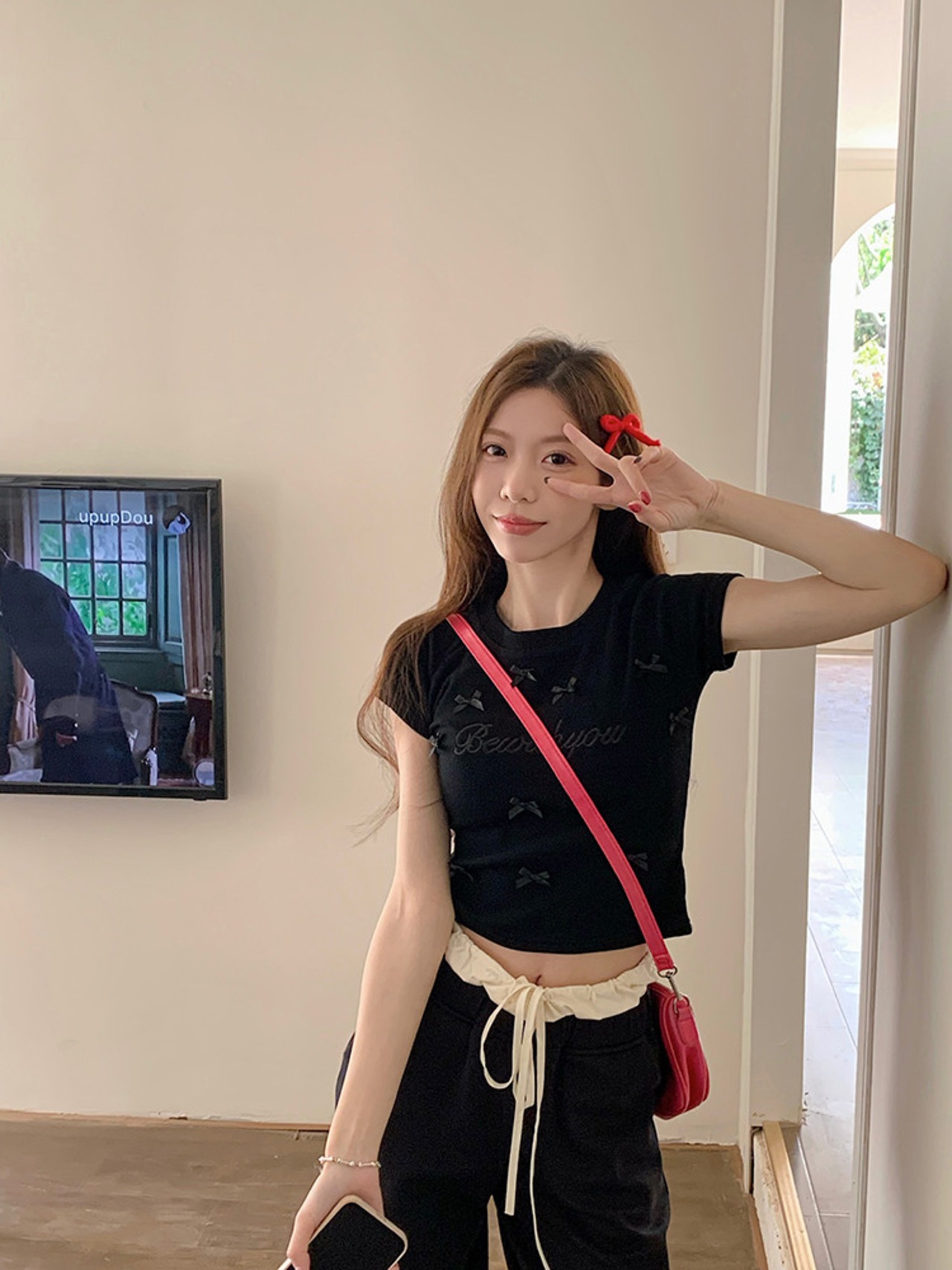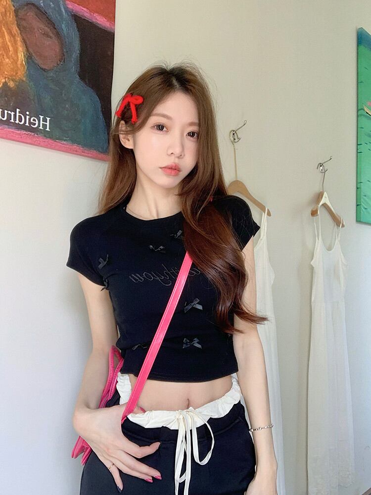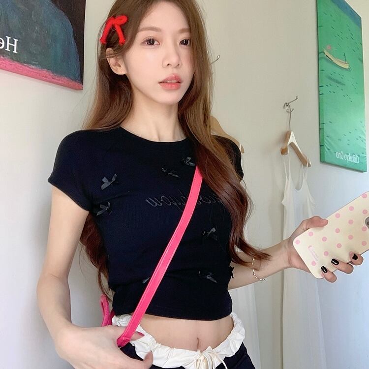 Tシャツ カットソー トップス クルーネック ワンポイント リボン 刺繍 レタリング 半袖 タイト ブラック ホワイト 大人可愛い シンプル 上品 お洒落 こなれ感 無地 10代 20代 30代 40代 オフィス ビジネス OL 通勤 学生 通学 デート お出かけ 休日 イベント デイリー 普段使い S M L XL | GVON~ファッションショップ~