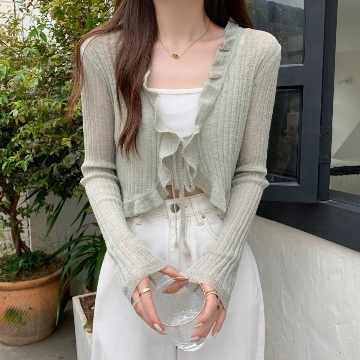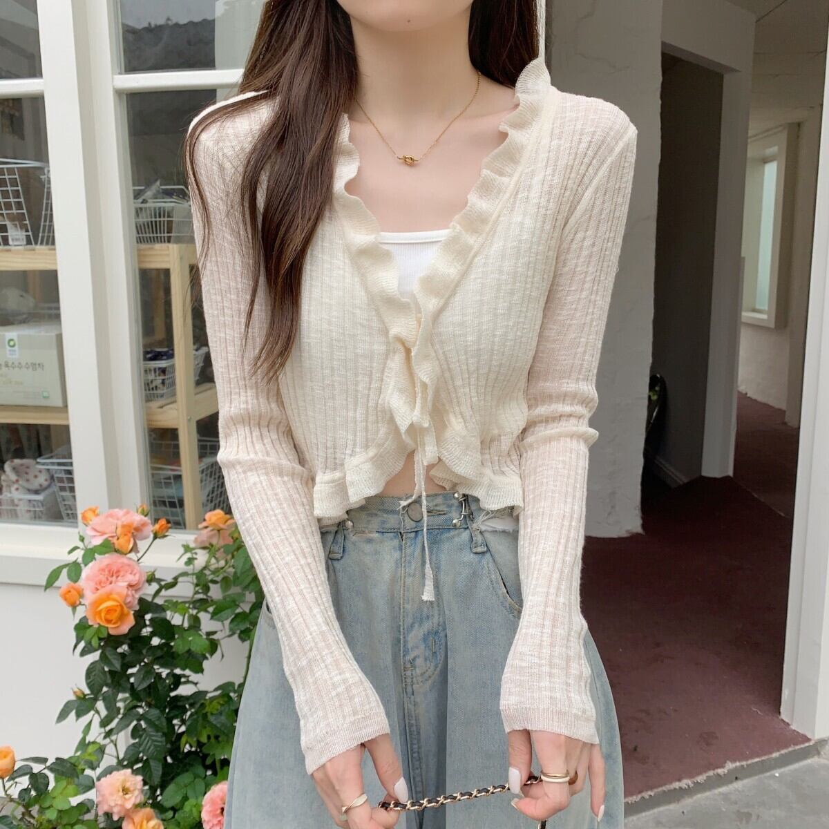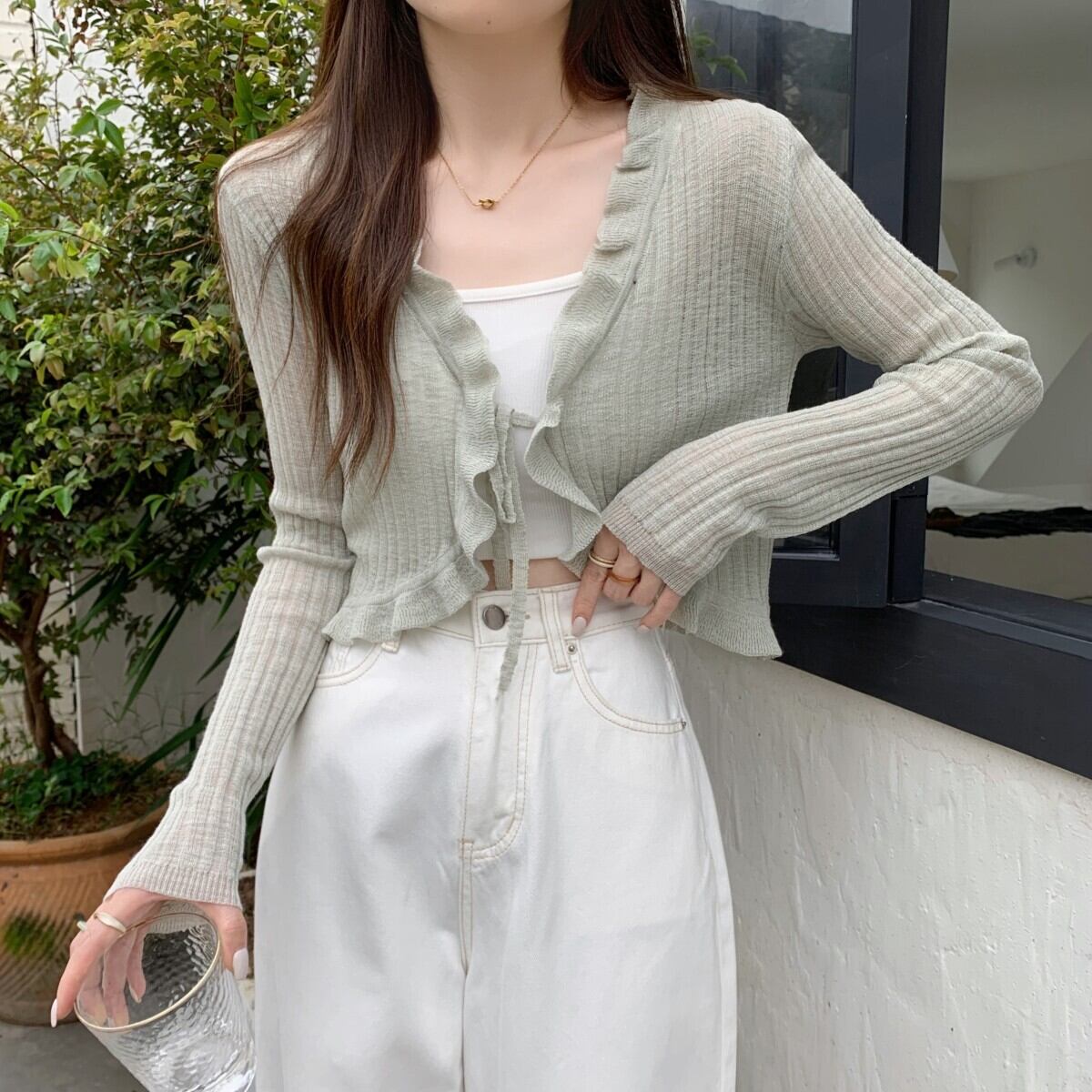 カーディガン セーター ニット トップス 前開き アウター Vネック リブ フリル ショート丈 長袖 大人可愛い シンプル 上品 お洒落 こなれ感 無地 10代 20代 30代 40代 オフィス OL 通勤 学生 通学 デート お出かけ 休日 イベント デイリー 普段使い S M L | GVON~ファッションショップ~