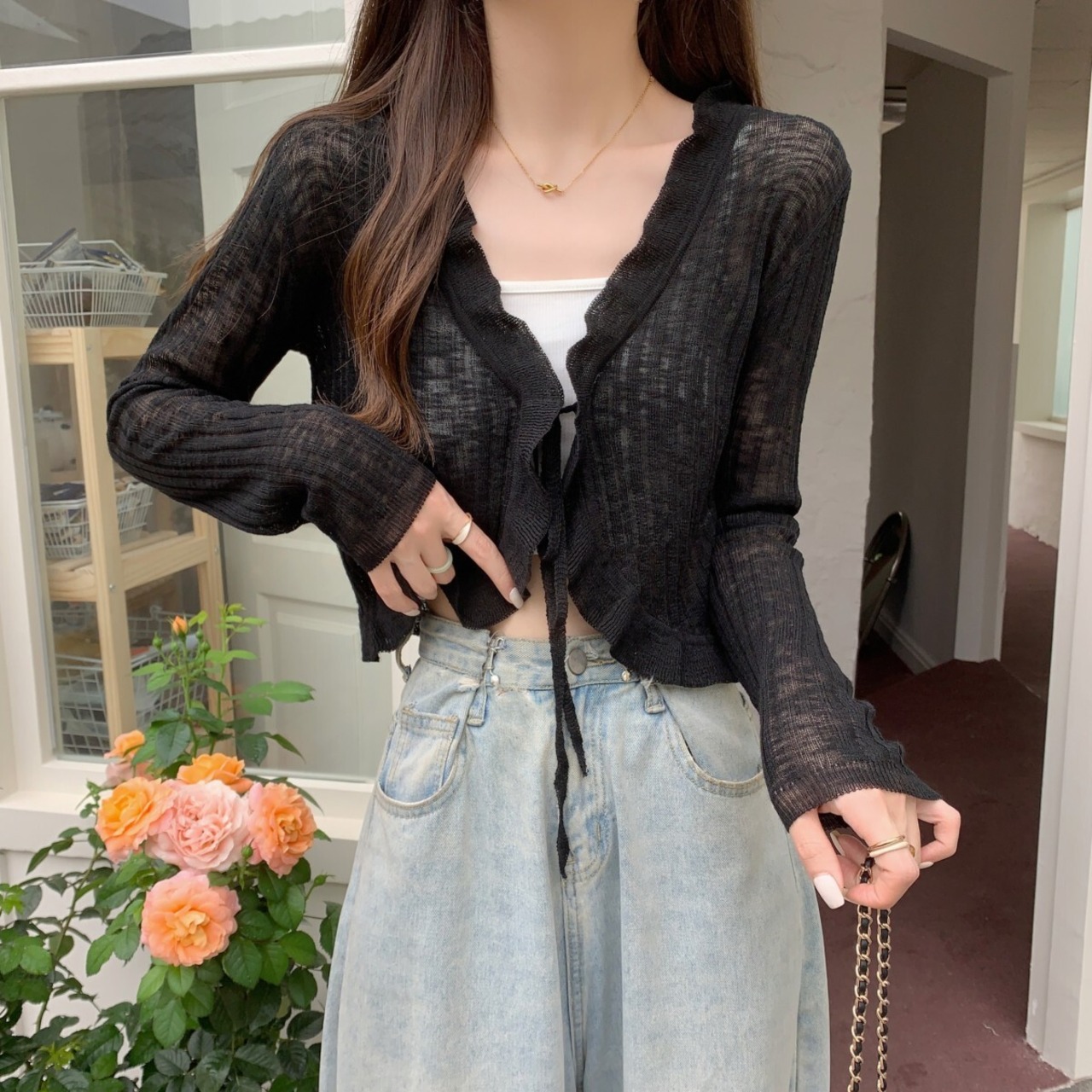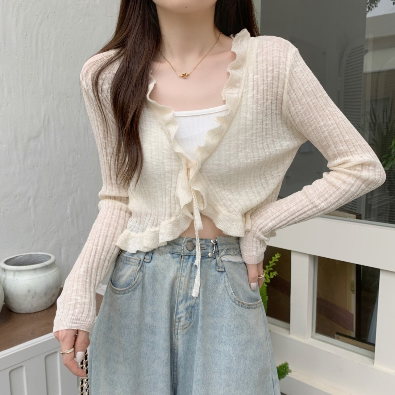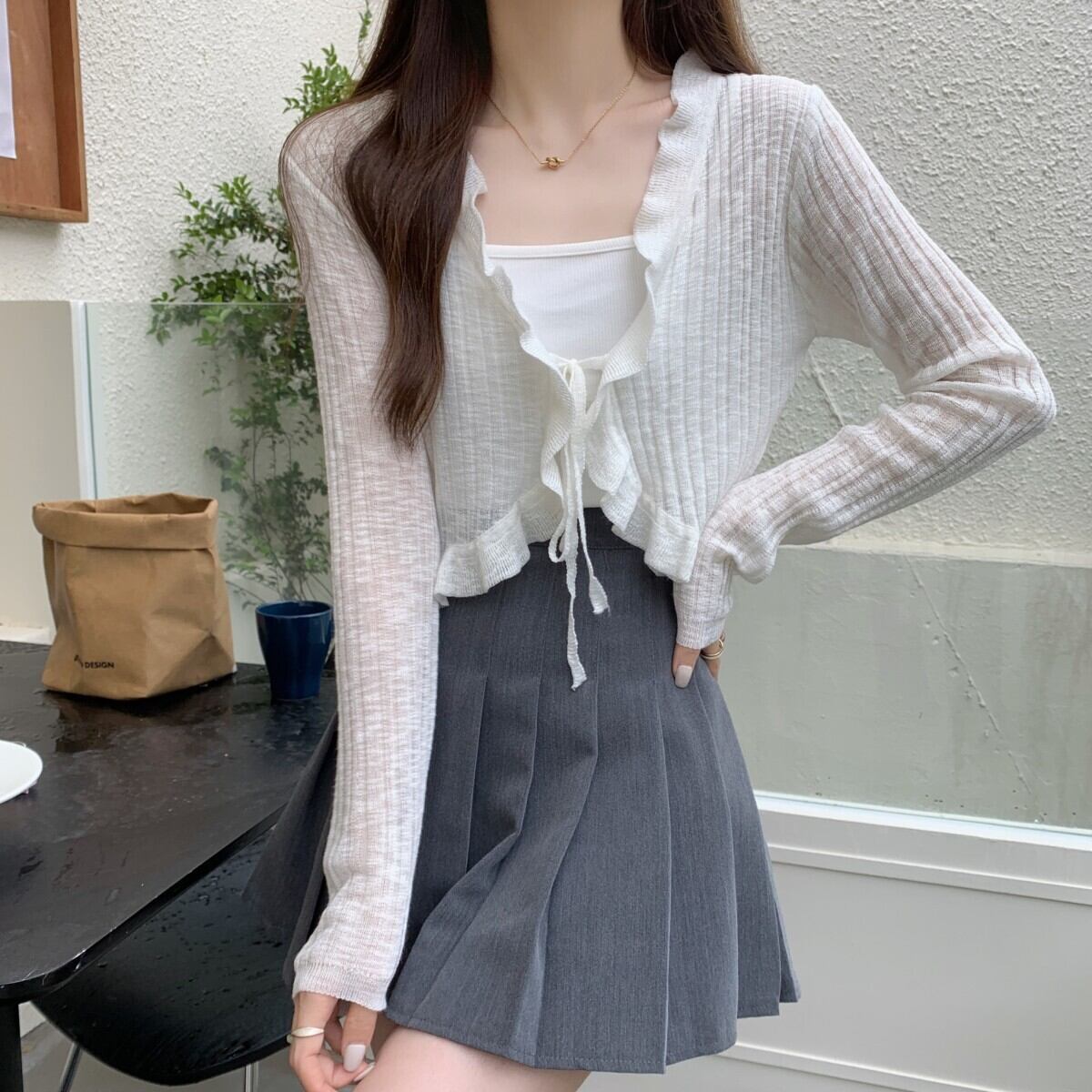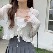 カーディガン セーター ニット トップス 前開き アウター Vネック リブ フリル ショート丈 長袖 大人可愛い シンプル 上品 お洒落 こなれ感 無地 10代 20代 30代 40代 オフィス OL 通勤 学生 通学 デート お出かけ 休日 イベント デイリー 普段使い S M L | GVON~ファッションショップ~