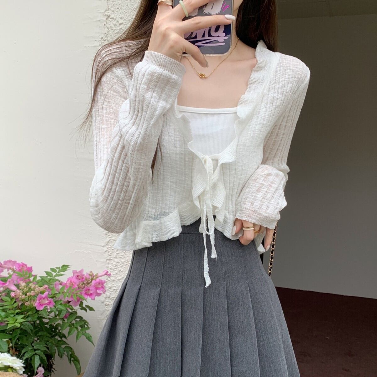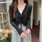 フリル付きのラウンドヘムがガーリーで可愛いカーディガントップスが登場しました!シンプルで上品なデザインながら、短めでミニマルなサイズ感が大人可愛い雰囲気を演出します。広めのVネックがデコルテをきれいに見せて、大人可愛いスタイリングにぴったり。幅広い年齢層やシーンで活躍してくれるアイテムです。