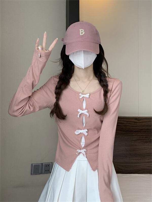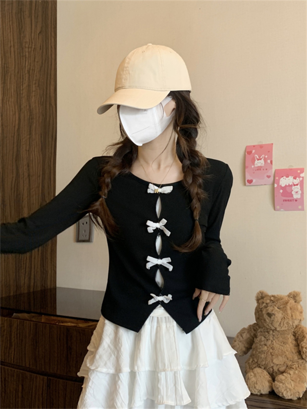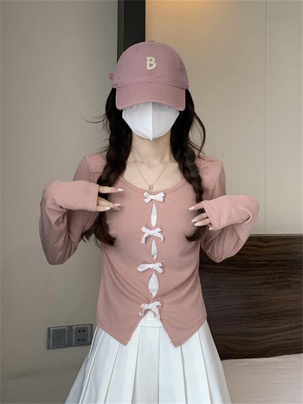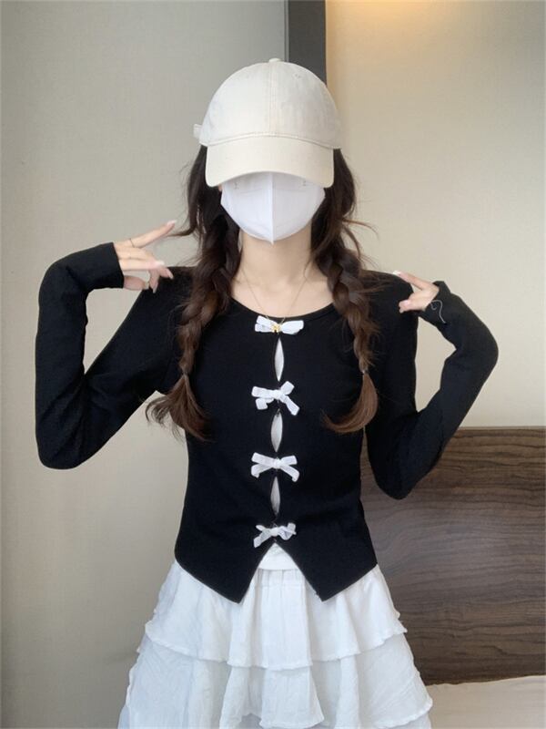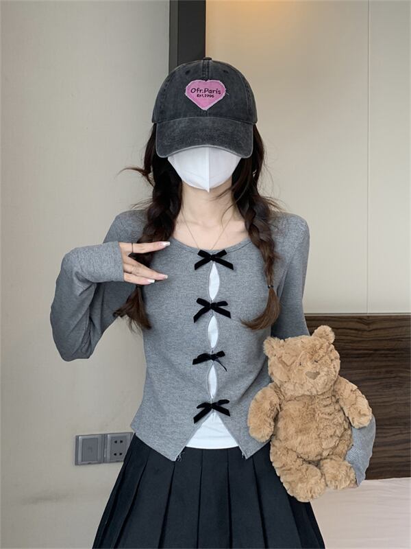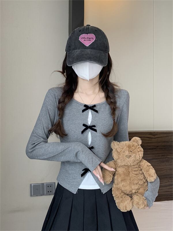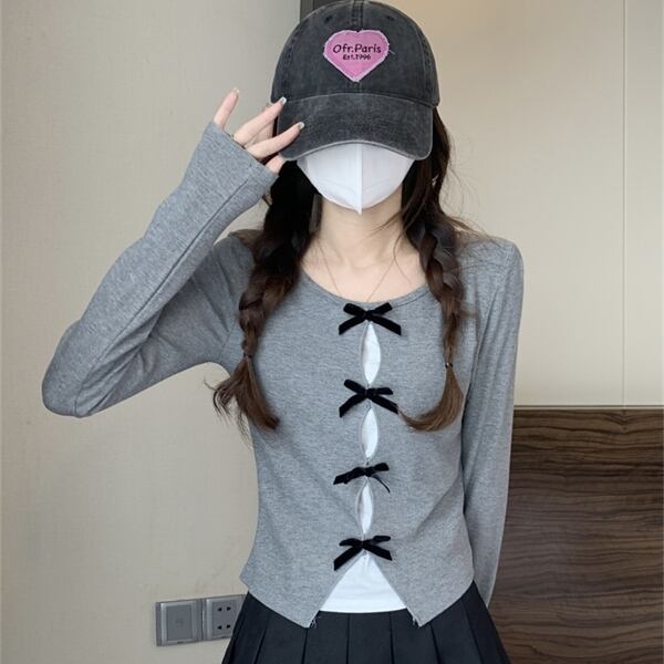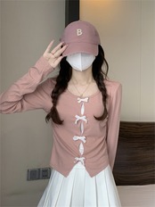 プチリボンを散りばめた、カーディガンのような前開き風デザインがこなれたトップスです。