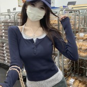 カットソー シャツ トップス ヘンリーネック フェイクツーピース レース 花柄 ホルターネック リボン バレエコア フェイクレイヤード ショート丈 長袖 大人可愛い シンプル 上品 お洒落 こなれ感 普段使い | GVON~ファッションショップ~
