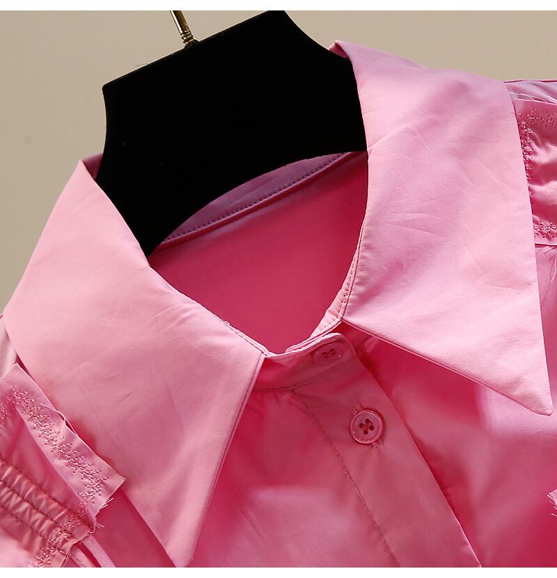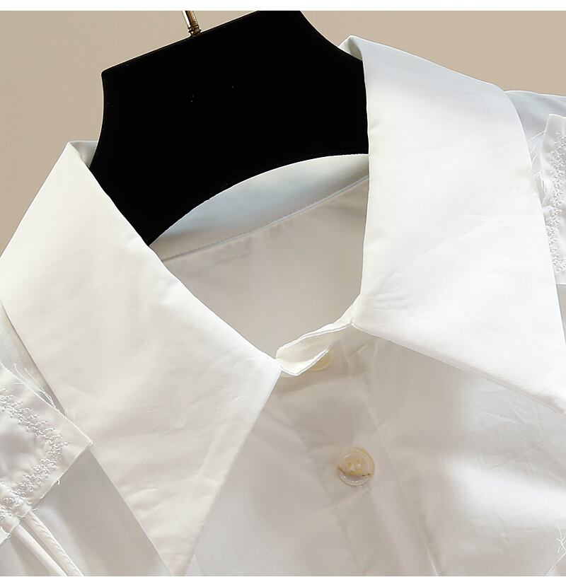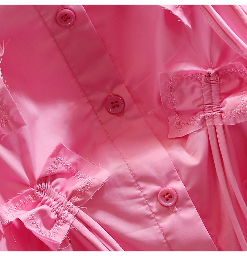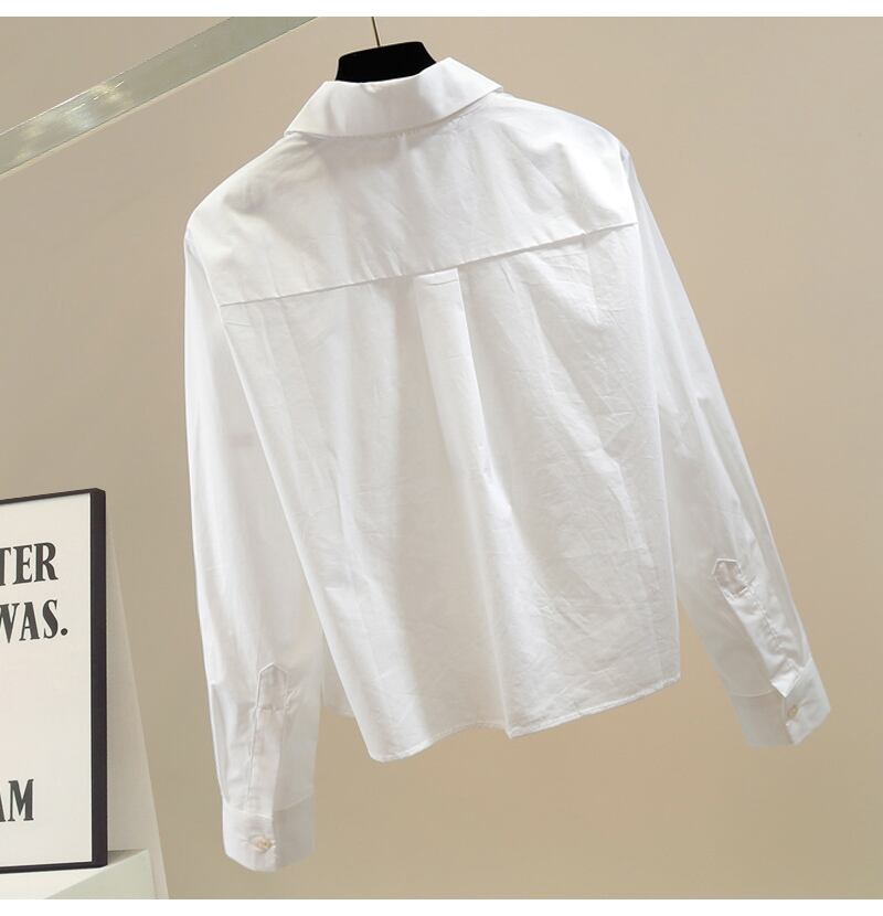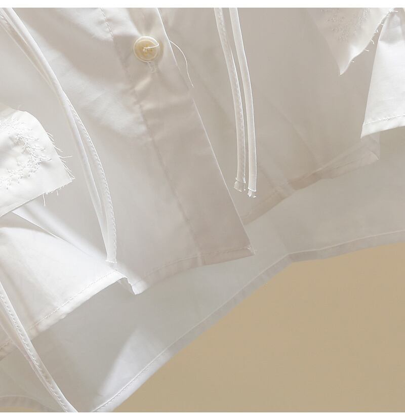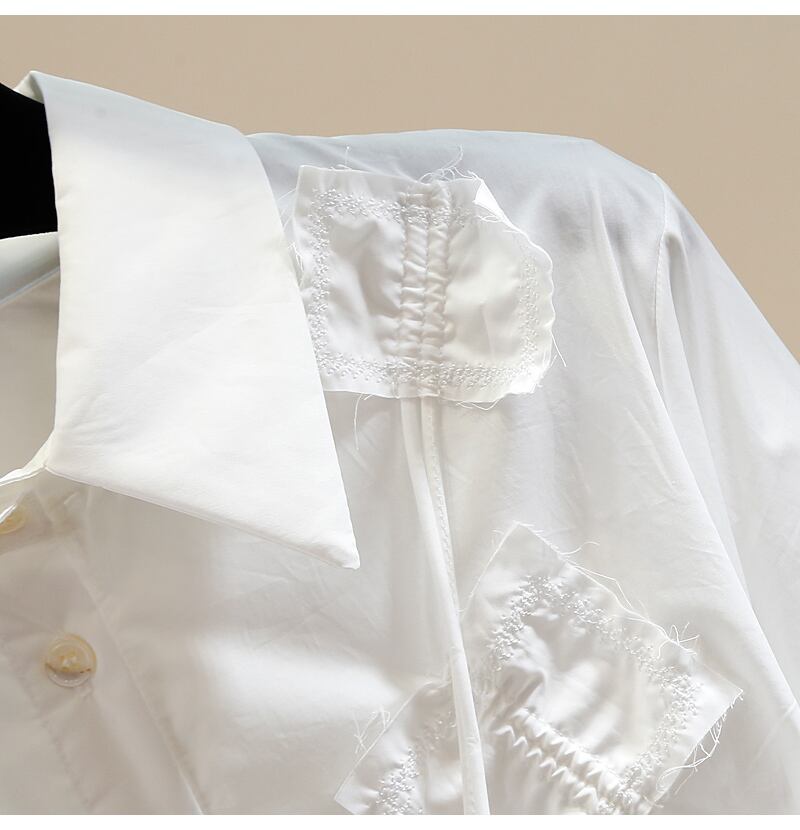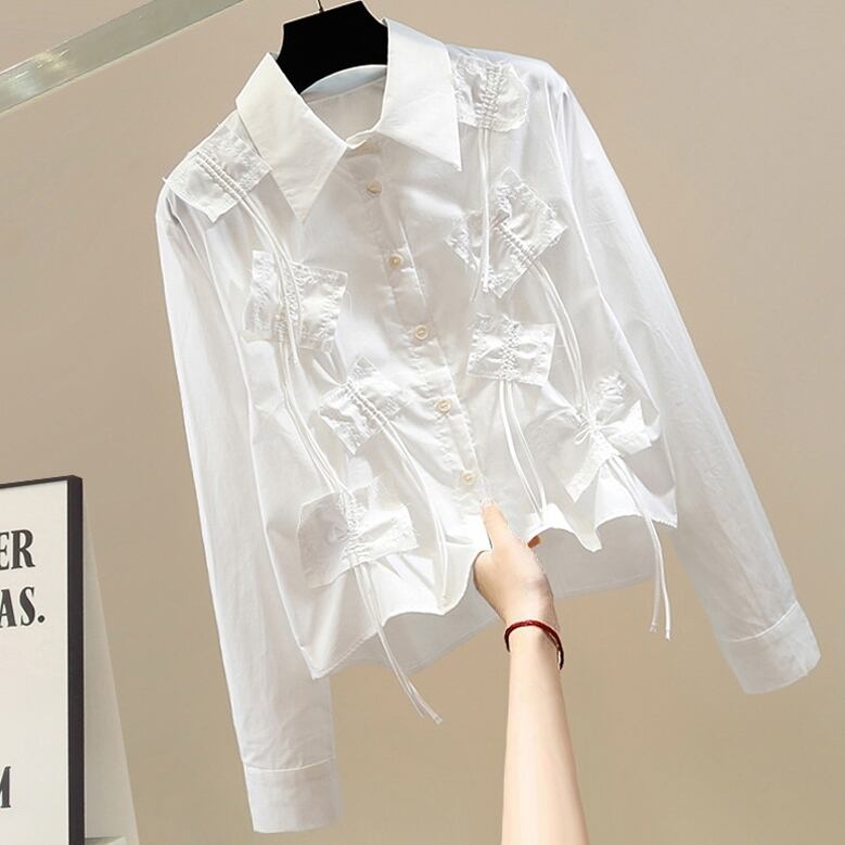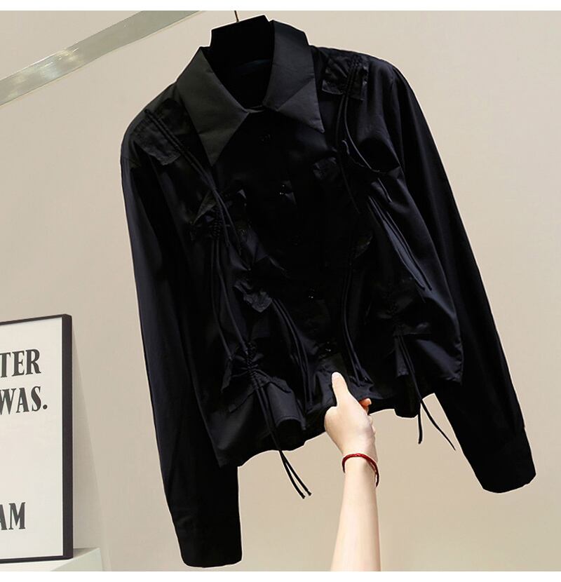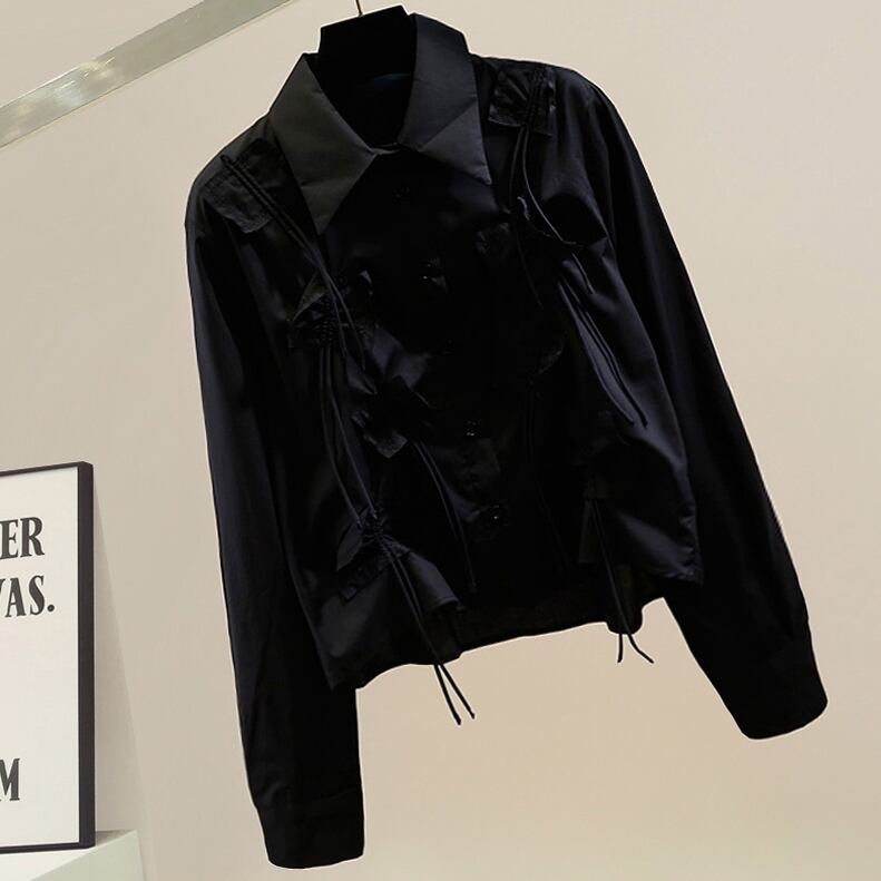 ドローストリングを絞って個性的なリボン風モチーフになるシックなシャツブラウスです。