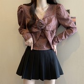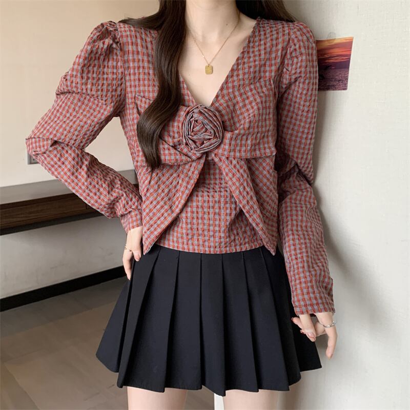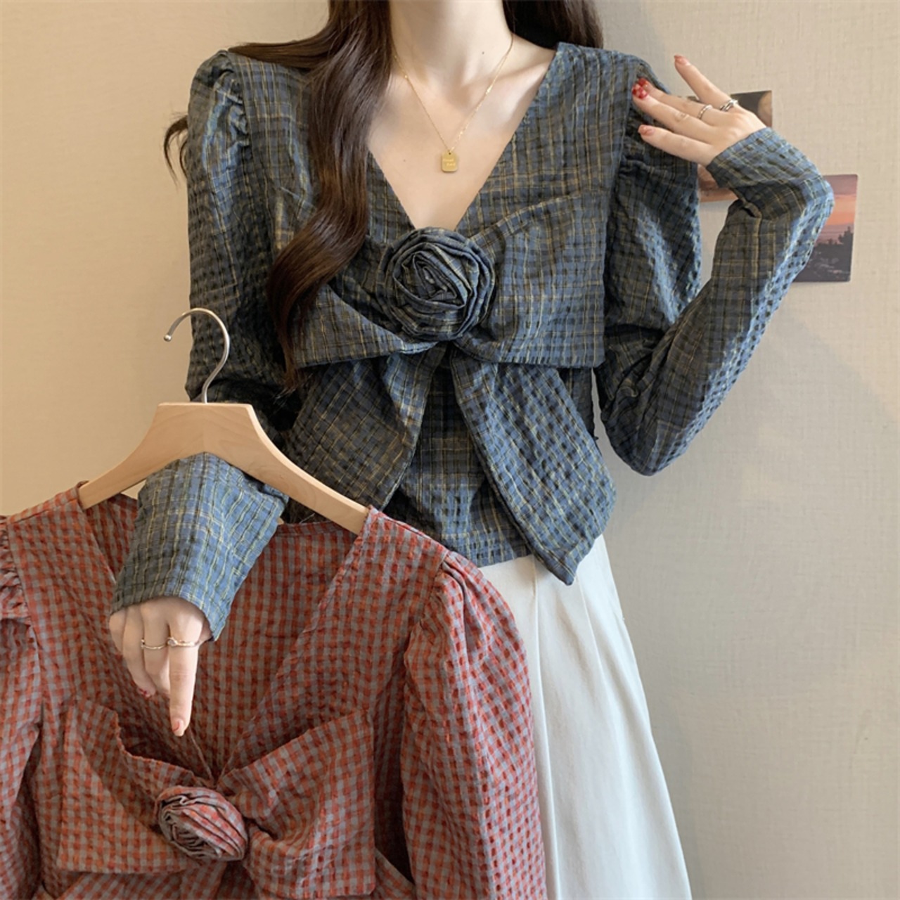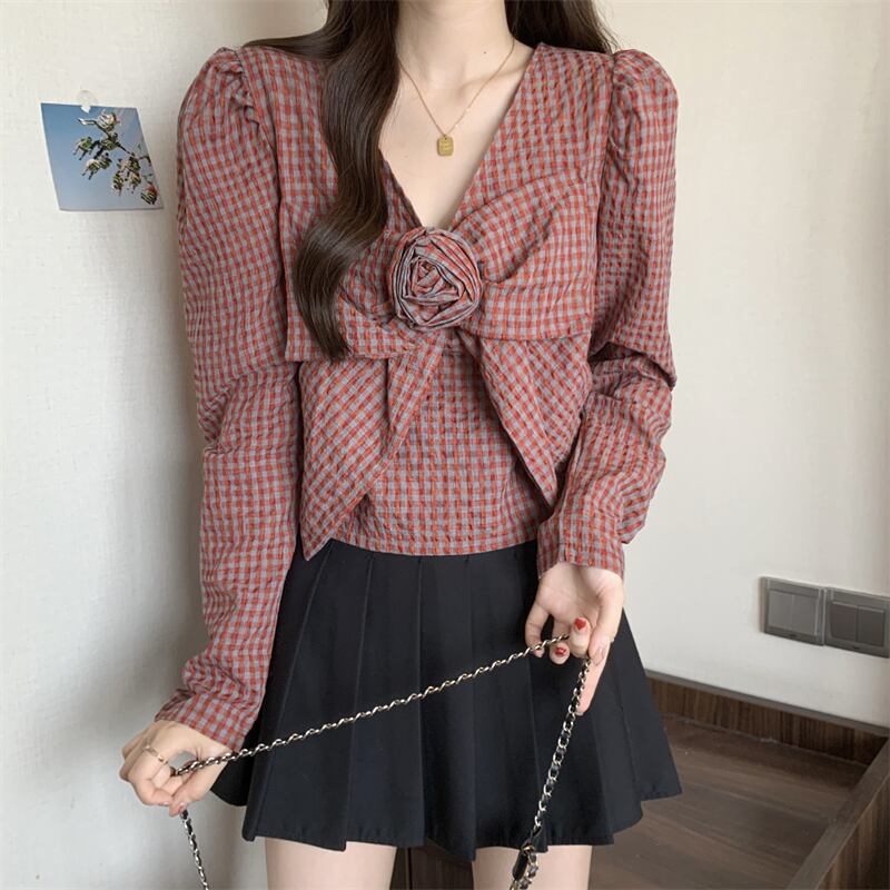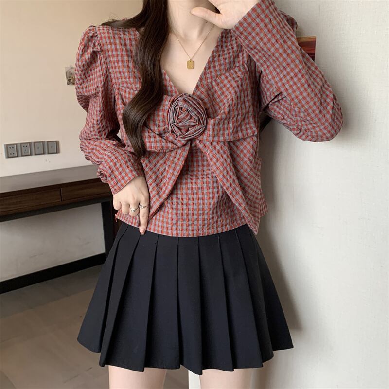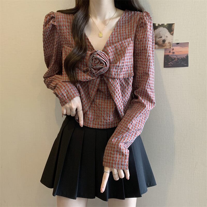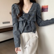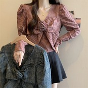 ブラウス トップス リボン ノーカラー Vネック プルオーバー リボン チェック柄 パフスリーブ 長袖 大人可愛い シンプル 上品 お洒落 こなれ感 デート お出かけ 休日 デイリー 普段使い | GVON~ファッションショップ~