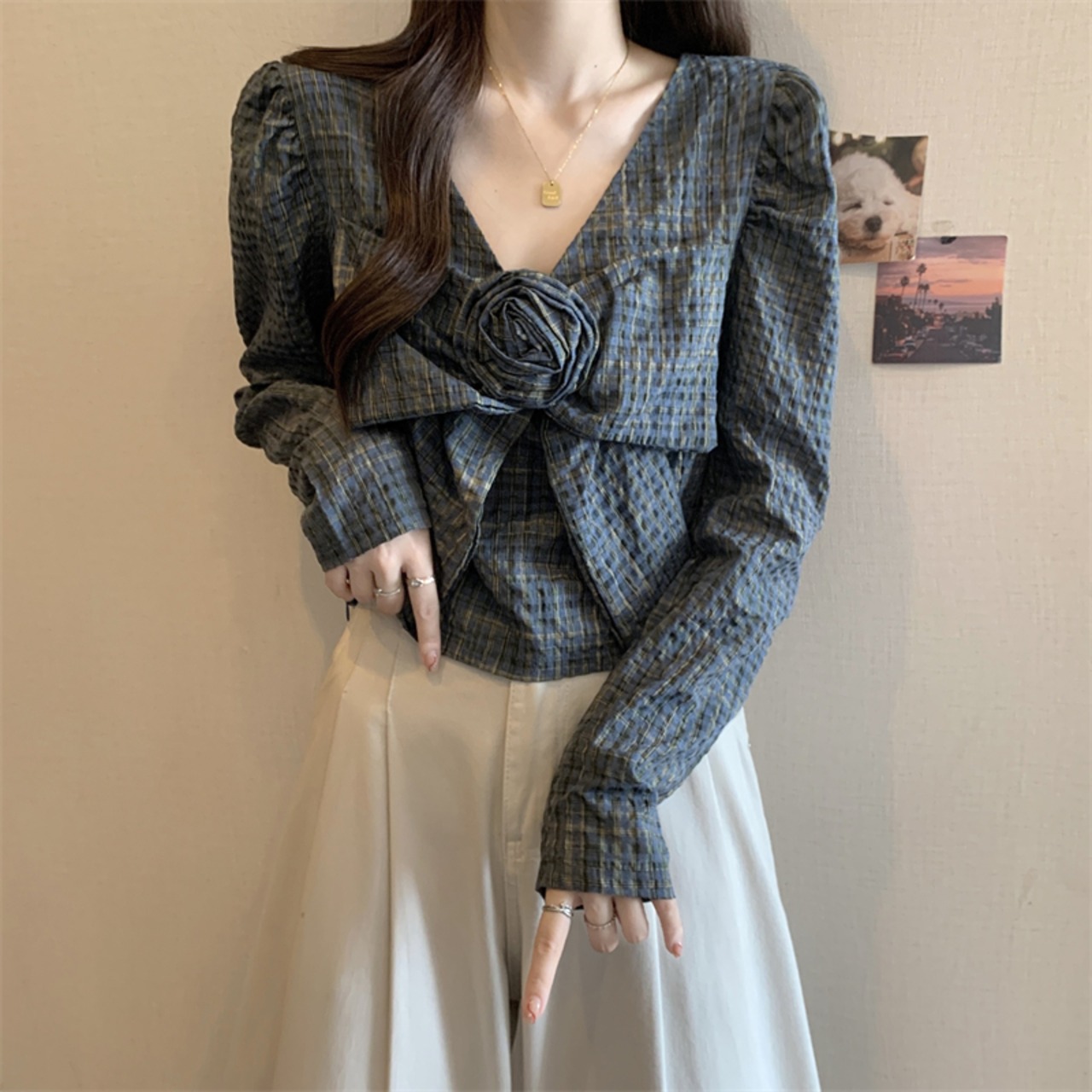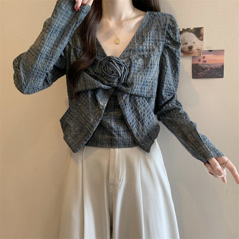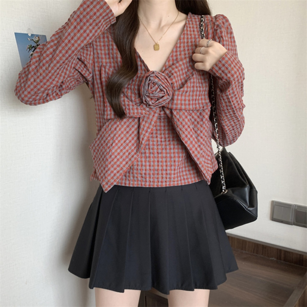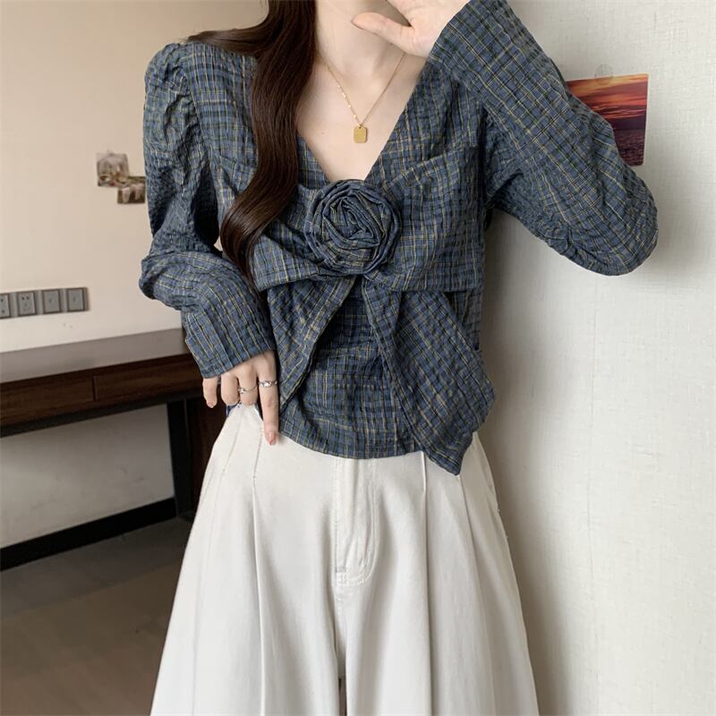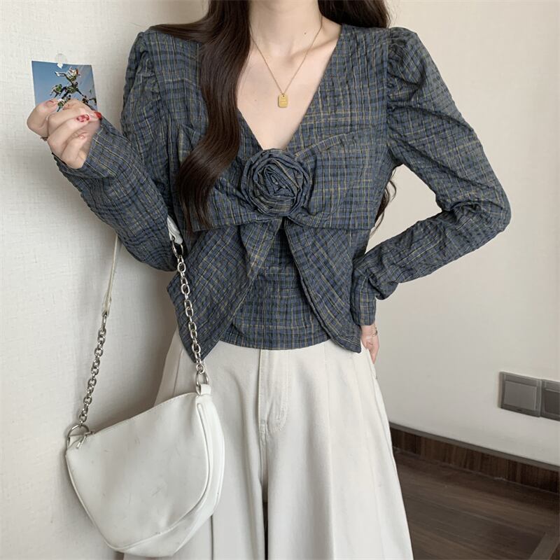 ブラウス トップス リボン ノーカラー Vネック プルオーバー リボン チェック柄 パフスリーブ 長袖 大人可愛い シンプル 上品 お洒落 こなれ感 デート お出かけ 休日 デイリー 普段使い | GVON~ファッションショップ~