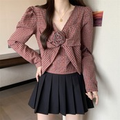 存在感抜群なリボン付きで華やかなチェック柄Vネックブラウスです!