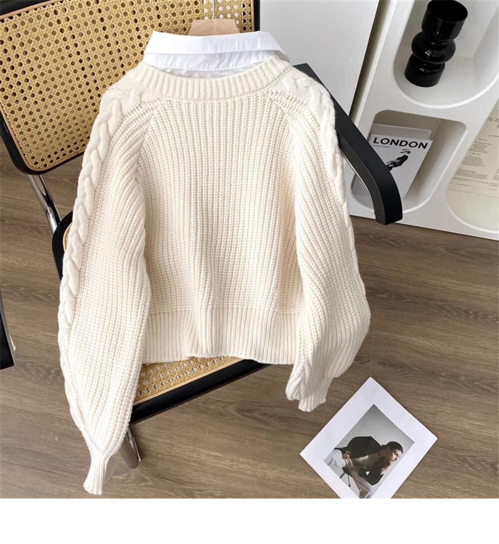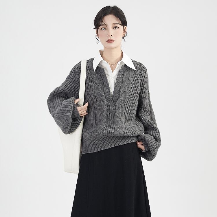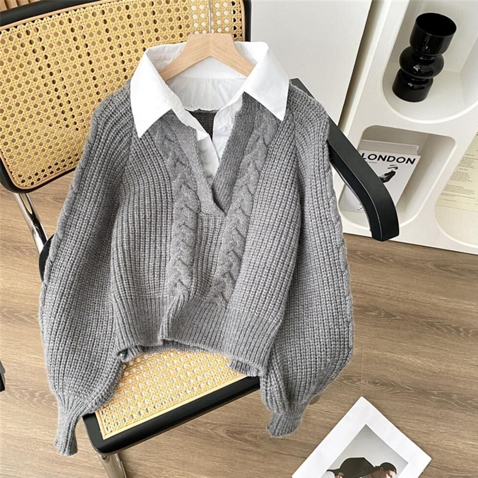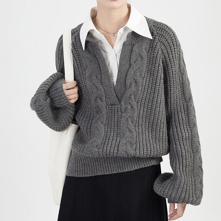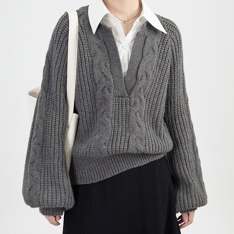 ブラウス トップス セーター ドッキング フェイクレイヤード ラージカラー キーネック ケーブル ニット パフスリーブ 長袖 バルーンスリーブ 大人可愛い シンプル 上品 お洒落 こなれ感 無地 休日 イベント デイリー 普段使い | GVON~ファッションショップ~