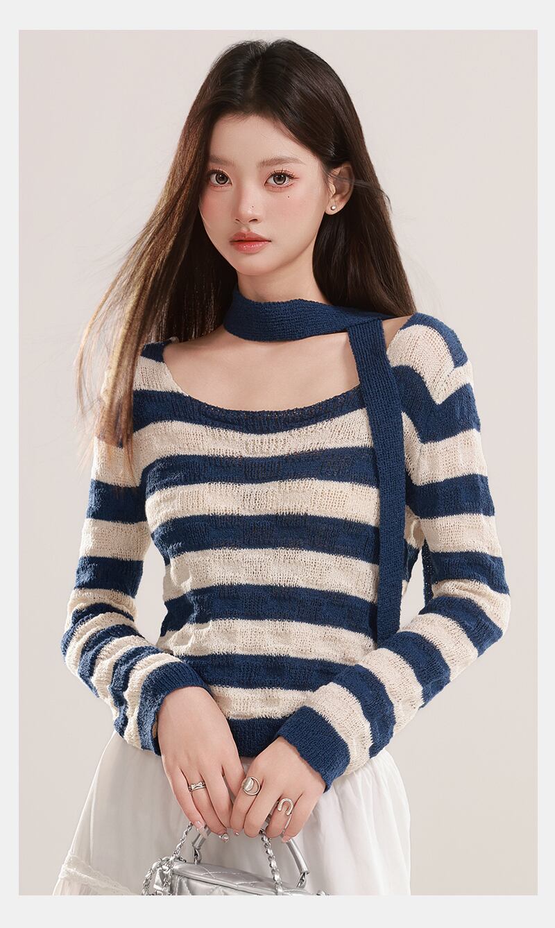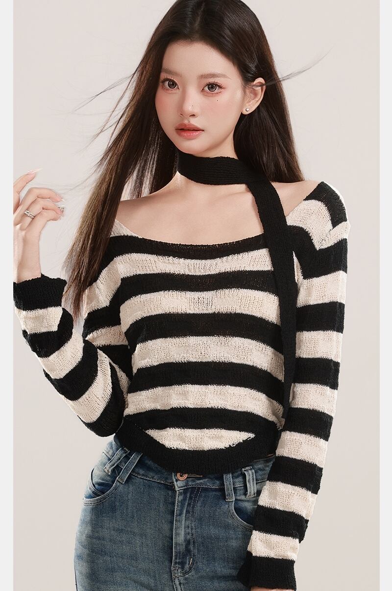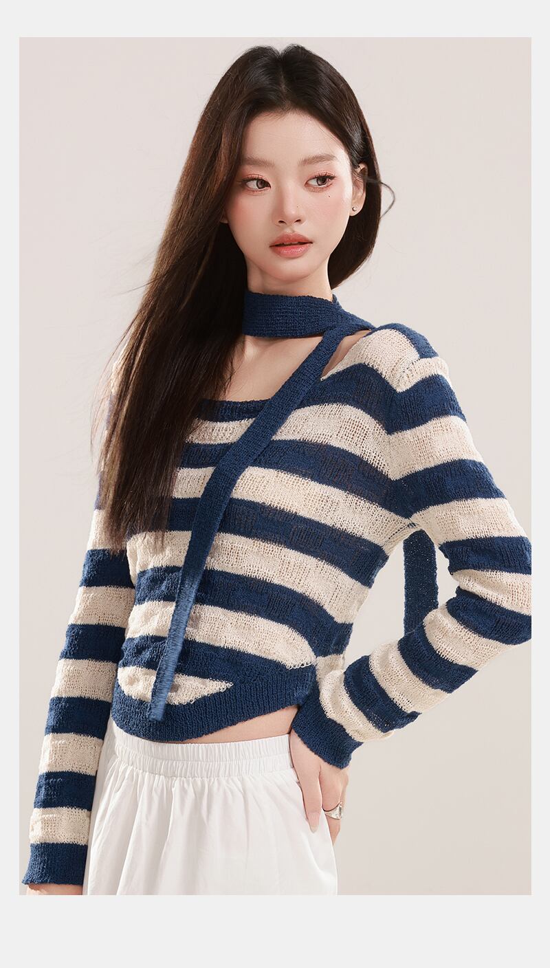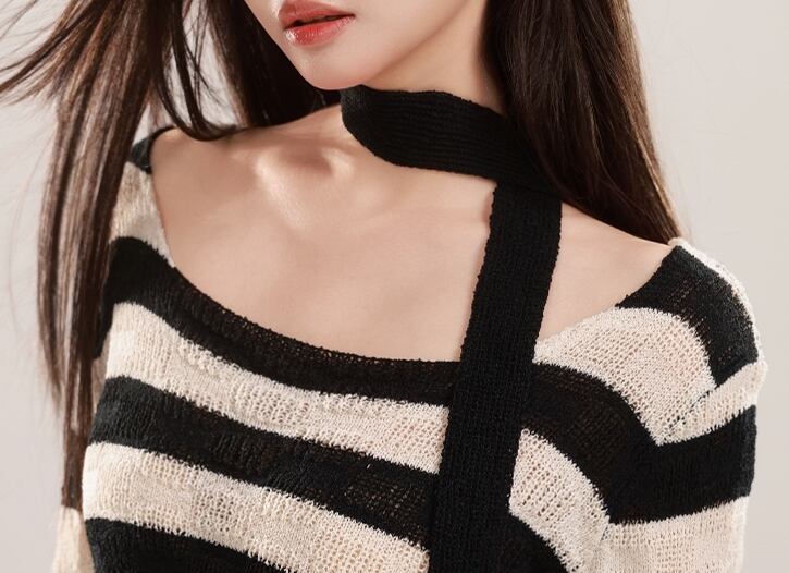 ツートーン配色がおしゃれなざっくりと編んだチョーカー付きニットトップスです。