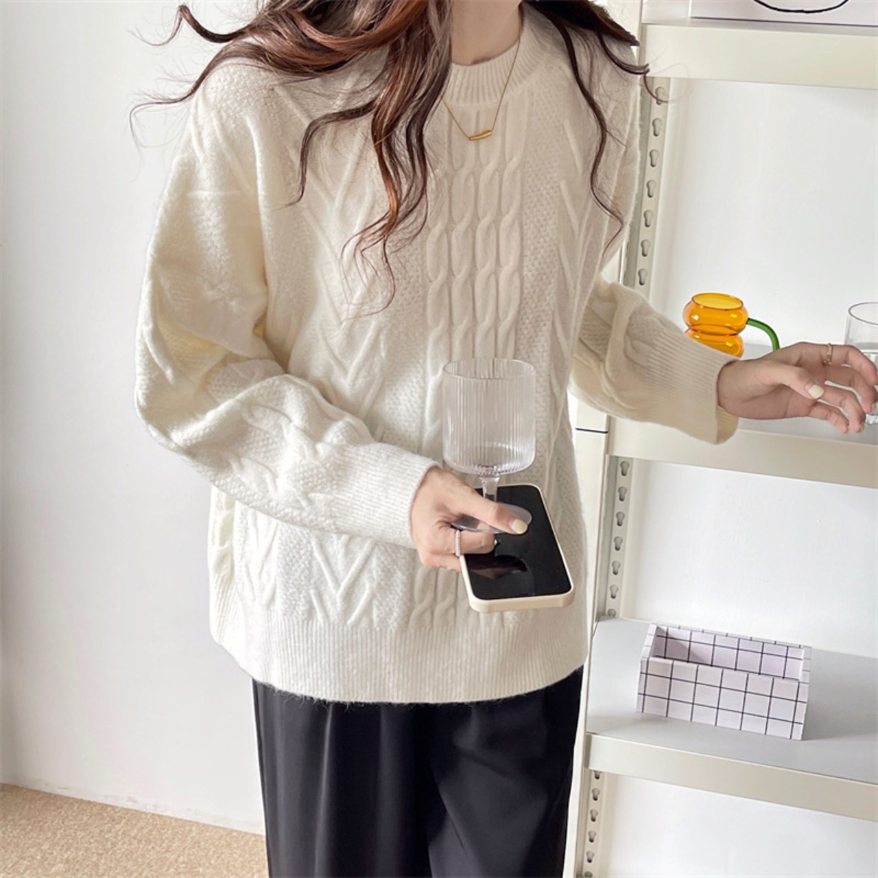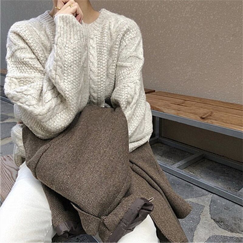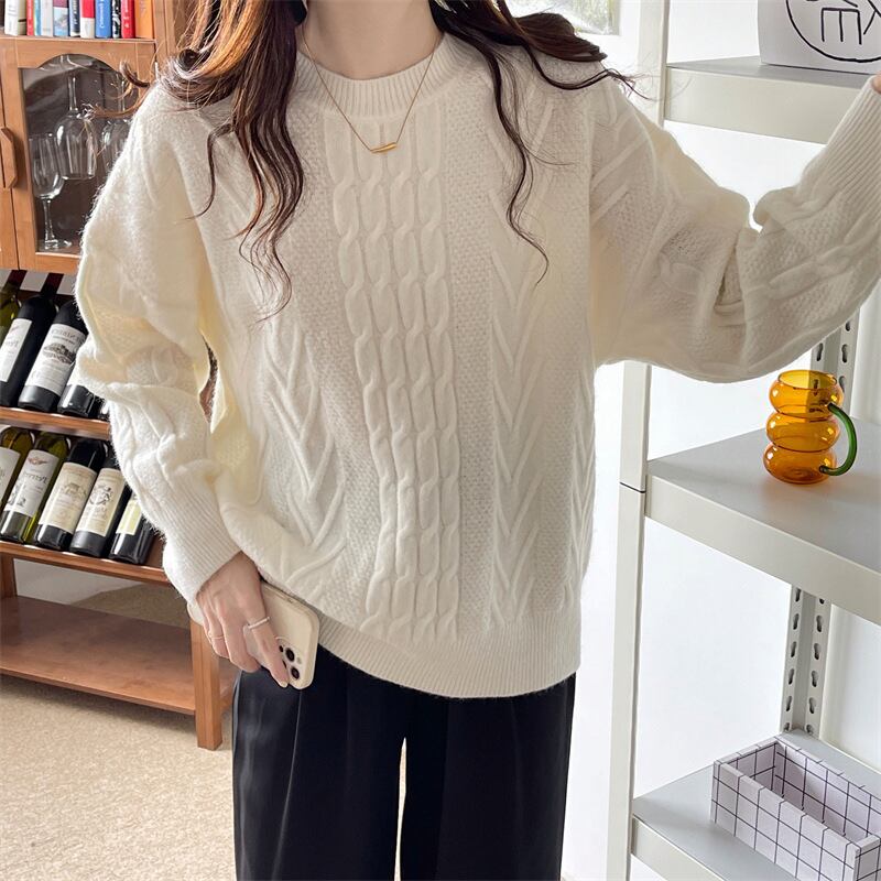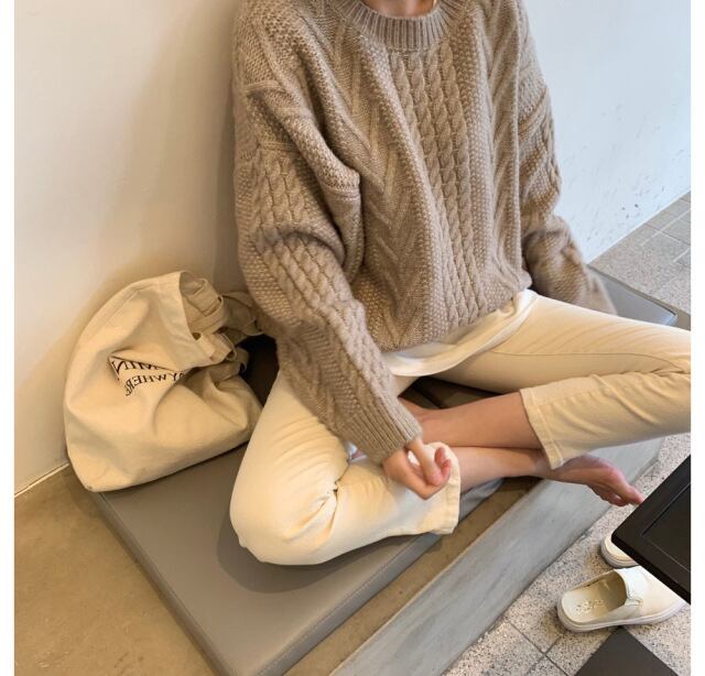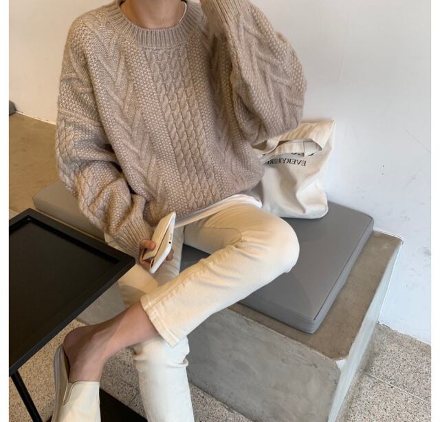 もっちりとした幾何学パターンのケーブル編みが可愛いビッグシルエットのセーターです。