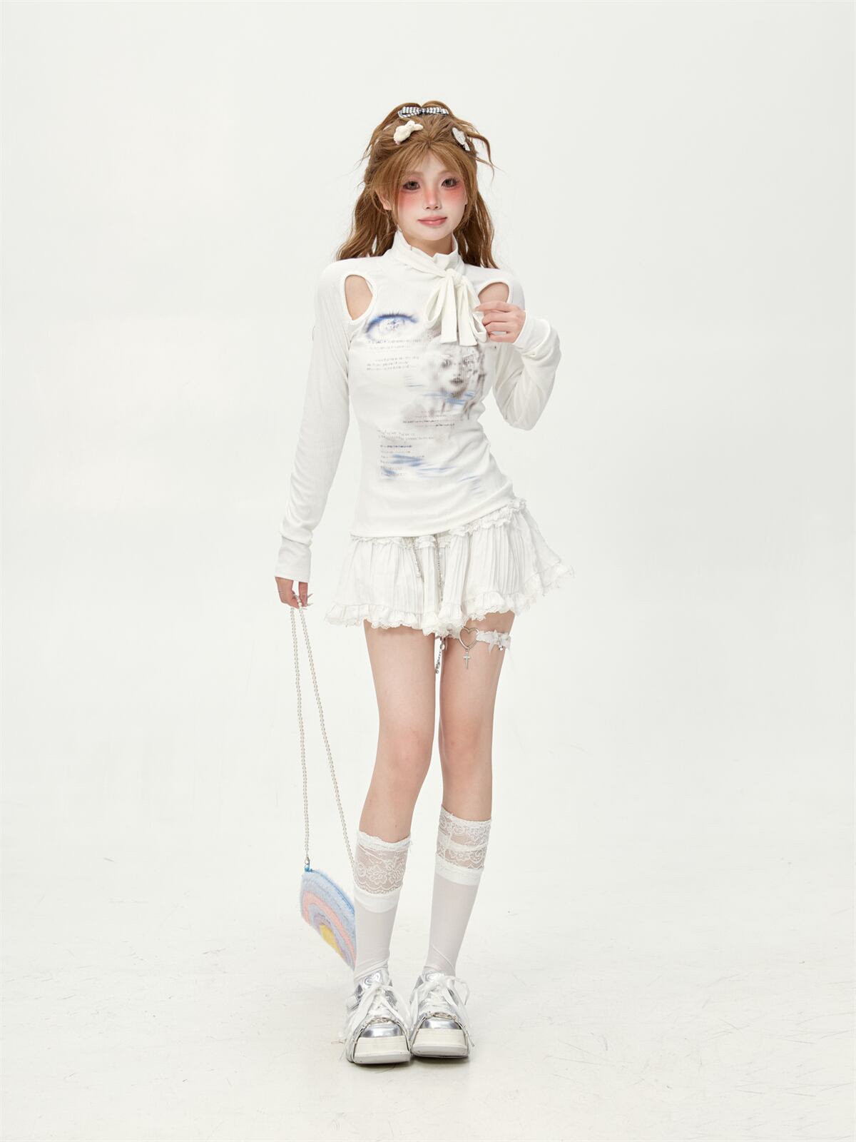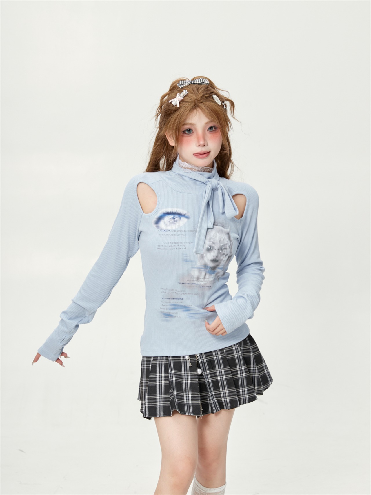 ベーシックなワントーンの細身トップスに淡いY2Kなプリントが映えるデザインで、女性らしいボディラインを引き立てます。さらに、可愛らしいロングスリーブのディテールが、上品でお洒落な雰囲気を演出します。さり気なくデコルテを露出するデザインが個性的で、女性らしさとこなれ感をプラスしてくれます。