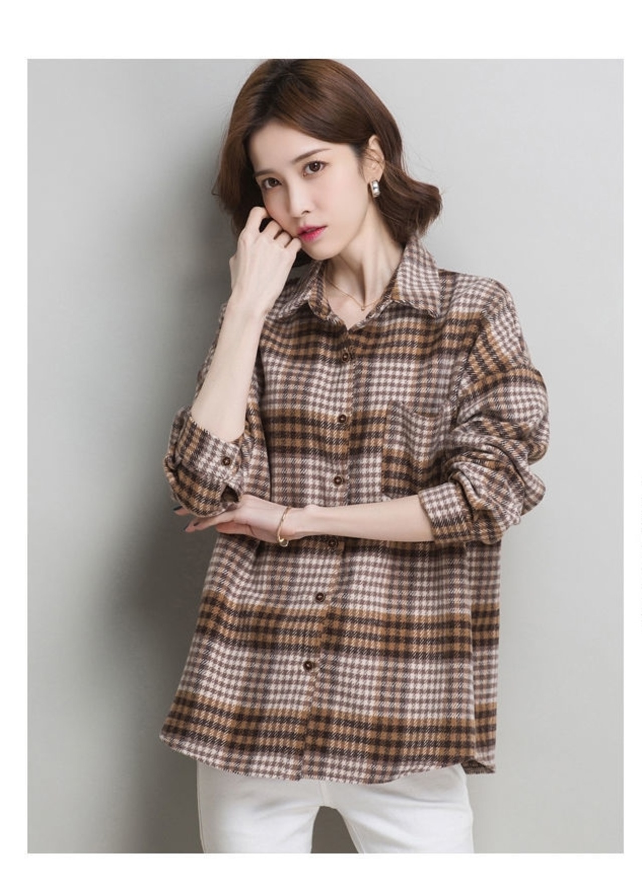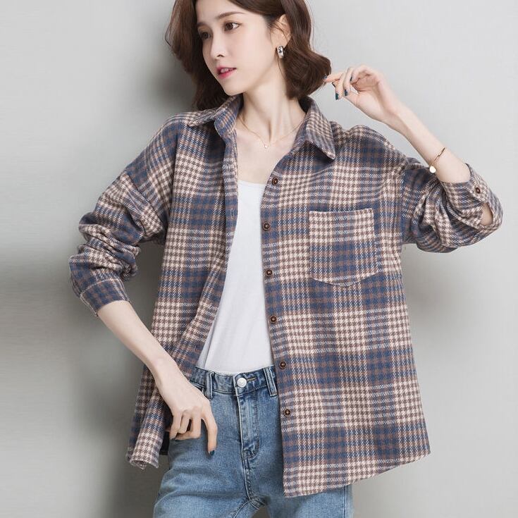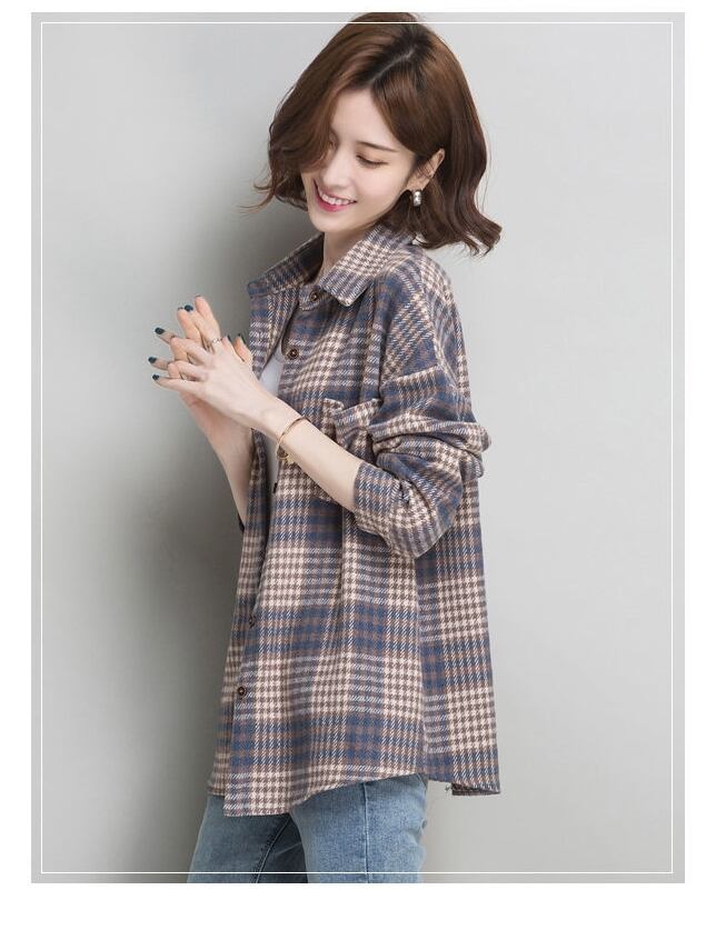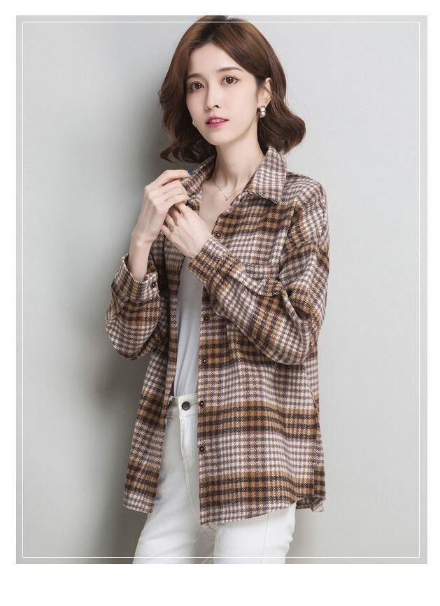 起毛感のある絶妙な色味のレトロなチェックパターンが可愛い、着回しやすいおしゃれなシャツブラウスです。