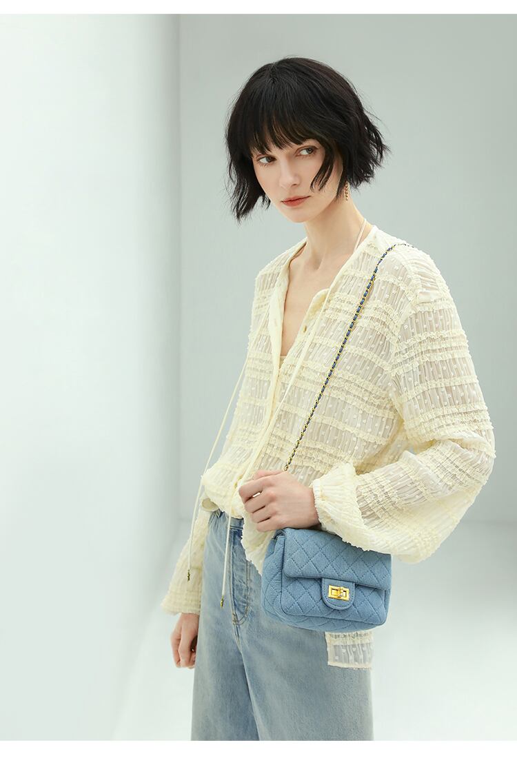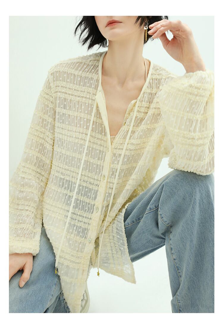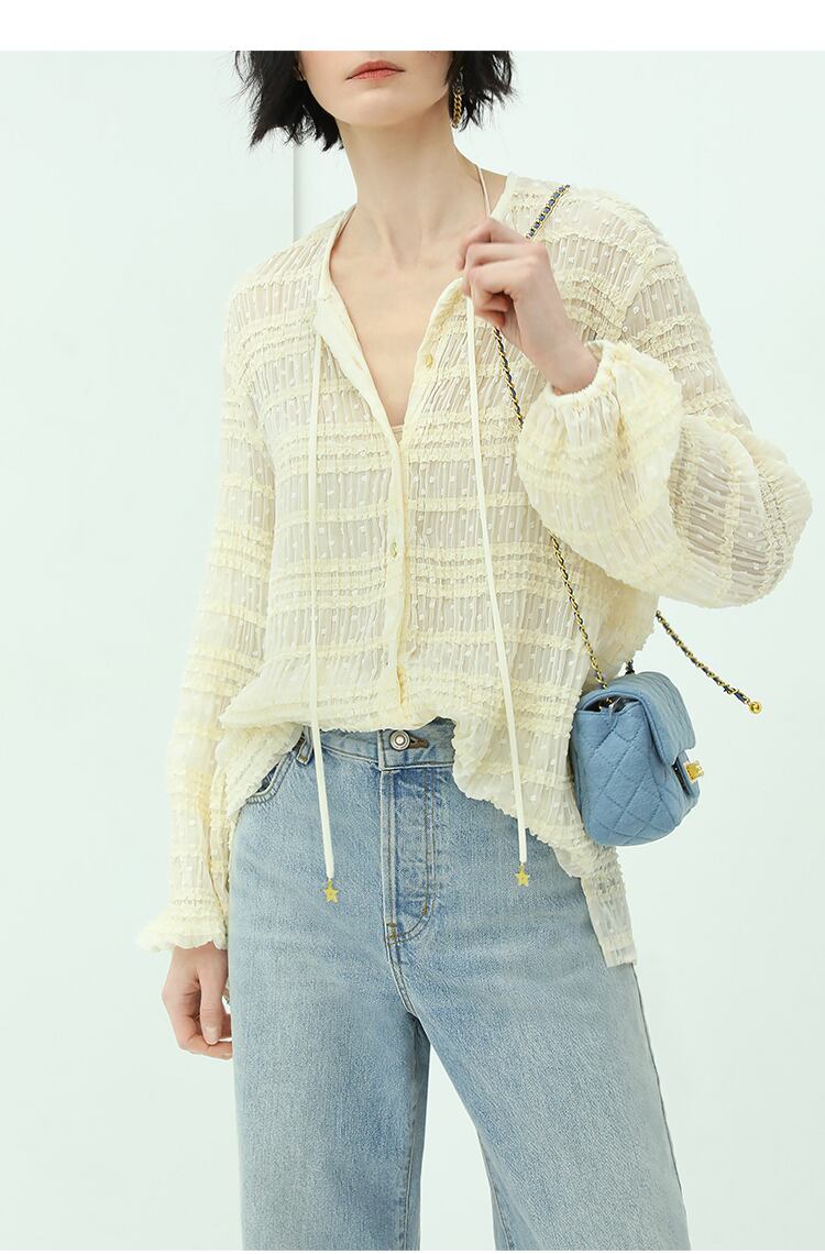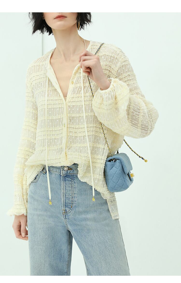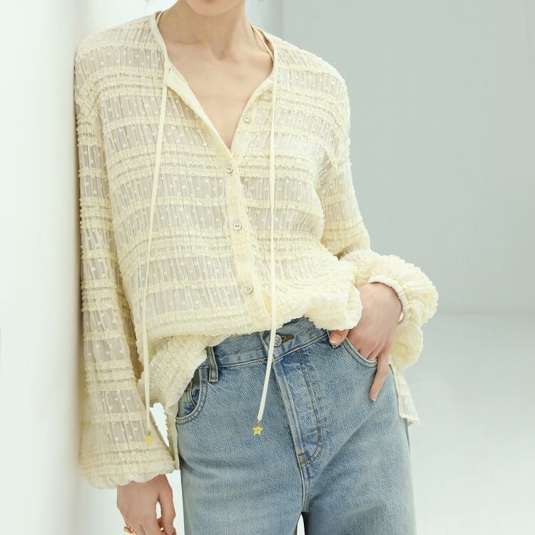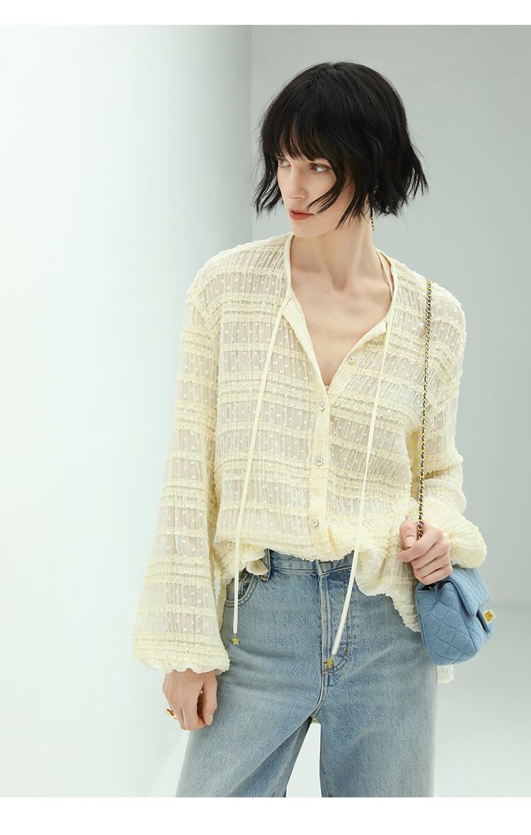 ボウタイ付きの前開きで着脱も簡単で裾を結んでアレンジも楽しめます。パフスリーブが女性らしさを引き立て、レトロな雰囲気も漂います。大人可愛い印象で、シンプルさと上品さを兼ね備えたデザイン。