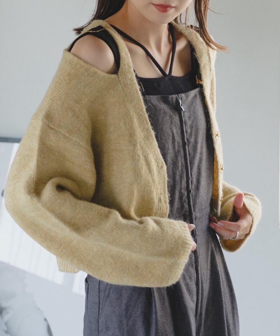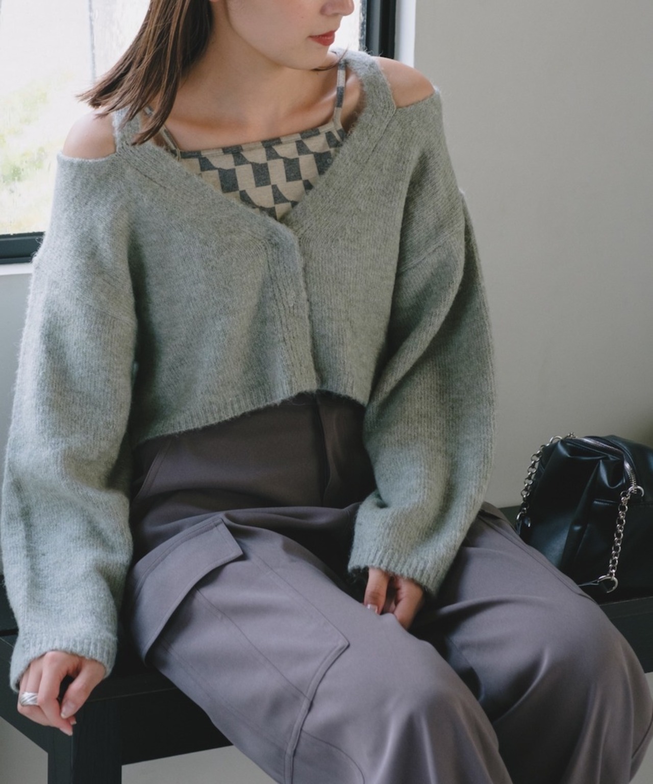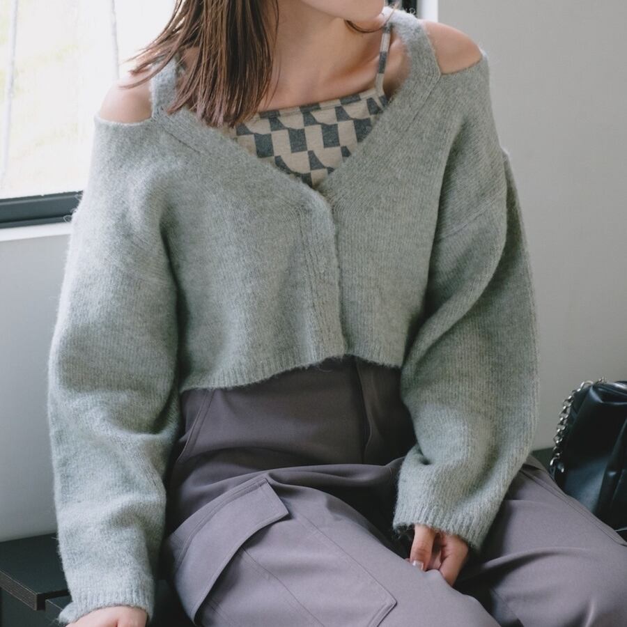 オープンショルダー風のこなれ感を演出するカットアウト入りの可愛いショート丈カーディガンです。