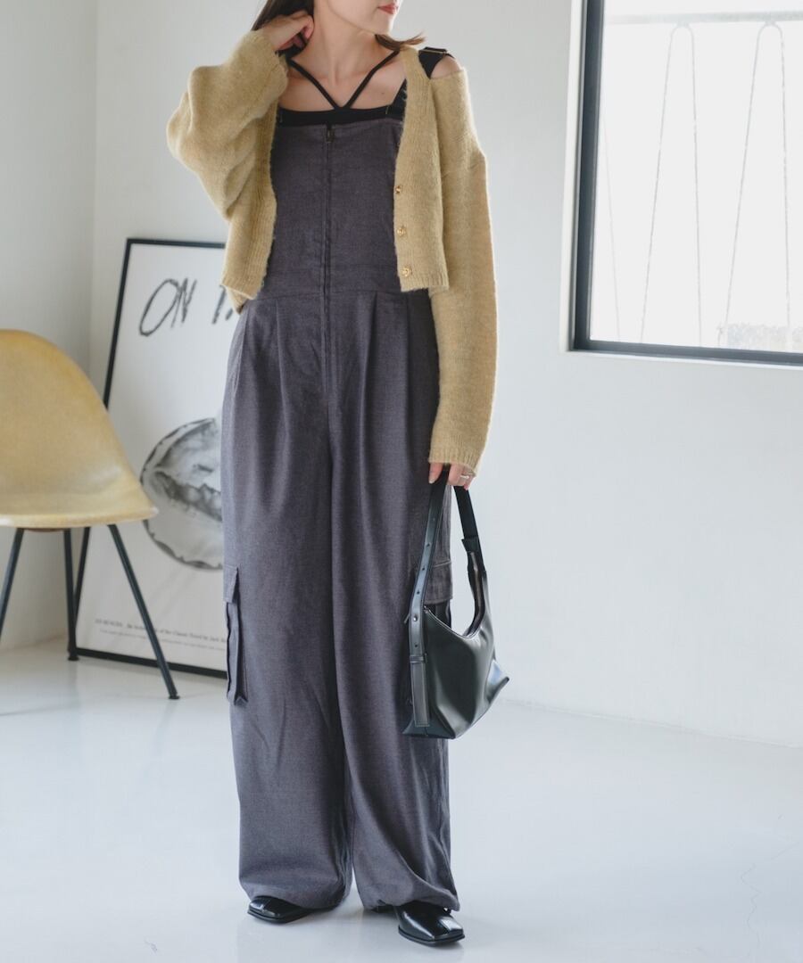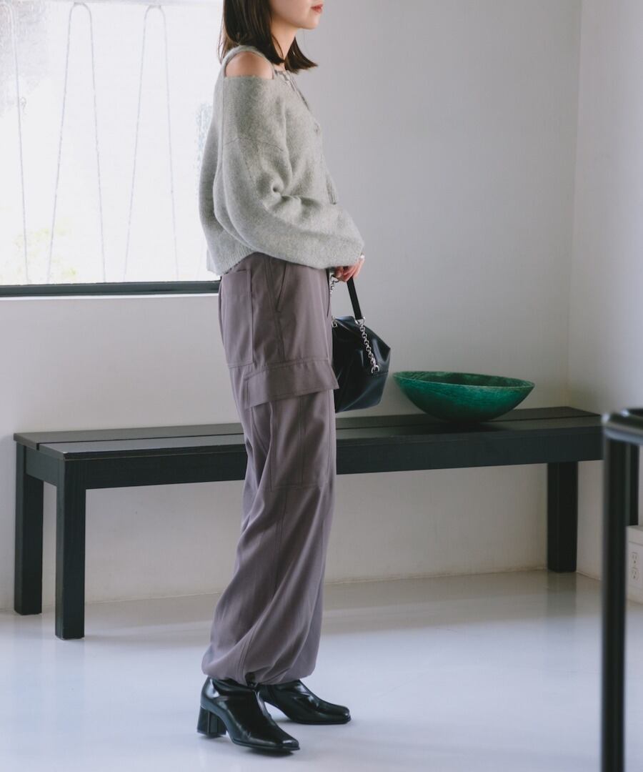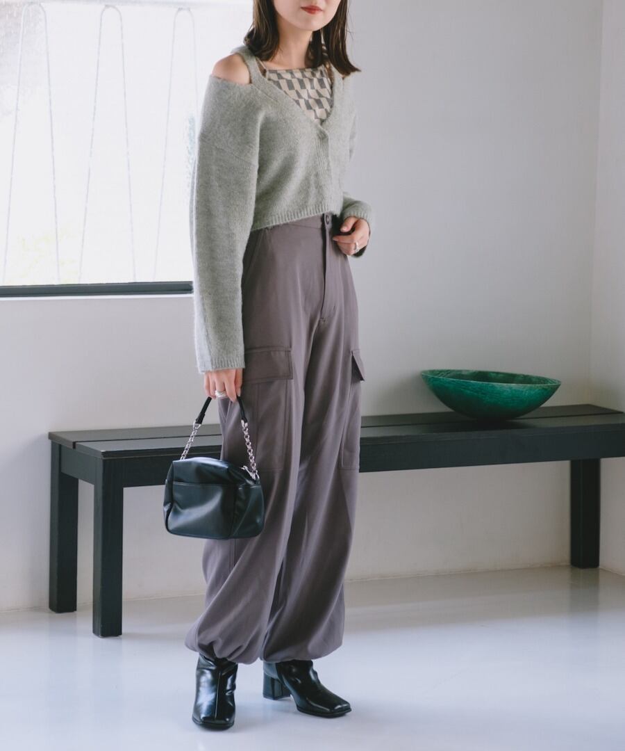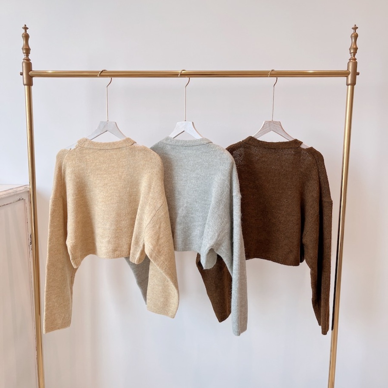 オープンショルダー風のこなれ感を演出するカットアウト入りの可愛いショート丈カーディガンです。