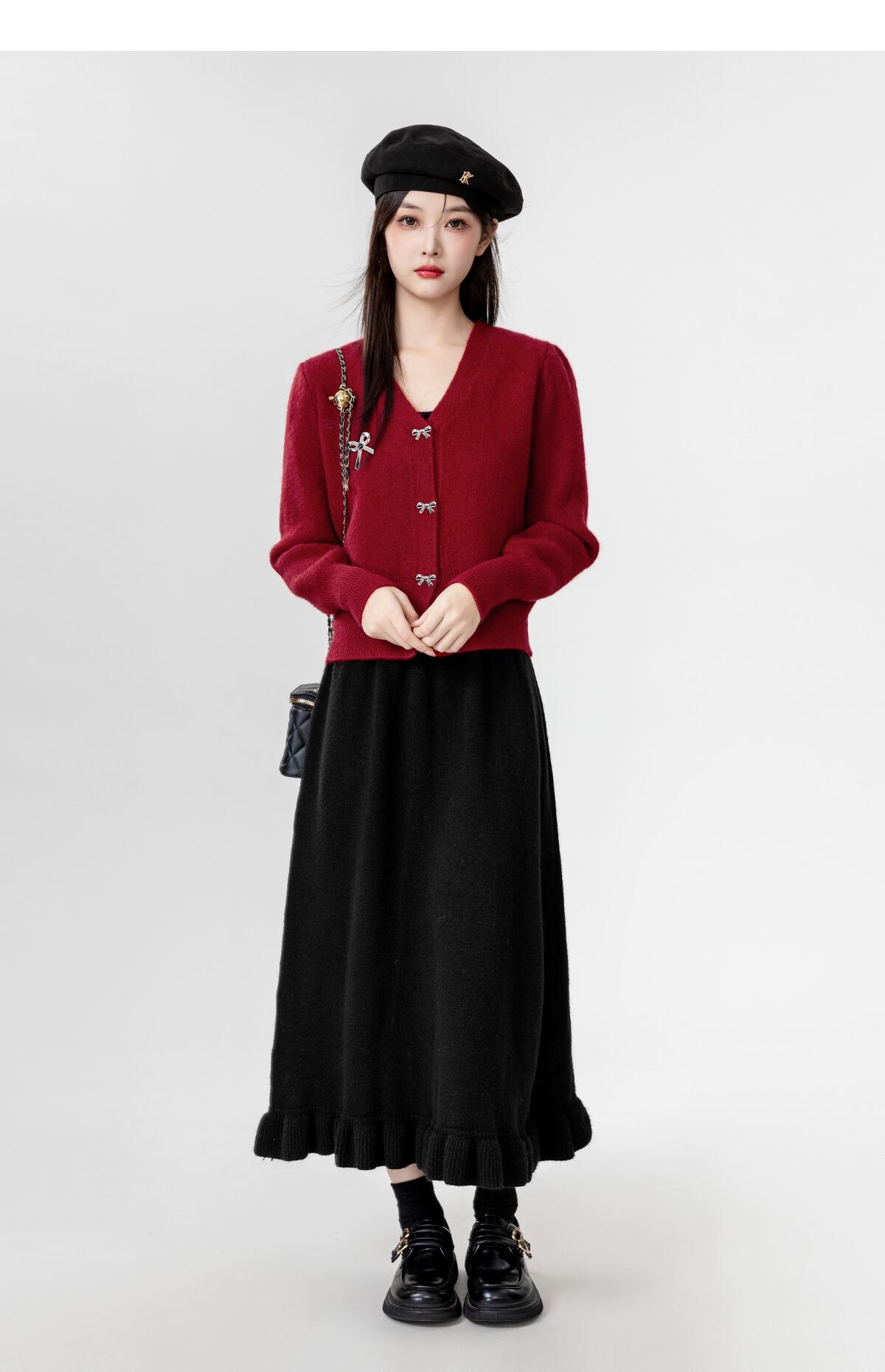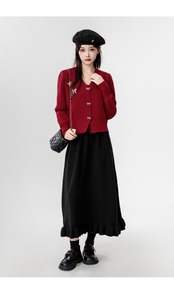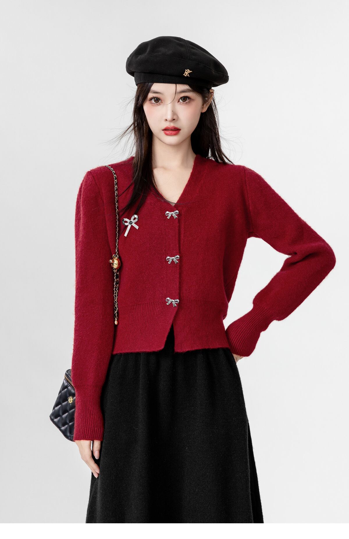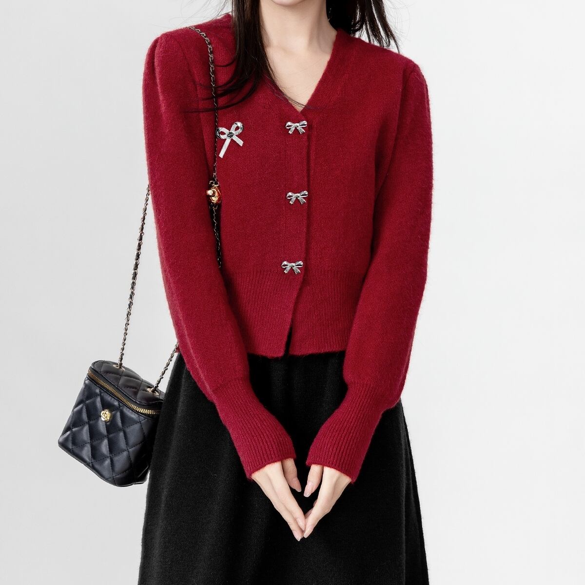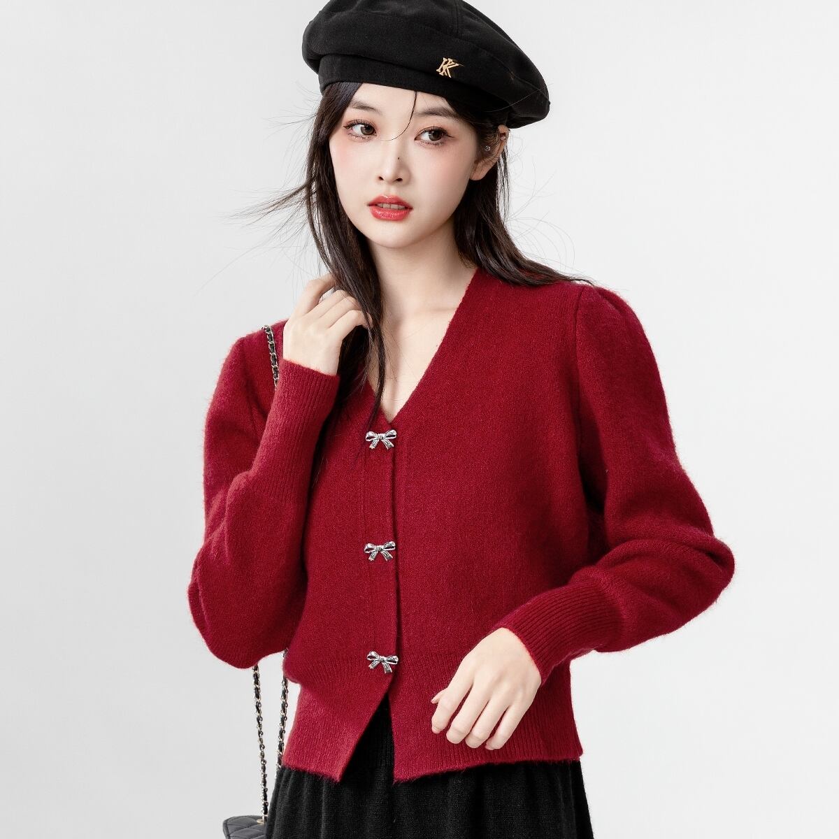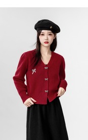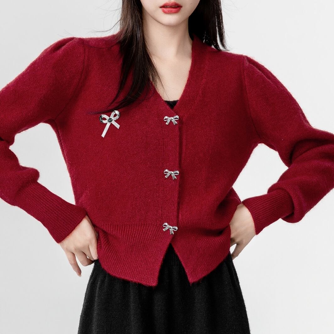 メタリックなリボンのボタンとワンポイントのモチーフが愛らしい、Vネックのカーディガントップスが登場しました!