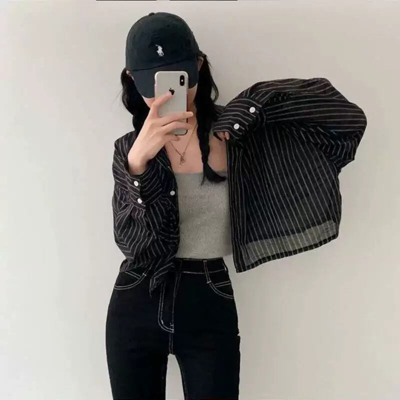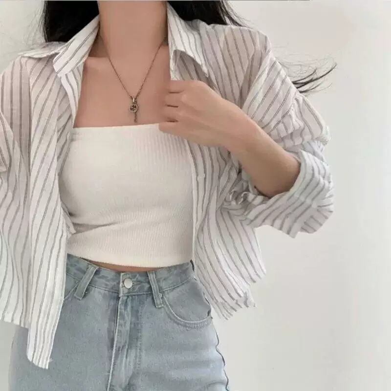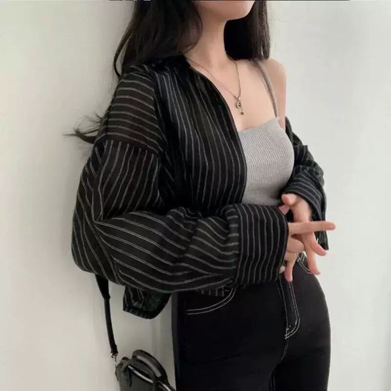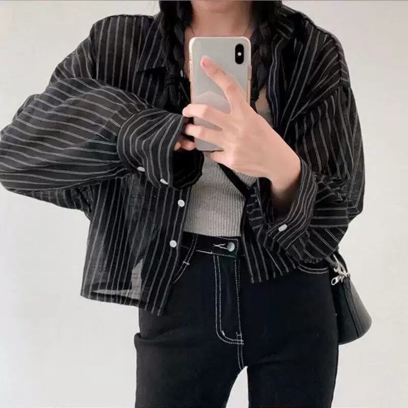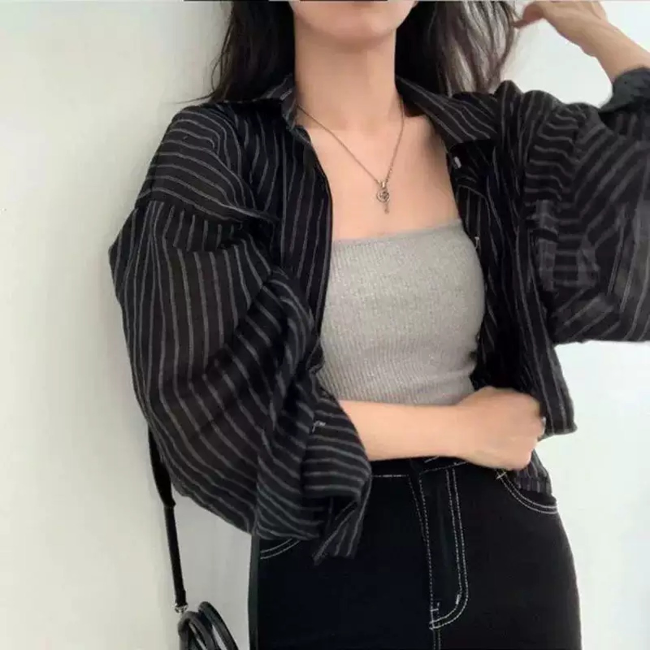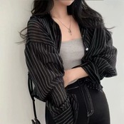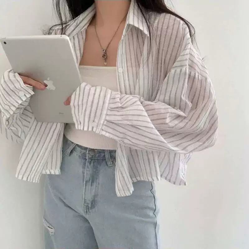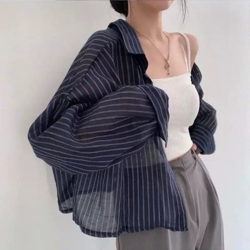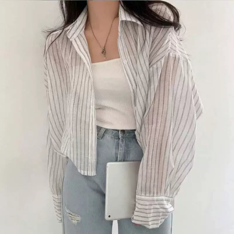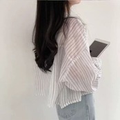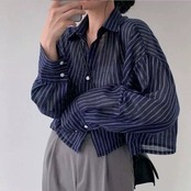 やや透け感のあるサラリとした生地で仕立てた爽やかなストライプブラウスです。