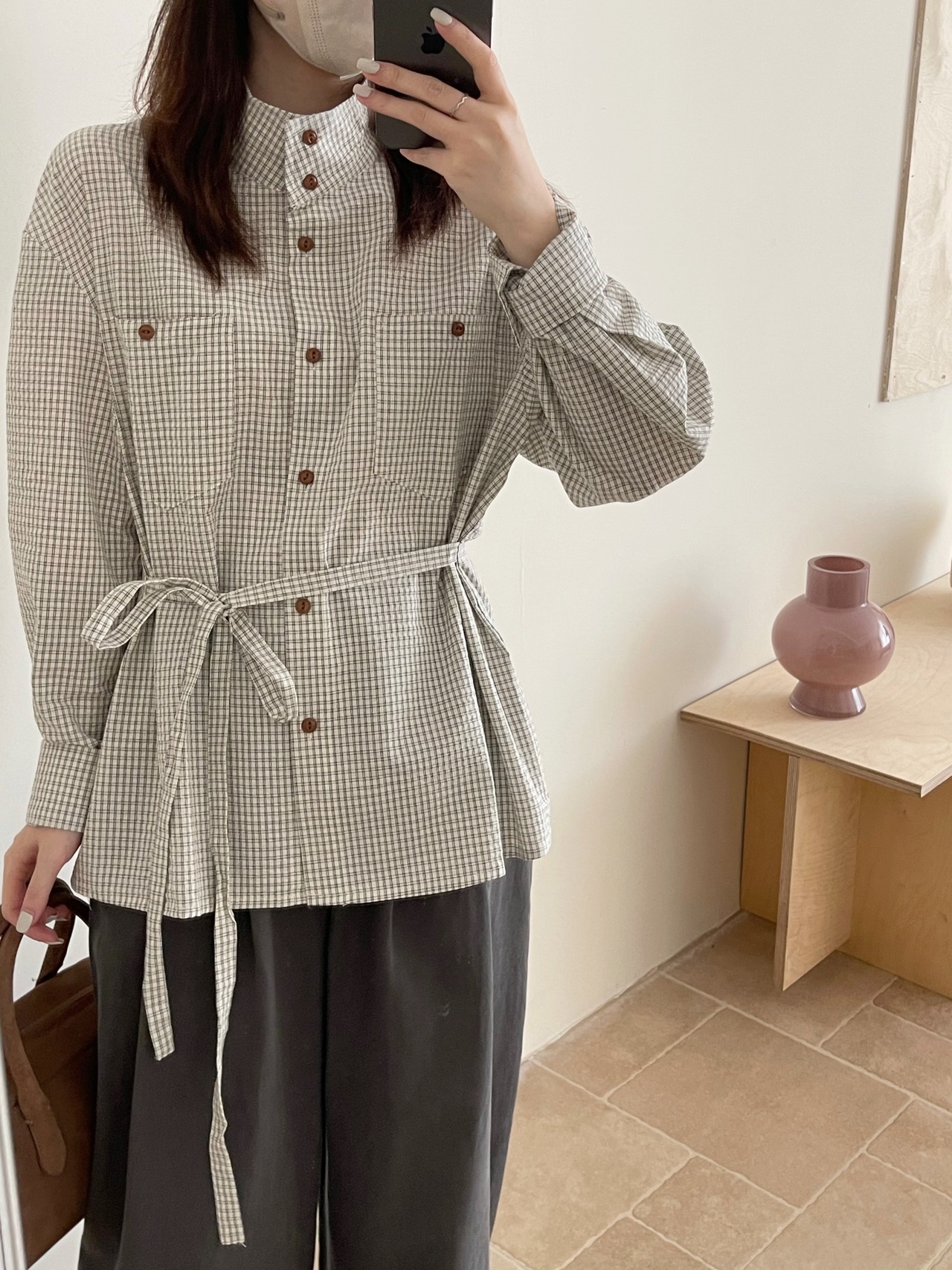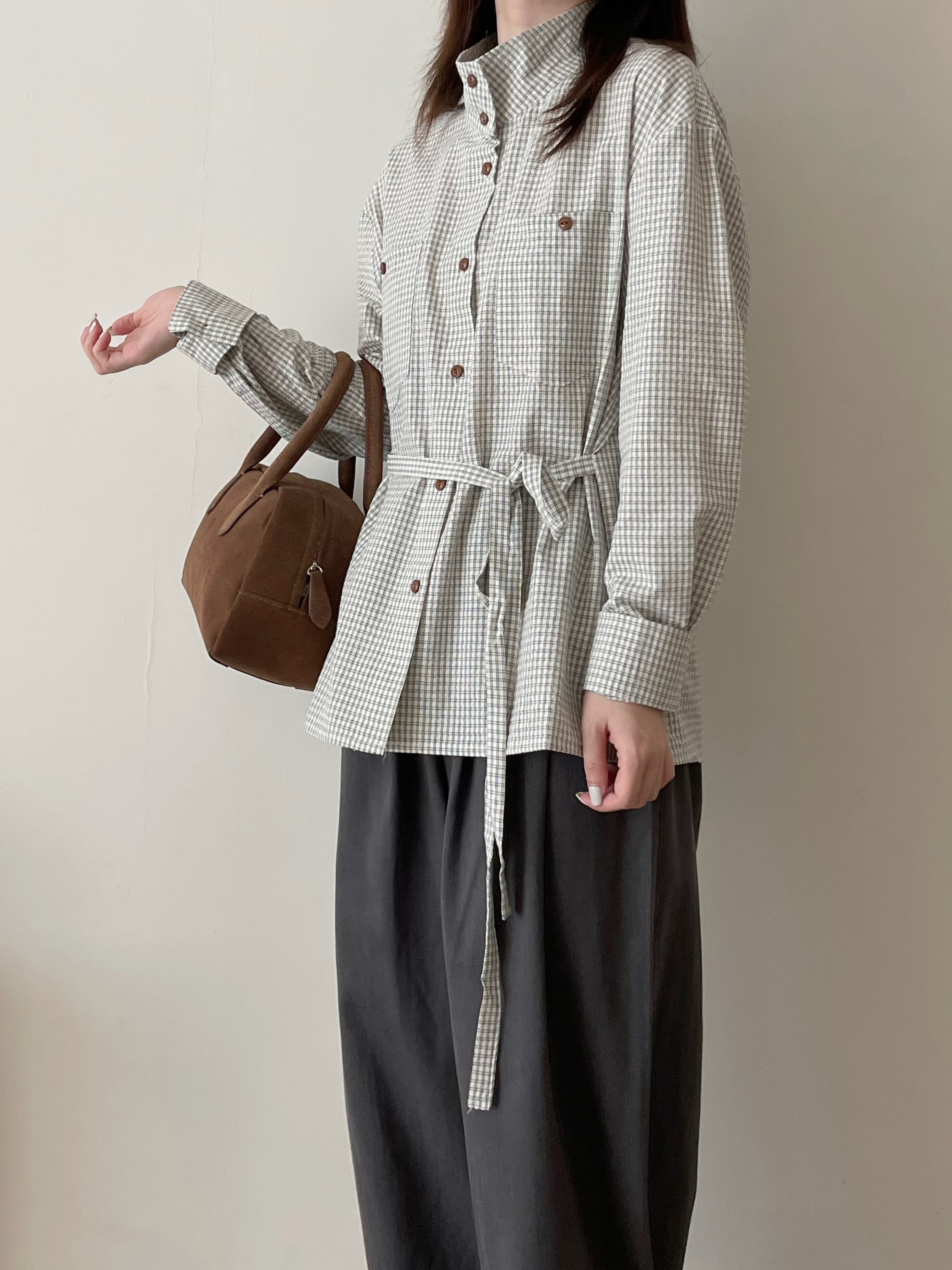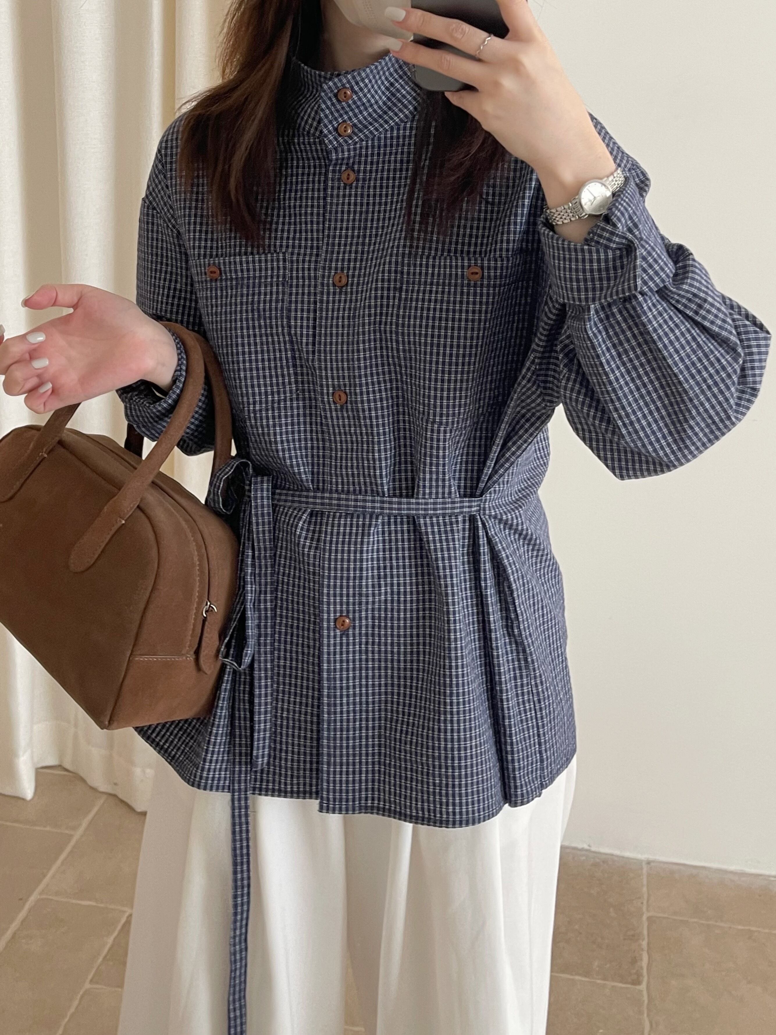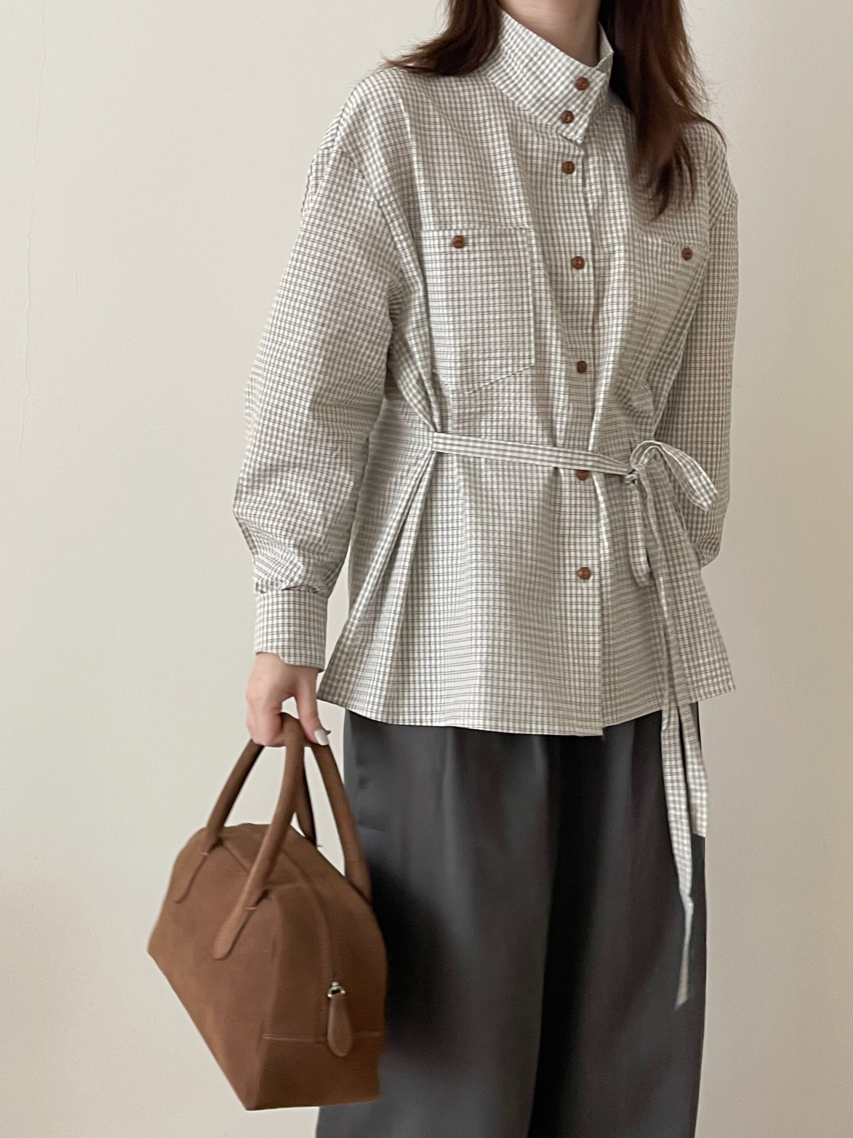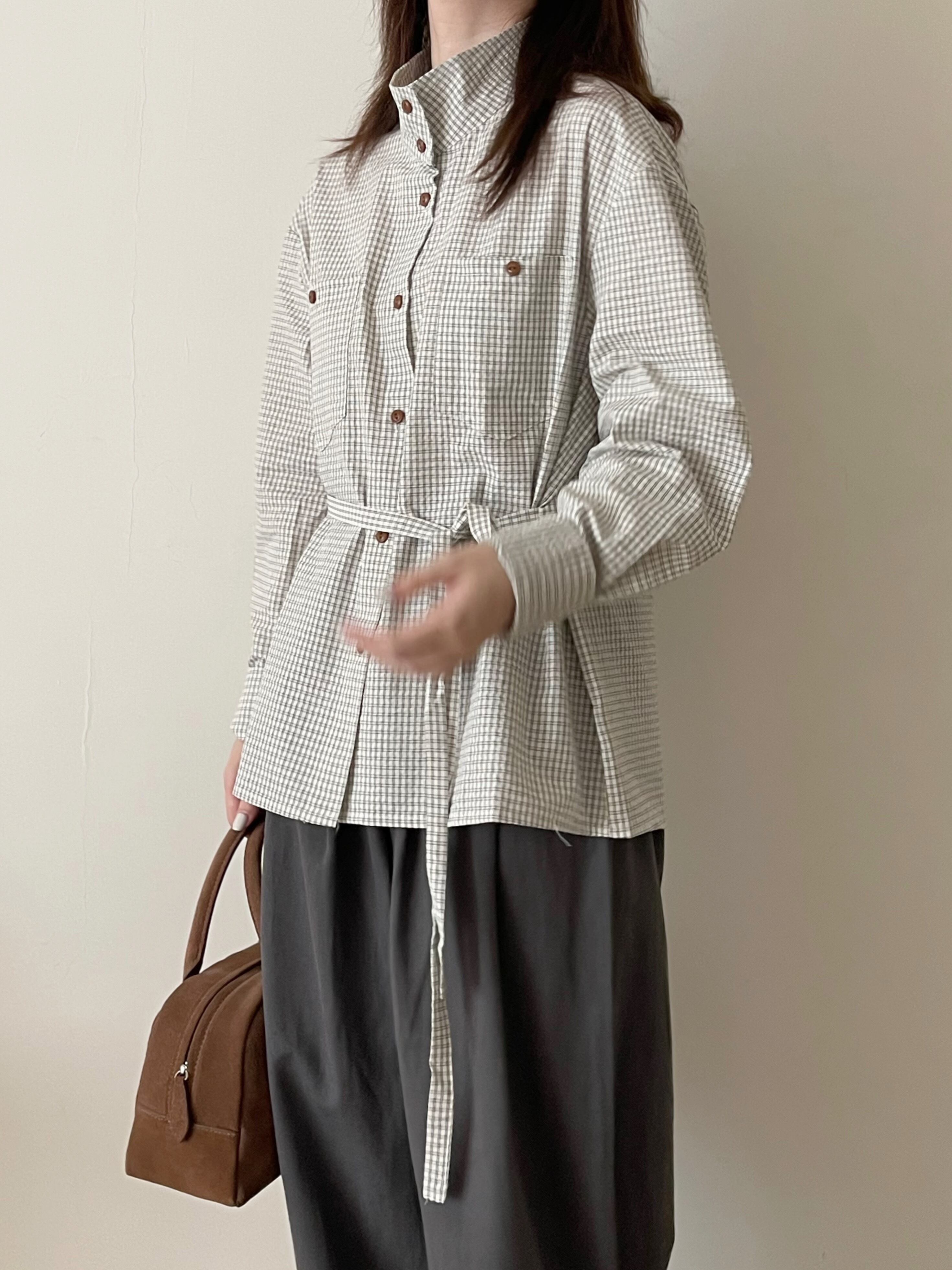 ジャケットのようなスタンドカラーがハンサムでこなれたチェック柄ブラウスです。