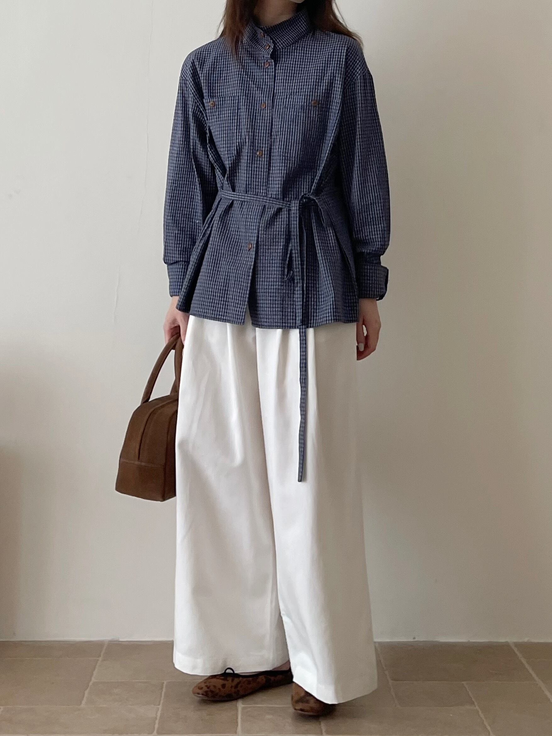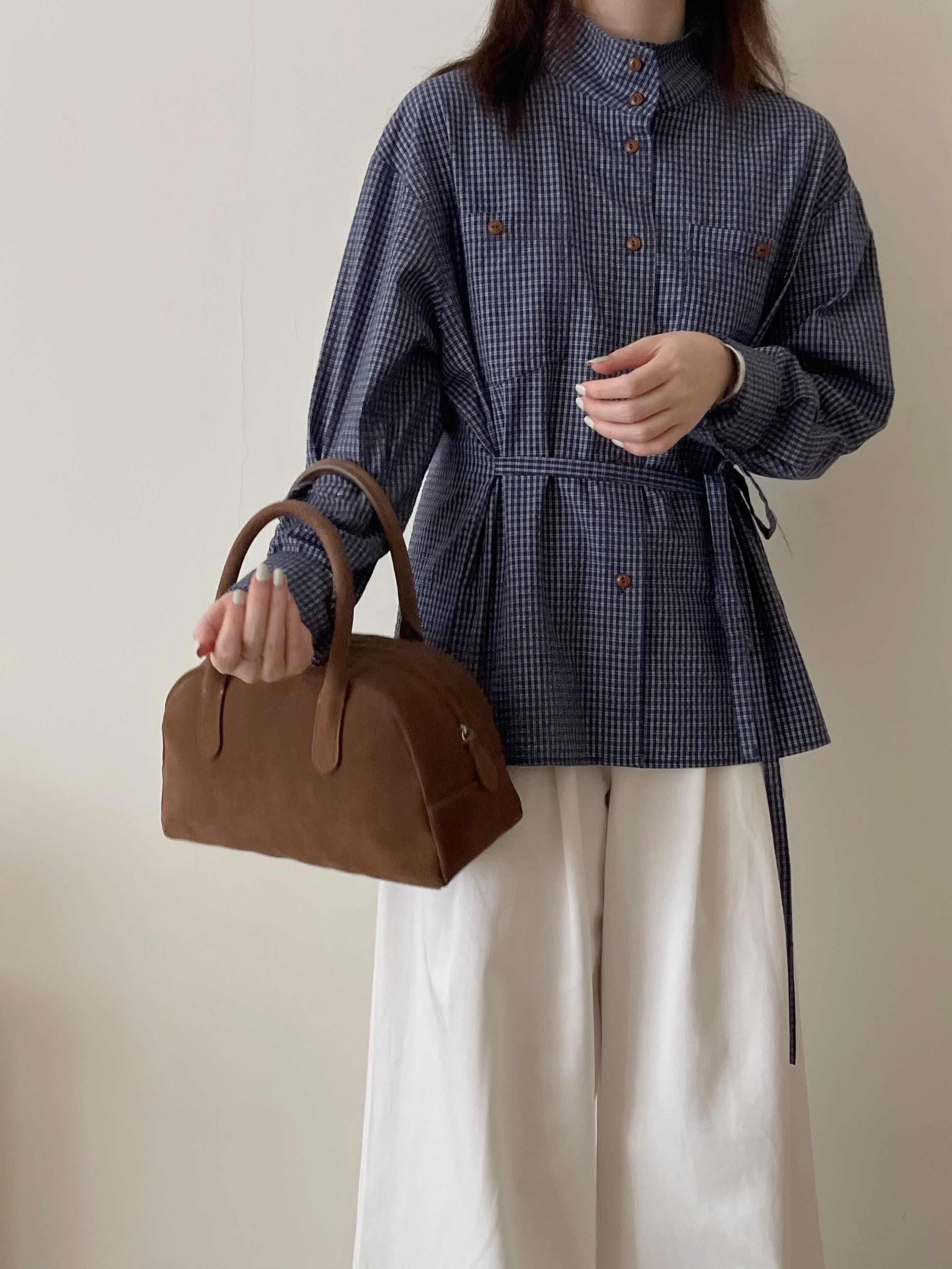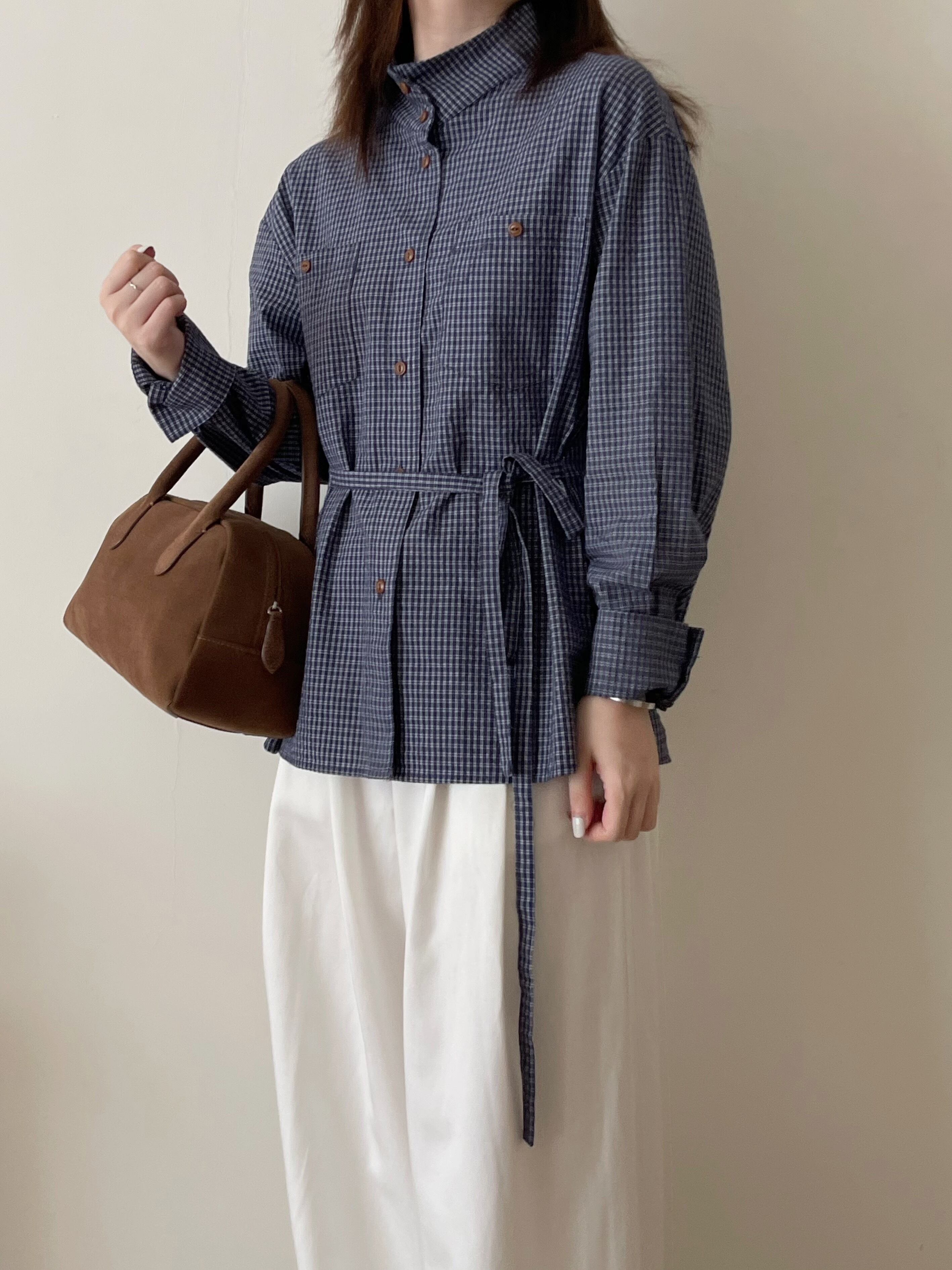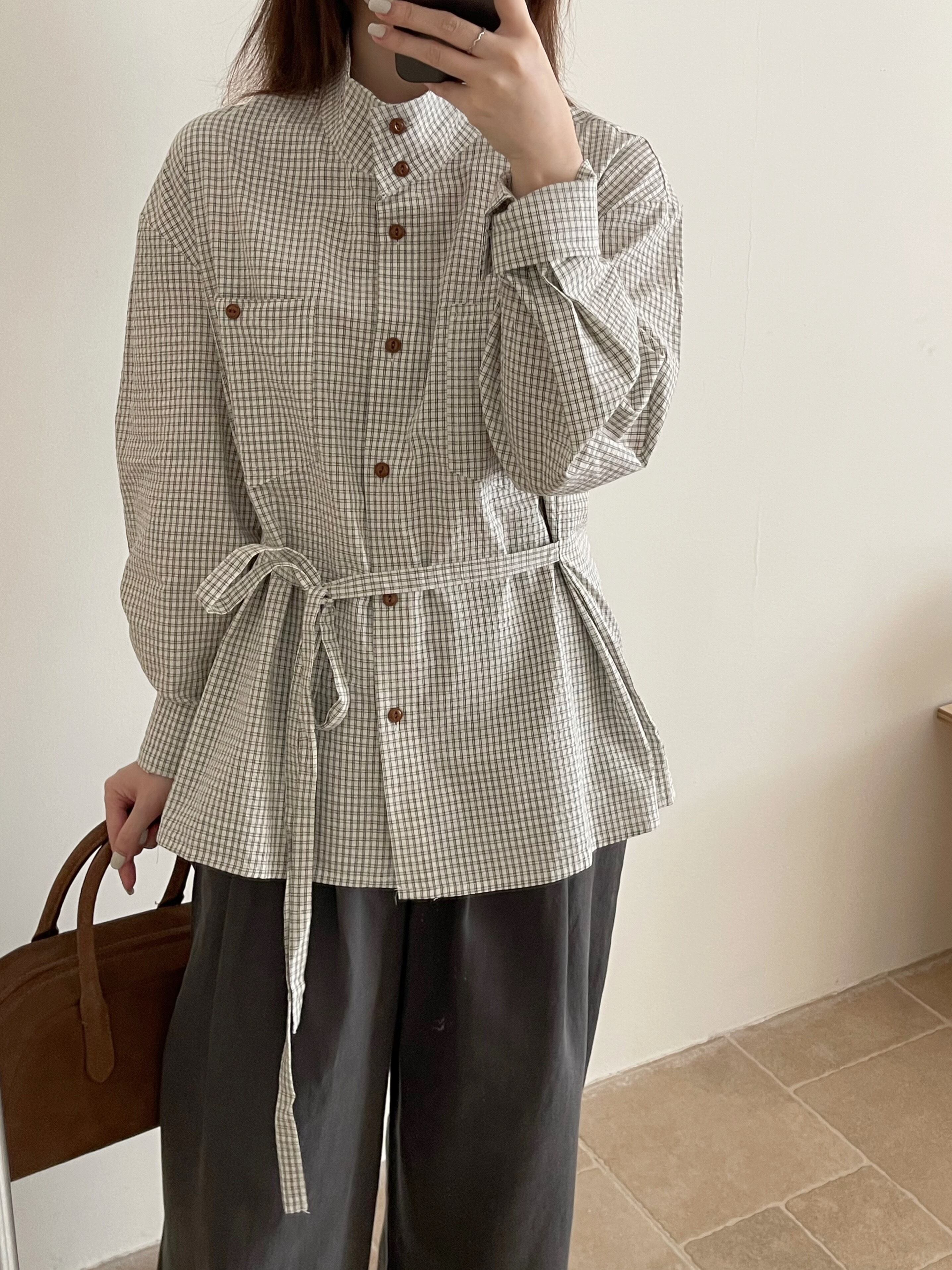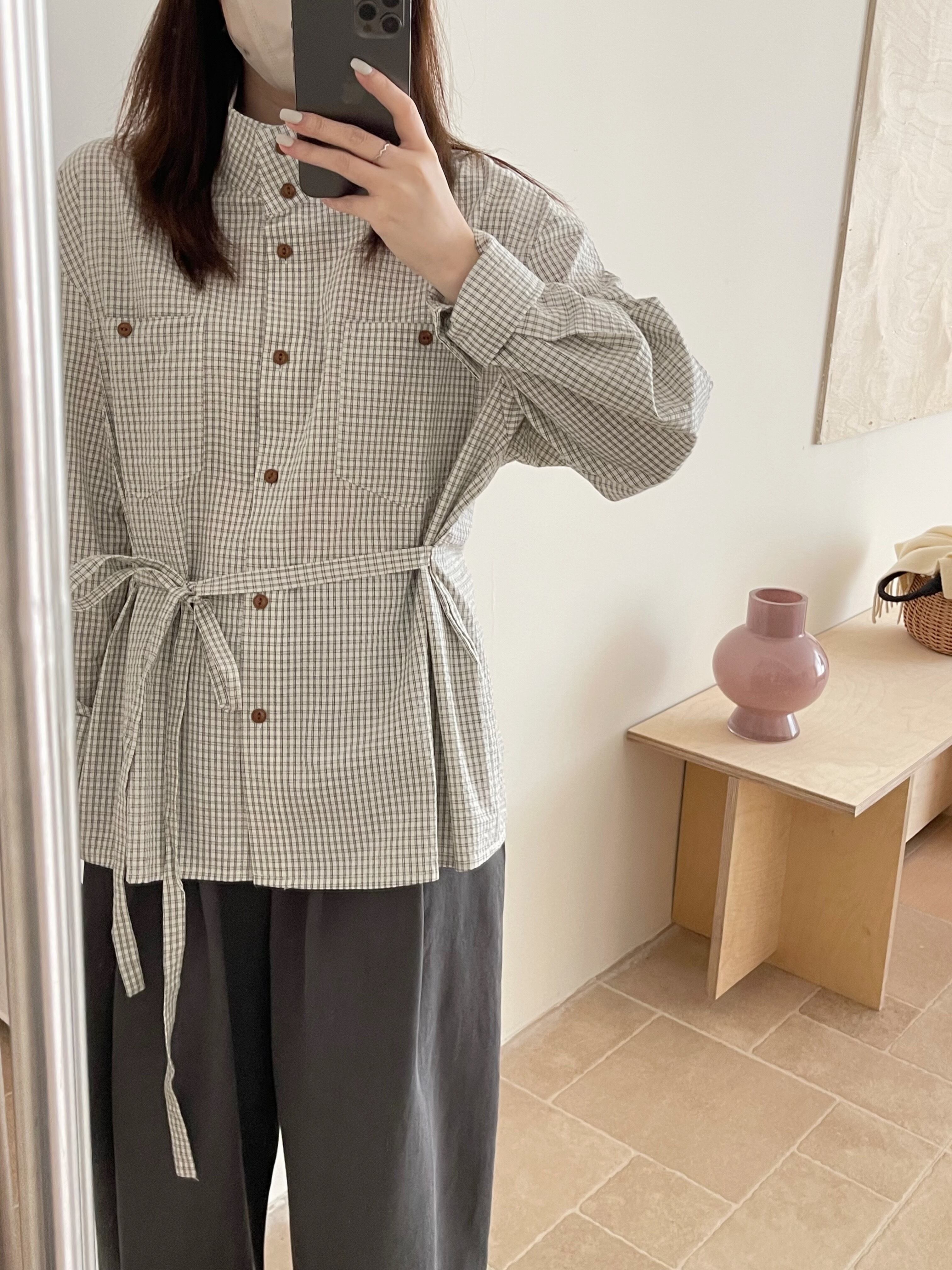 ジャケットのようなスタンドカラーがハンサムでこなれたチェック柄ブラウスです。