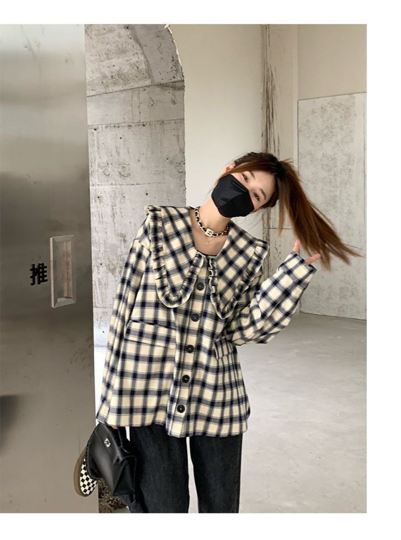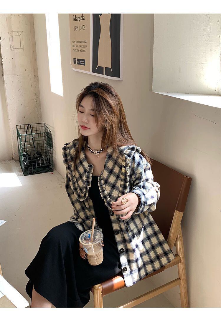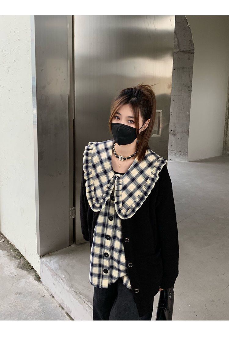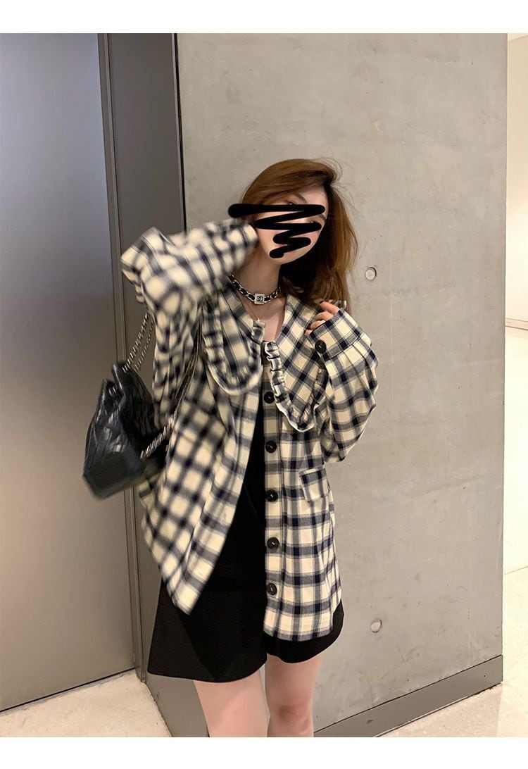 大きなフリル付きのドーリーなラージカラーが可愛い襟コンシャスなチェック柄ブラウスです。