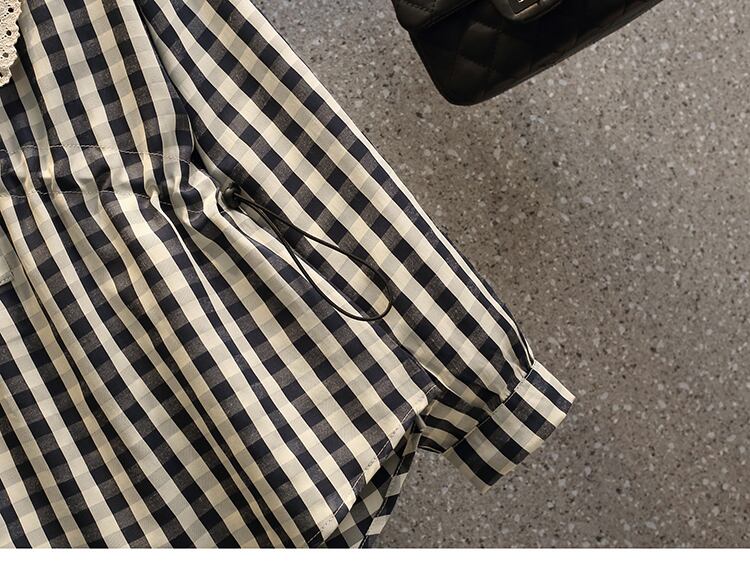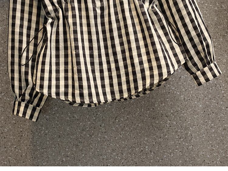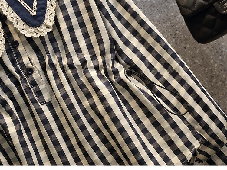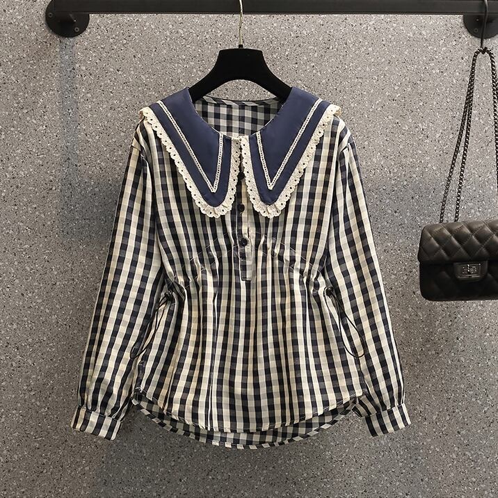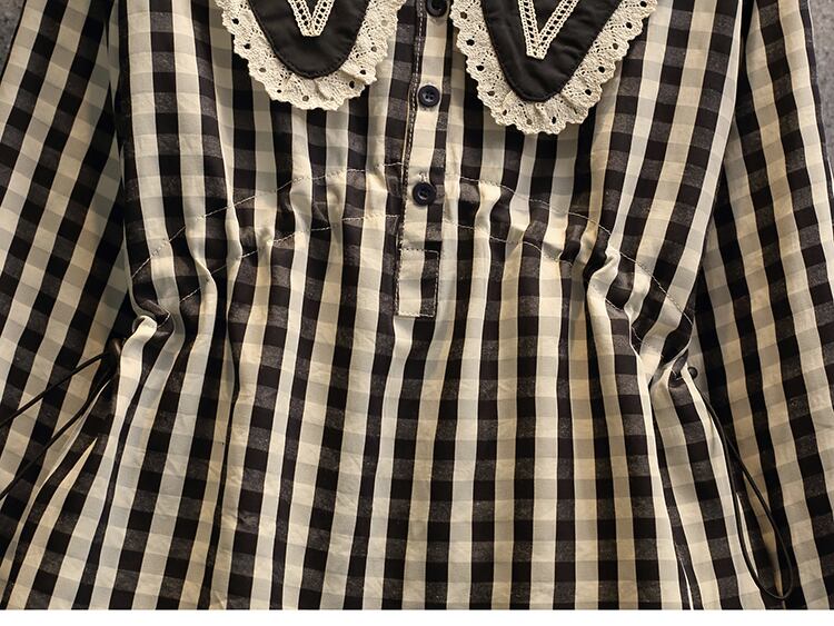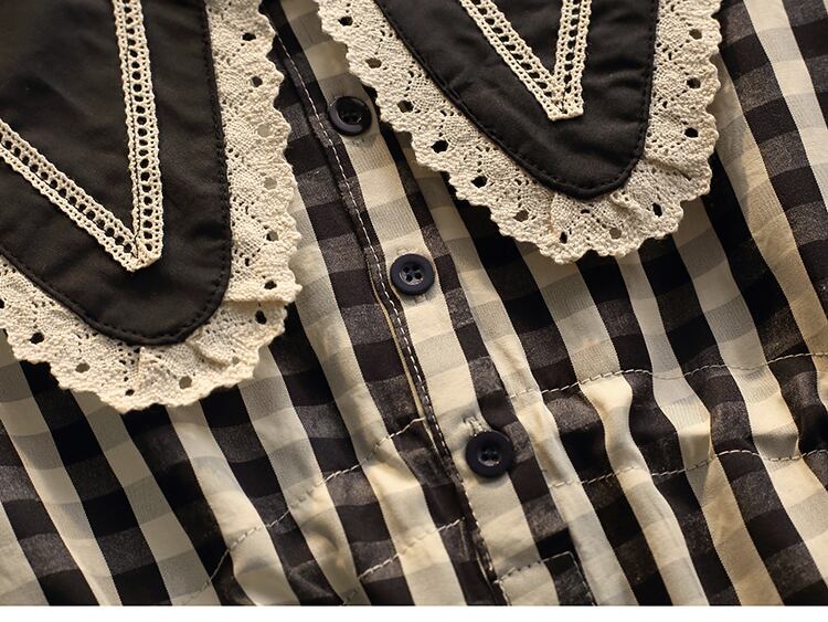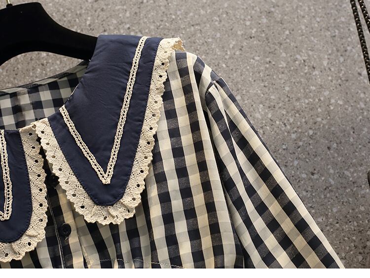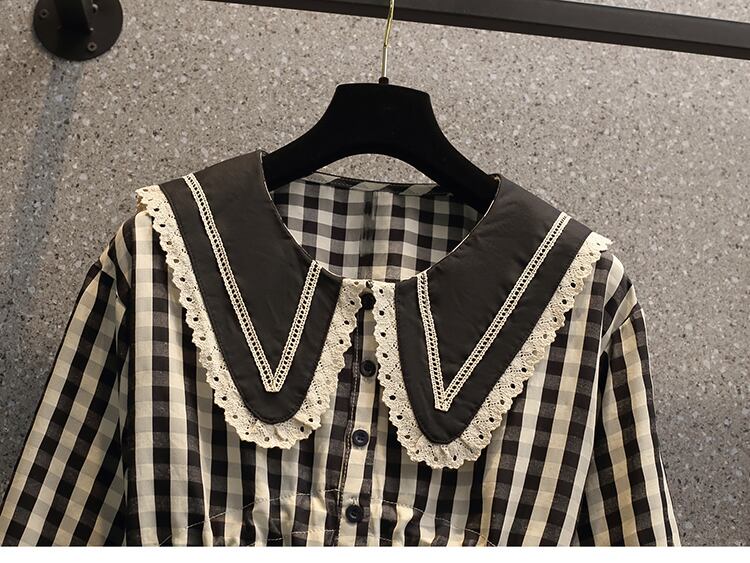フリル付きでドーリーなラージカラーが可愛い、襟コンシャスなチェック柄ブラウスです。