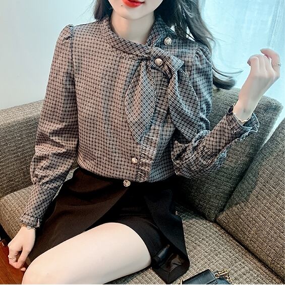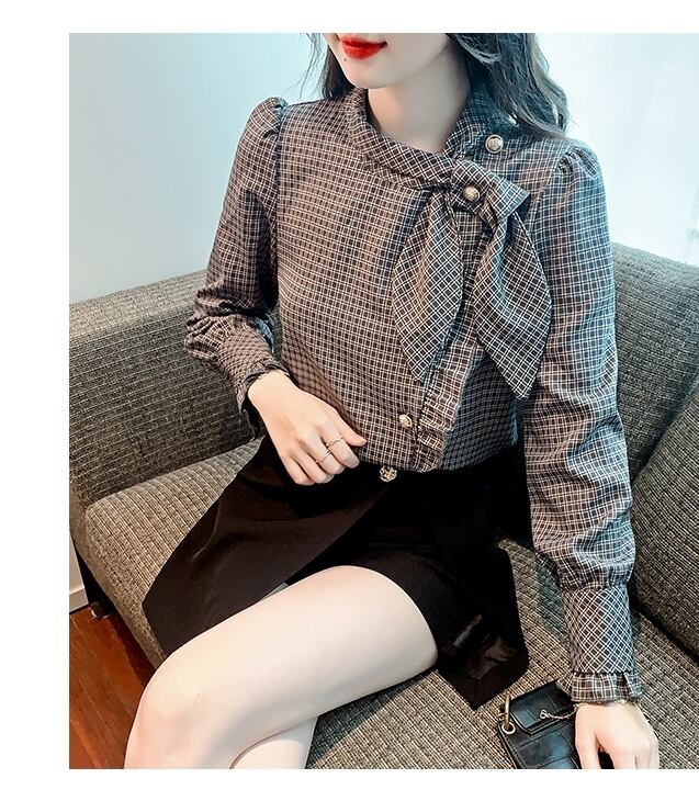 アシンメトリーなネクタイ付きのチェック柄シャツブラウスです。
