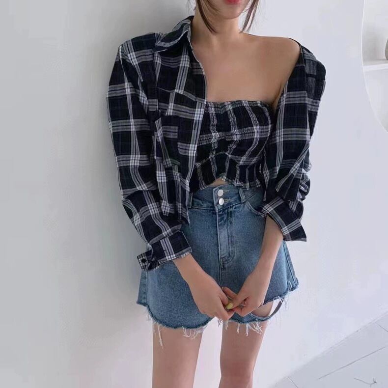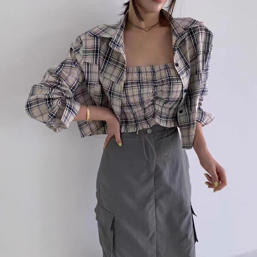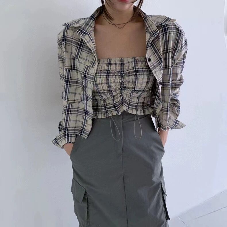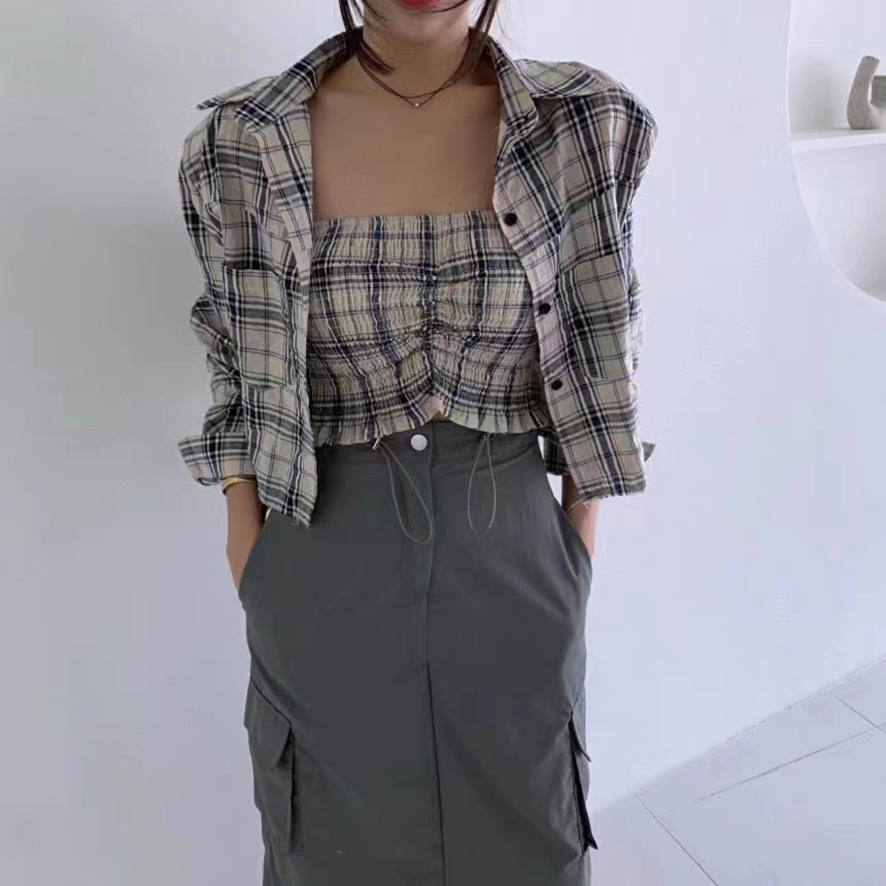 淡くレトロな配色のチェックパターンがこなれたブラウスとベアトップの2着セット。
