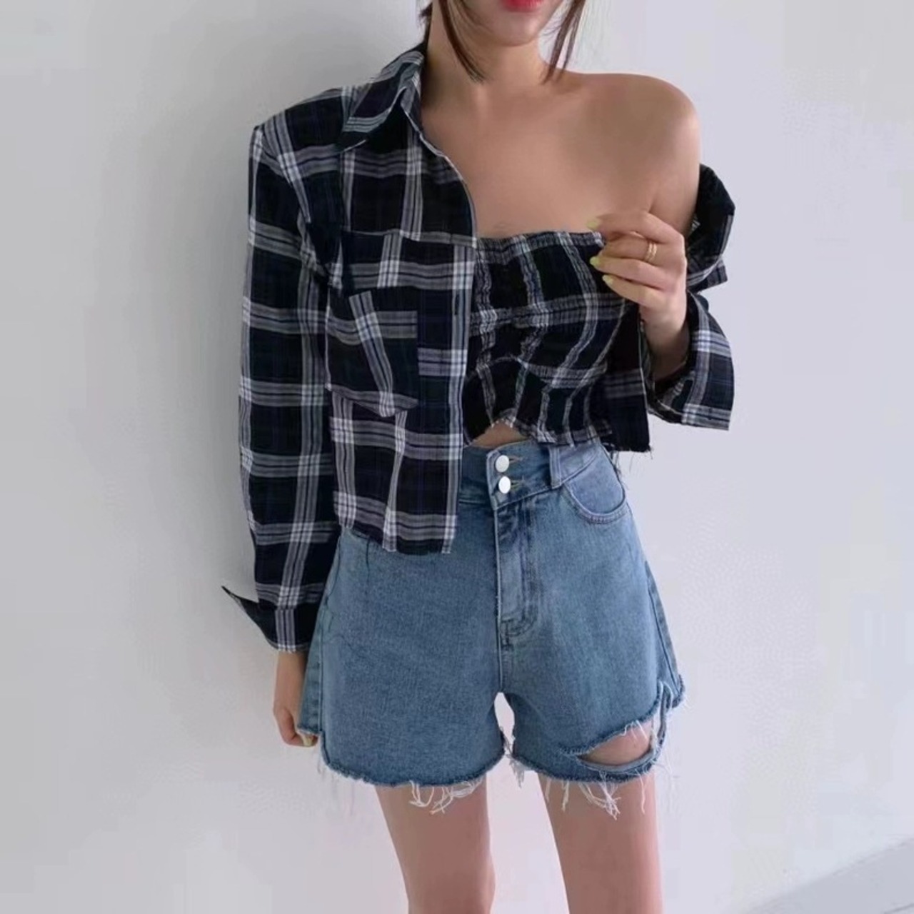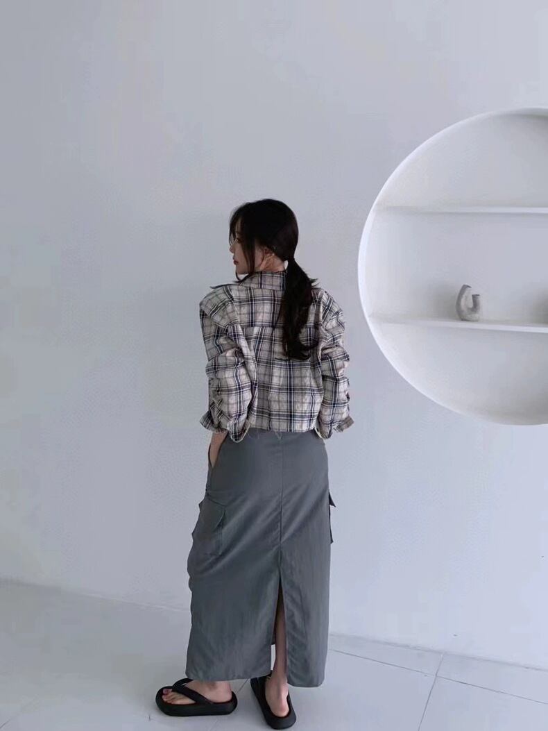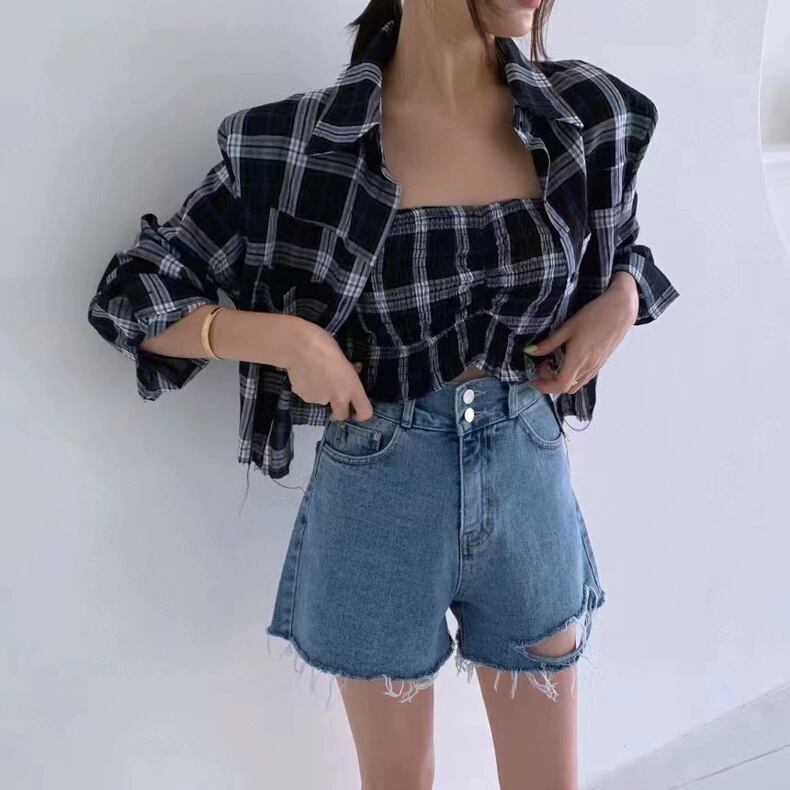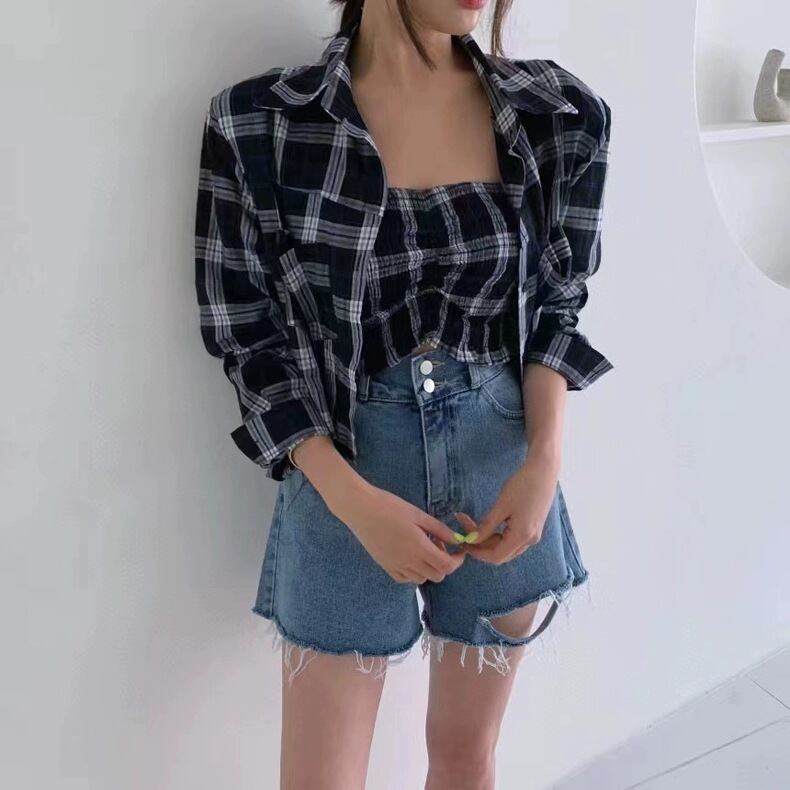 淡くレトロな配色のチェックパターンがこなれたブラウスとベアトップの2着セット。
