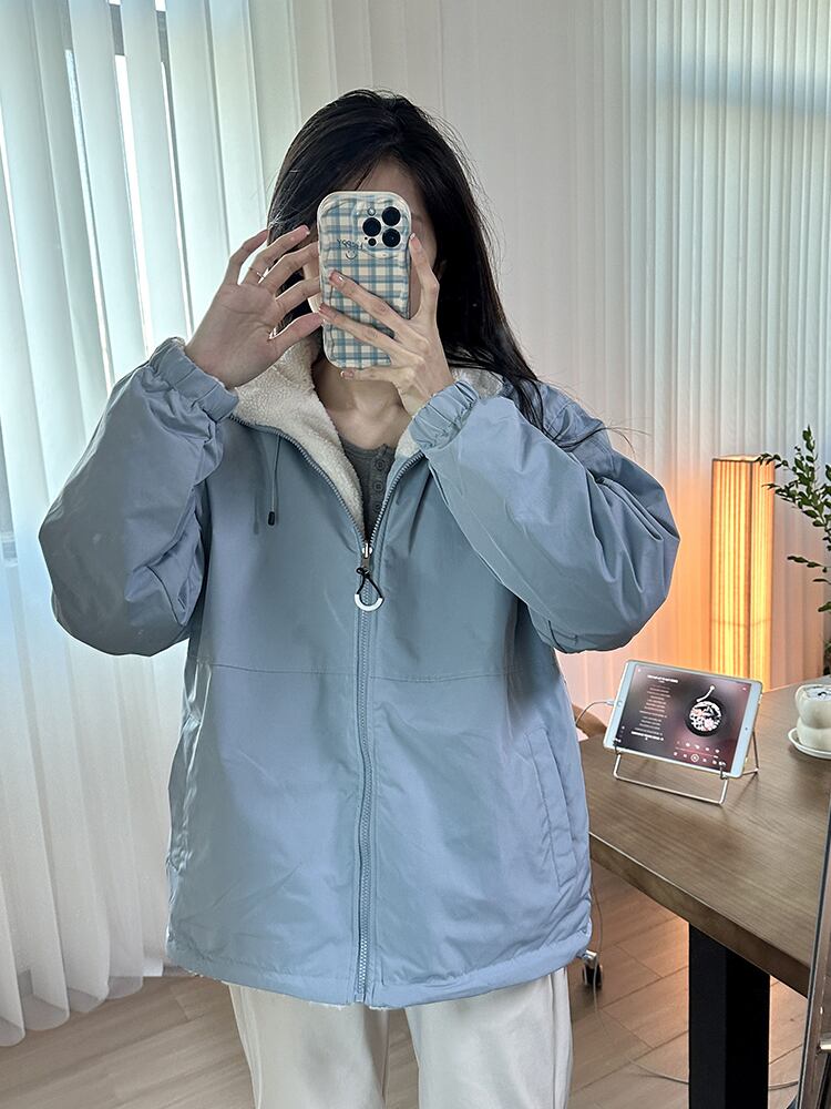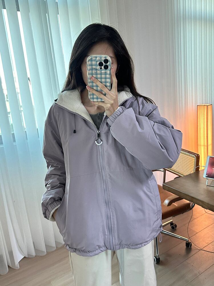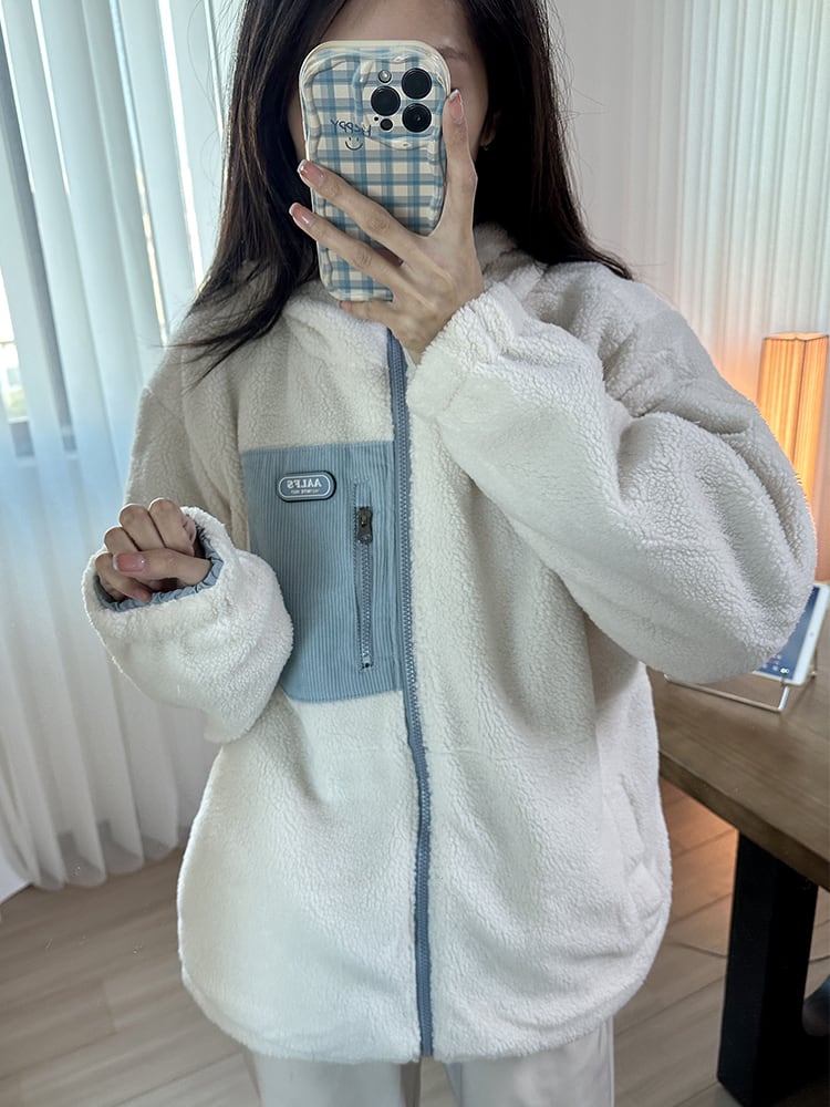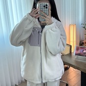 羊のような立体感が可愛いボア仕立てで、バイカラーの配色が映えるふんわりと可愛いジップアップブルゾンです。