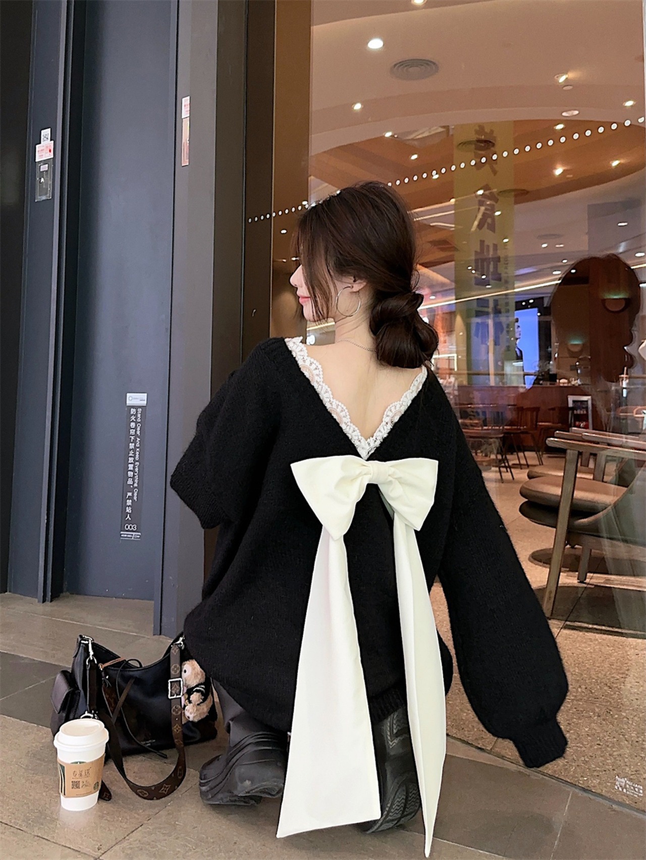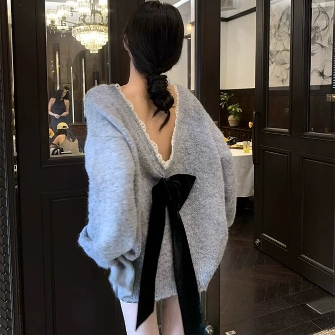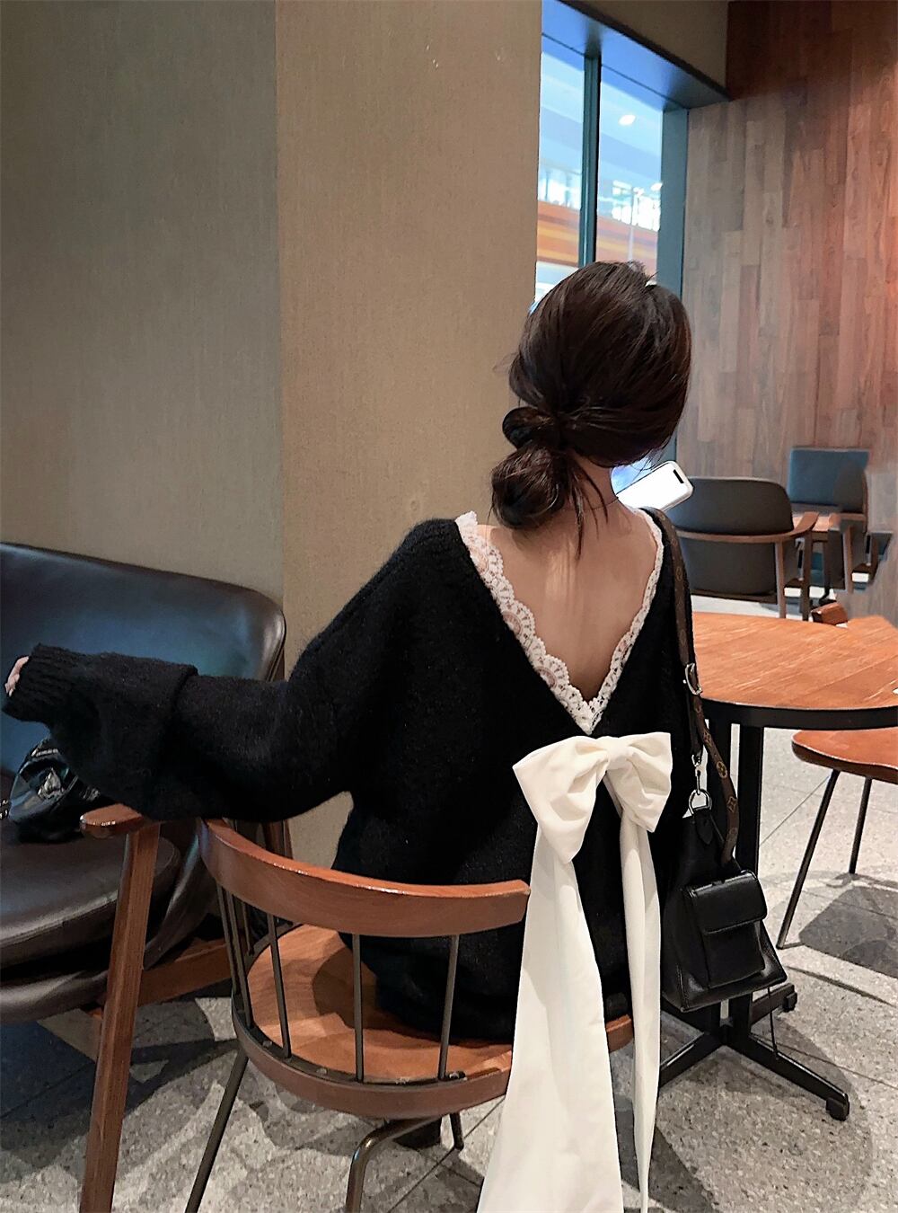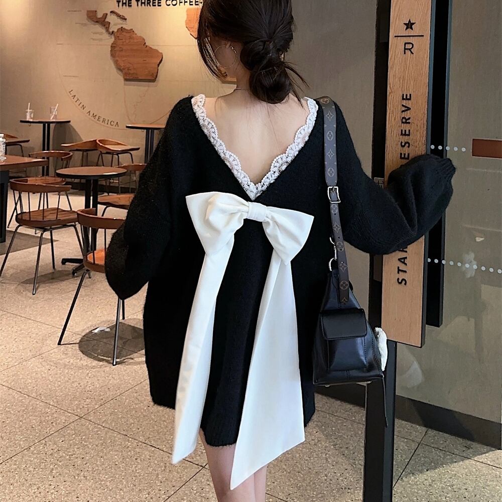 ビッグリボンがとちらりと見えるレースがデコルテを周りを華やかに飾る、バックオープンデザインが上品なビッグシルエットセーターです。