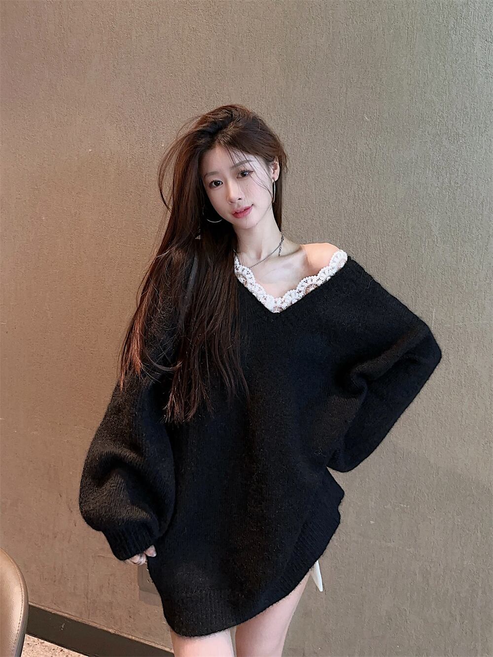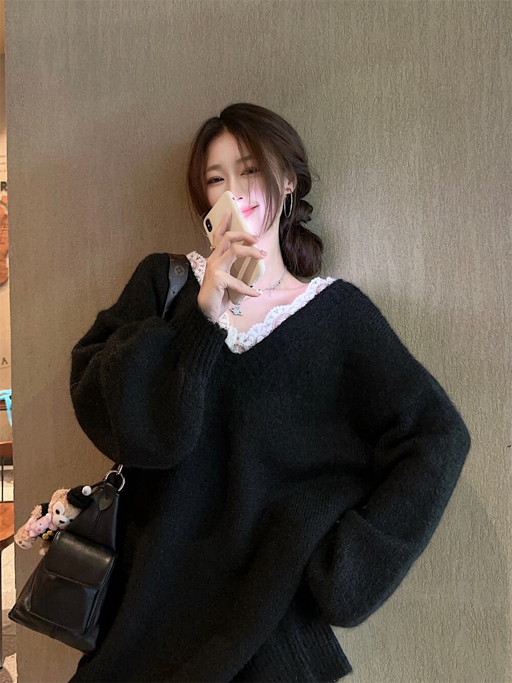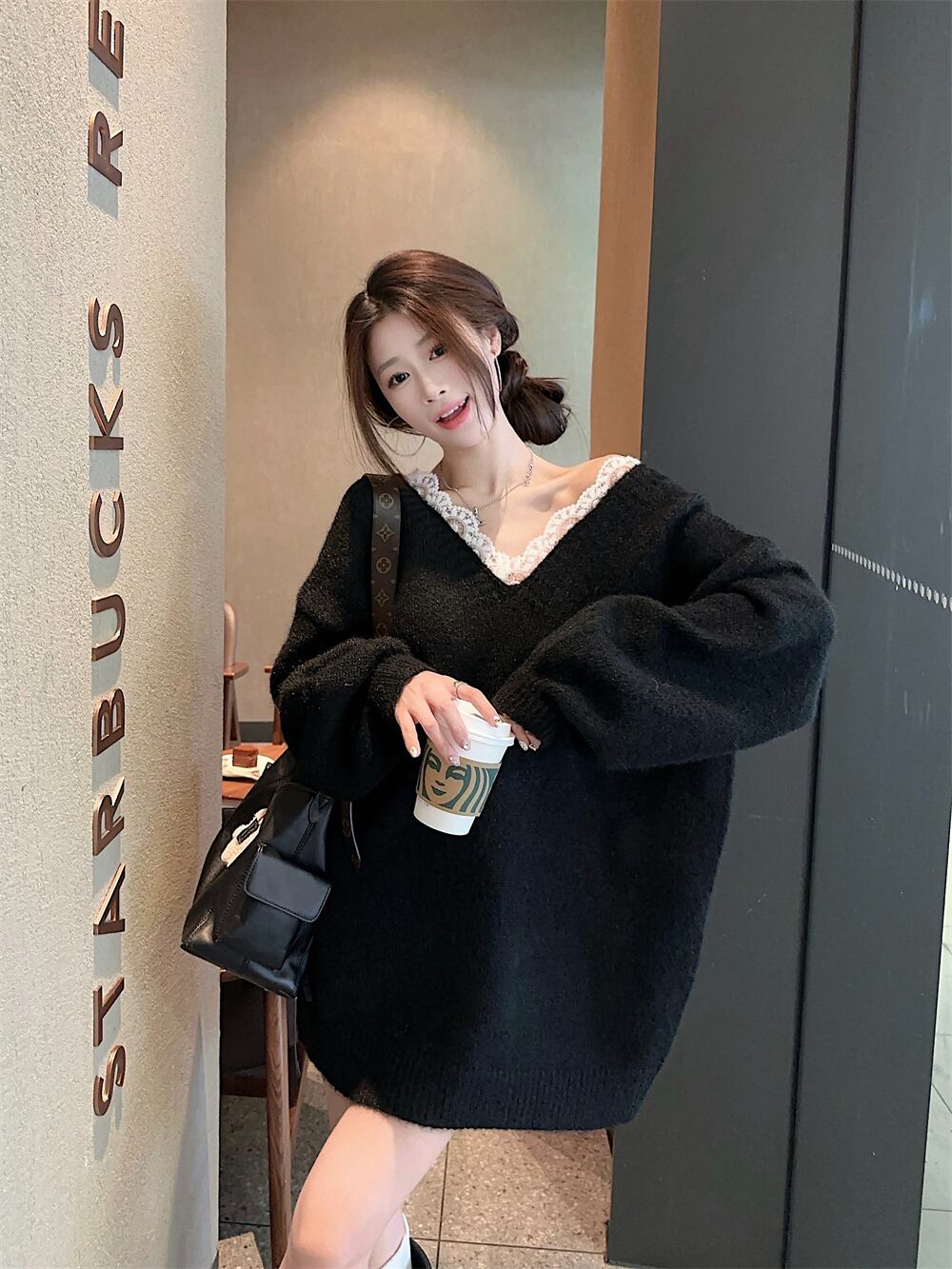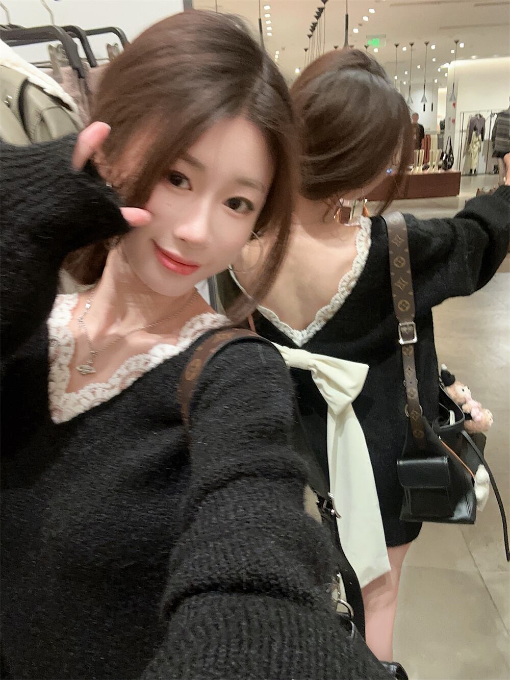 ビッグリボンがとちらりと見えるレースがデコルテを周りを華やかに飾る、バックオープンデザインが上品なビッグシルエットセーターです。