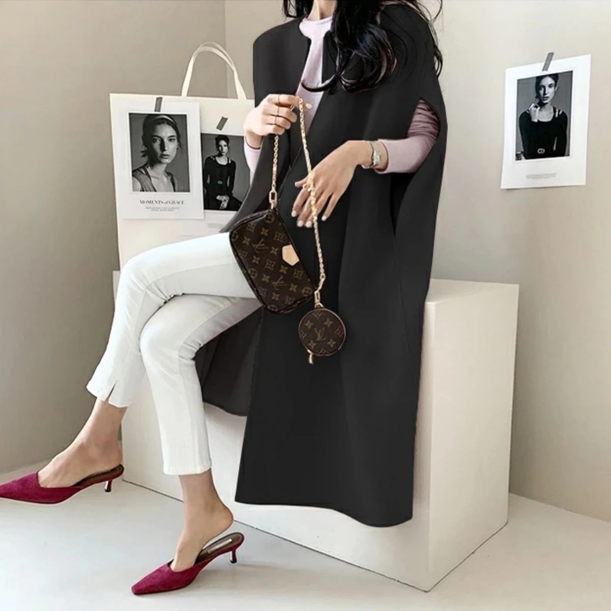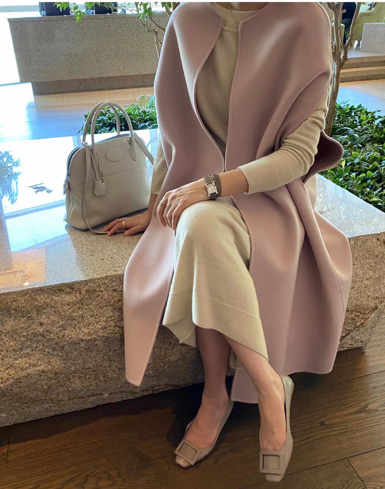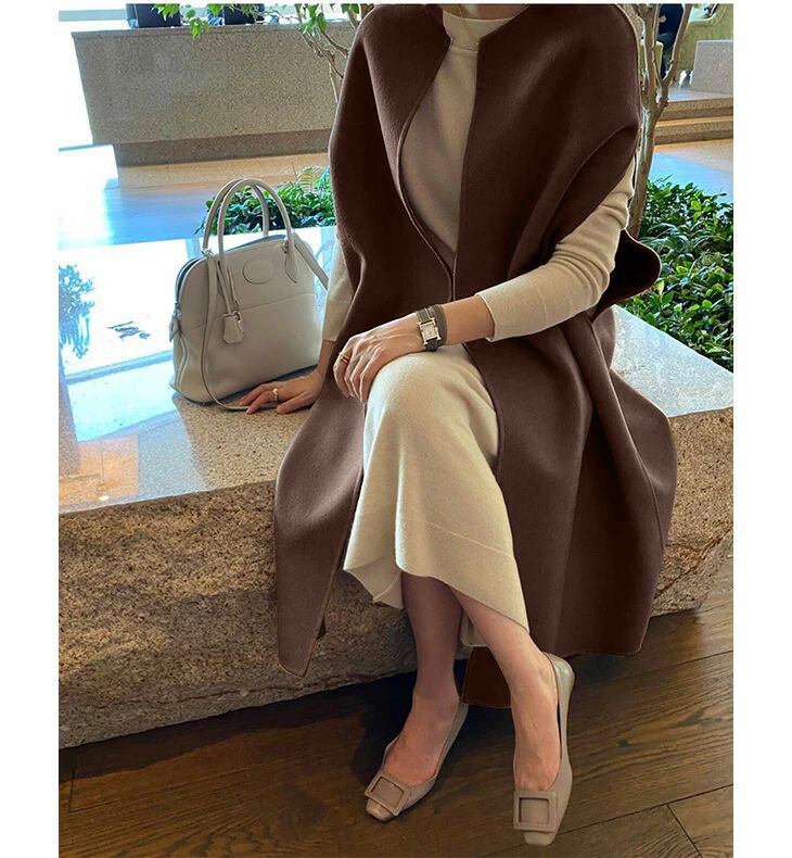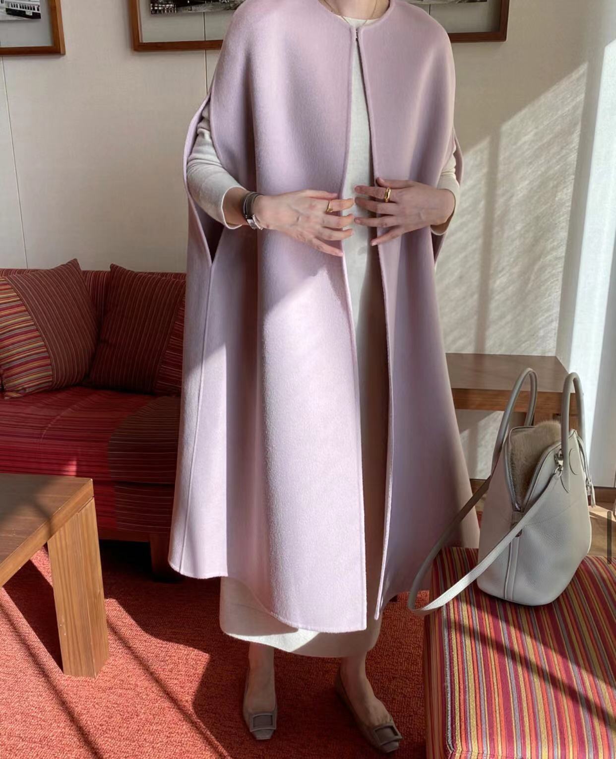 すっきりとしたクルーネックが洗練されたケープタイプのノーカラーコートです。